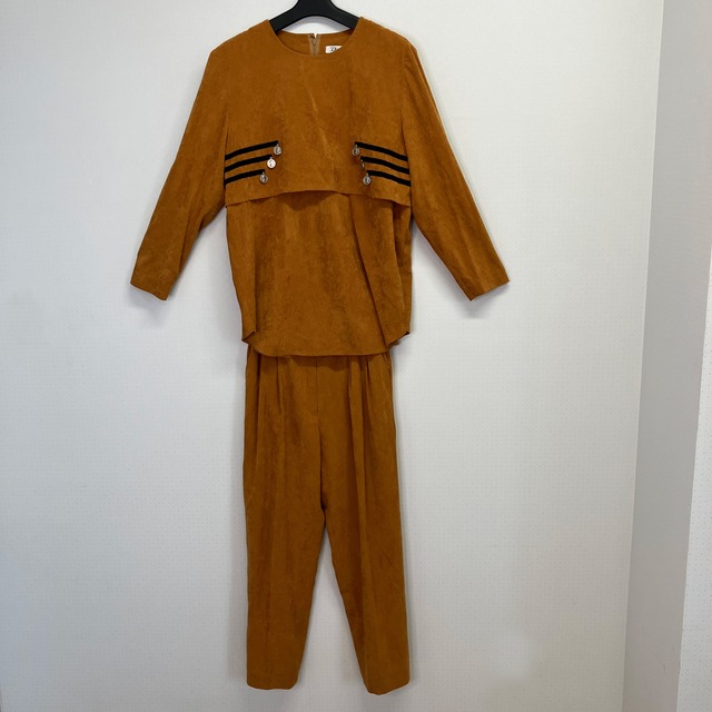 管理番号:Y10-018,Y10-042#てまいらずアパレル商品一覧 【商品名】 D'azur ダジュール スエード調 ブラウス&パンツ セットアップ キャメル 9R/9 【商品概要】 D'azur(ダジュール)の、スエード調生地を使用したレトロで上品なセットアップです。 温かみのあるキャメル/テラコッタカラーで、秋冬の装いにぴったりです。 ブラウスとパンツを合わせるだけで、統一感のあるクラシカルなコーディネートが完成します。 【ブラウス(品番: 40363 / サイズ: 9R)】 長袖のプルオーバーブラウスです。胸元には黒のラインとシルバーのコインチャームのような飾りが施されており、個性的で華やかなデザインです。 後ろファスナーで着脱します。 【パンツ(品番: 40364 / サイズ: 9)】 トップスと同素材・同色のスエード調パンツです。 裏地付きで、ウエストはサイドにゴムが入っているため、楽に着用できます。 【ブランド名】 D'azur(ダジュール) 【サイズ】 トップス:9R (Mサイズ相当) パンツ:9 (Mサイズ相当) 【寸法(cm)】 【トップス(9R)】 着丈: 67 身幅: 53 ×2 肩幅: 42 袖丈: 53 袖口: 10 裾幅: 48 【パンツ(9)】 着丈 88 ウエスト 30 ×2 (サイドゴム) 股上 22 股下 68 わたり幅 25 裾幅 16 ヒップ 45×2 ※素人の採寸のため、誤差が生じる場合がございます。 必ずお手持ちの服と比較してご検討ください。 【注意事項】 シミ/汚れ: なし 破損: なし 商品タグ: なし ※状態は写真を見てご判断ください。 ※中古品、またヴィンテージ感のあるデザインであることをご理解の上、ご購入をお願いいたします。