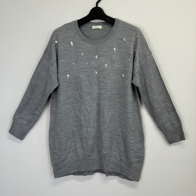 管理番号:Y10-021#てまいらずアパレル商品一覧 【商品名】 earth music&ecology (アースミュージック&エコロジー) ビジュー付き ロングニット Fサイズ 【商品概要】 ライトグレーのクルーネックニットです。アクリル100%の柔らかい素材で、ゆったりとしたシルエットで着用できるロング丈になっています。 胸元から肩にかけてビジューやパールが散りばめられた装飾が施されており、シンプルながらも華やかな印象です。 袖丈は長袖ですが、ドロップショルダーと相まってリラックス感のある着心地です。 デニムと合わせたカジュアルスタイルや、スカートと合わせたフェミニンなコーディネートにもおすすめです。 【ブランド名】 earth music&ecology Natural Label (アースミュージック&エコロジー ナチュラルレーベル) 【サイズ】 F (フリーサイズ) 【寸法(cm)】 着丈: 72 身幅: 50×2 肩幅: 59 袖丈: 43 袖口: 9 裾幅: 47 ※素人の採寸のため、若干の誤差が生じる場合がございます。 平置き採寸であることをご理解ください。 【商品の状態】 シミ/汚れ: なし 破損: なし 商品タグ: なし <特記事項> サイズ: F (フリーサイズ) 品質表示:アクリル 100% 中国製 洗濯表示は手洗い(液温30℃限度)可能です。タンブラー乾燥・漂白・ドライクリーニングは不可です。 装飾部分(ビジュー)にはアイロンを当てないようご注意ください。 素材の特性上、毛玉(ピリング)が発生しやすいことが注意書きにあります。 ※状態は写真や上記の特記事項を全てご確認の上、ご判断ください。 ※あくまで中古品としてご理解いただける方のご購入をお願いいたします。