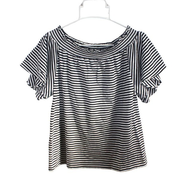 管理番号:TK-027254 #てまいらずアパレル商品一覧 【説明文】 ネイビー×ホワイトのボーダー柄が印象的な半袖トップスです。全体に細めのボーダーが入ったデザインで、カジュアルな雰囲気の中にもすっきりとした印象があります。ネック部分はシャーリング仕様になっており、ギャザーが寄ったデザインのため、首元に自然な立体感が出る作りです。肩から袖にかけては程よいゆとりがあり、締め付け感の少ない着用感が想定されます。 ブランドタグには「expression」との表記が確認できます。サイズ表記は「3」となっており、品質表示タグには素材として綿51%、レーヨン49%の記載があります。さらりとした質感が見られ、日常使いしやすい素材構成です。生産国については、品質表示タグに「中国製」と明記されています。 管理シート記載では、シミ・汚れ・破損はいずれも「なし」。タグは「あり」となっており、ブランドタグおよび品質表示タグの両方が確認できます。 ボーダー柄のためデニムやスカートなど幅広いボトムスと合わせやすく、1枚で着用しても、インナーとしても使いやすいアイテムです。全体の状態や縫製、シャーリング部分の仕様については、掲載画像にてご確認ください。 【サイズ】 3 レディースM相当。身幅は標準的ですが、肩幅はやや細めで着丈は短めのコンパクトなシルエットです。 【実寸サイズ(平置き・約)】 着丈:47cm 身幅:44cm 肩幅:34cm 袖丈:16cm 【商品状態】 シミ・汚れ:なし 破損:なし タグ:あり 【備考】 中国製/綿51%・レーヨン49%