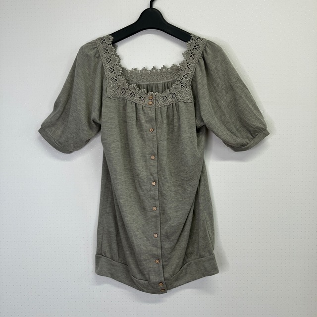 管理番号:Y10-108#てまいらずアパレル商品一覧 【商品名】 pink adobe ピンクアドベ レースネック スクエアネック カットソー チュニック グレー L 【商品概要】 pink adobe(ピンクアドベ)のレースネックカットソーです。 色は合わせやすい杢グレーまたはカーキがかったグレーです。 スクエアネックの周りには豪華なかぎ編みレース(レース部分:レーヨン100%)があしらわれ、胸元にはギャザーが施されています。 五分袖程度のパフスリーブと、裾と袖口が絞られたふんわりとしたシルエットがフェミニンな印象です。 フロントはウッド調のボタンで全開するデザインです。 本体はポリエステル65%、**レーヨン35%**のやわらかい素材で着心地も良いです。 【ブランド名】 pink adobe (ピンクアドベ) 【サイズ】 L 【寸法(cm)】 着丈: 57 身幅: 43 ×2 肩幅: 47 袖丈: 29 袖口: 12 裾幅: 37 ※素人の採寸のため、誤差が生じる場合がございます。 【注意事項】 シミ/汚れ: なし 破損: なし 商品タグ: なし ※状態は写真を見てご判断ください。 目立った傷や汚れはありませんが、中古品にご理解いただける方のみご購入をお願いいたします。 ※摩擦により他のものへ色移りしたり、部分的に色落ちしたりすることがあります。 ※つけ置き洗いや濡れたままの放置、濡れた状態での摩擦は禁止です。 ※お洗濯は「手洗い30℃」で、揉み洗いせず短時間で行い、単独洗いで十分にすすいでください。生成・淡色系は無蛍光洗剤を使用してください。レース付きのスクエアネックデザインで、木製ボタンが特徴のグレーのチュニックです。 - 色: グレー - デザイン: レース付きスクエアネック - ボタン: 木製ボタン ご覧いただきありがとうございます。
