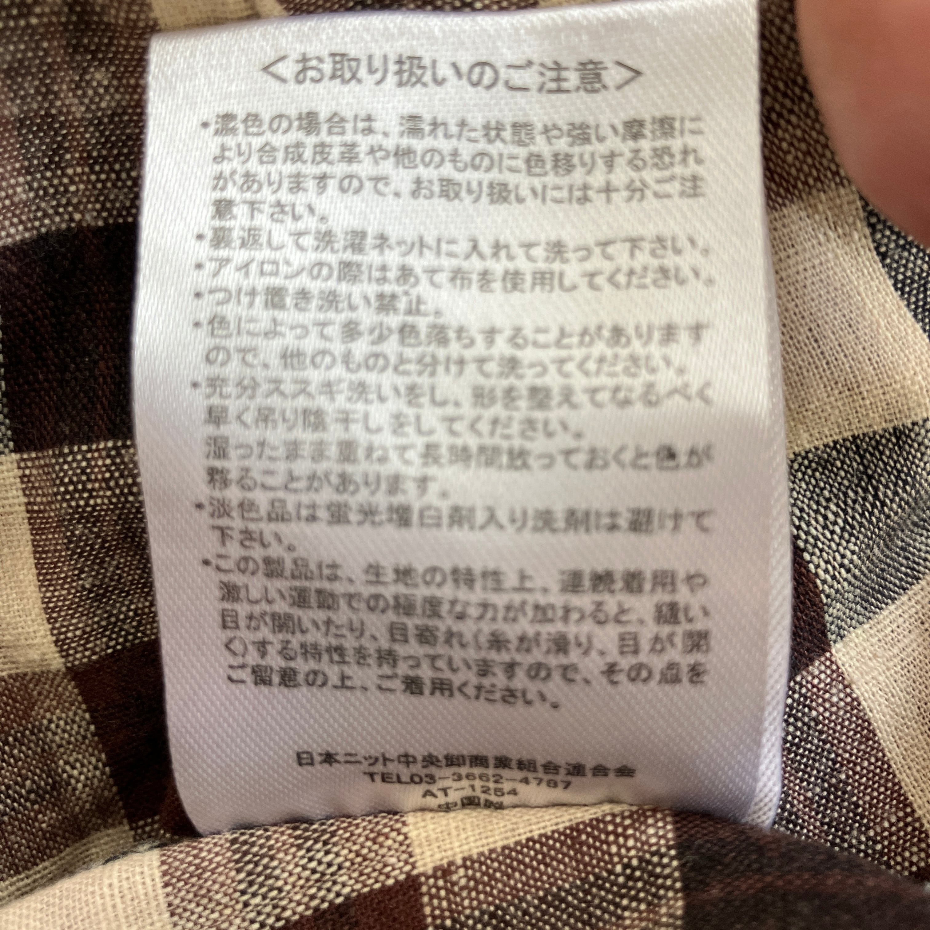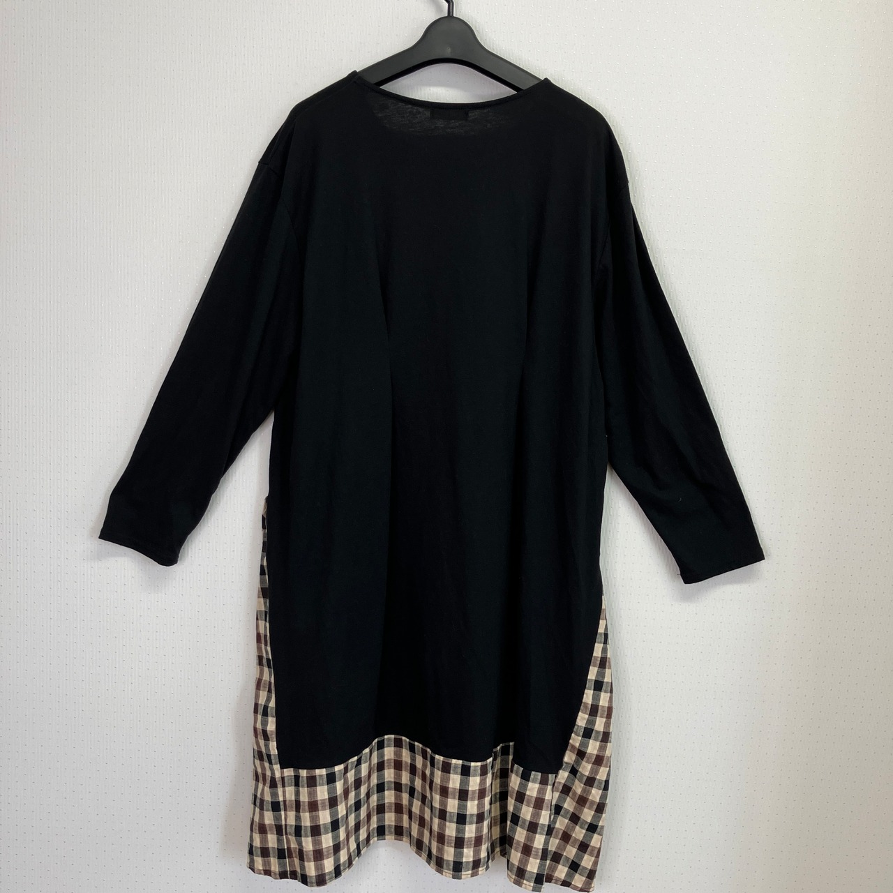 本体はベーシックなブラックのカットソー素材で、裾と両サイドにブラウン系チェック柄の布帛(ふはく)生地がドッキングされています。サイドには長めのリボンが付いており、結ぶことでシルエットに変化をつけられるデザインです。
