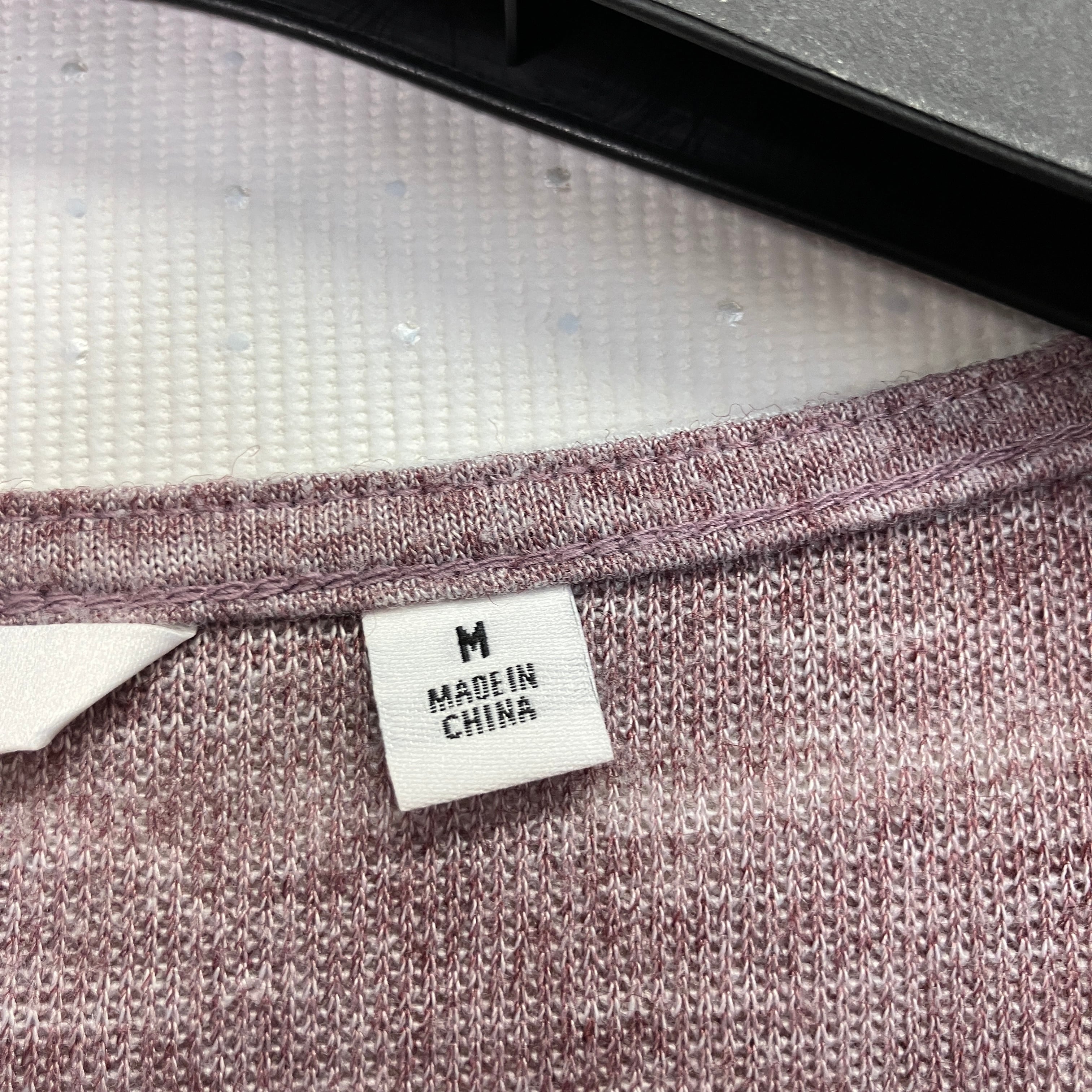 ※状態は写真を見てご判断ください。パープルとホワイトのストライプデザインの五分袖Tシャツ、サイズM。