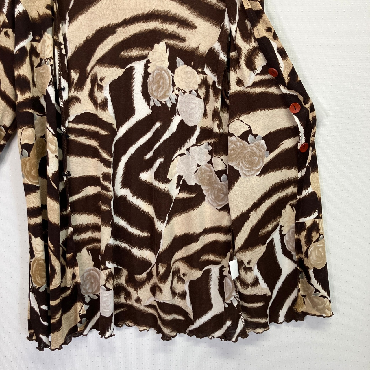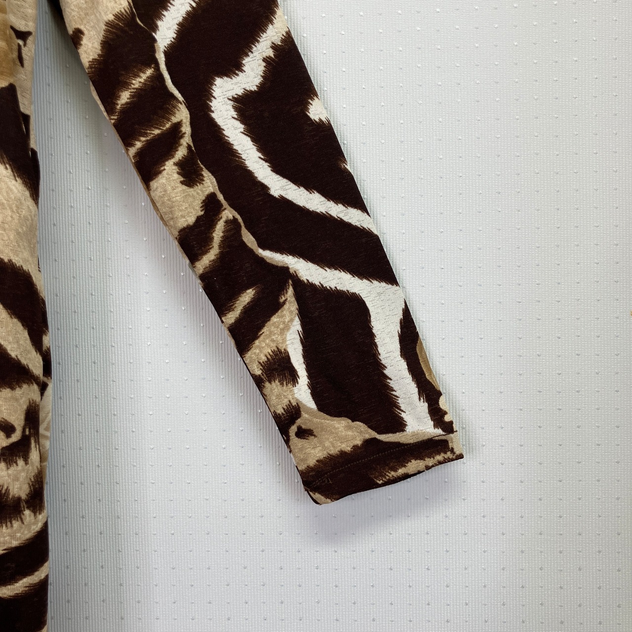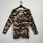 ブラウン系のアニマル柄(ゼブラやタイガーのような柄)に、ベージュやオフホワイト系のバラの花柄がプリントされたVネックカーディガンです。
