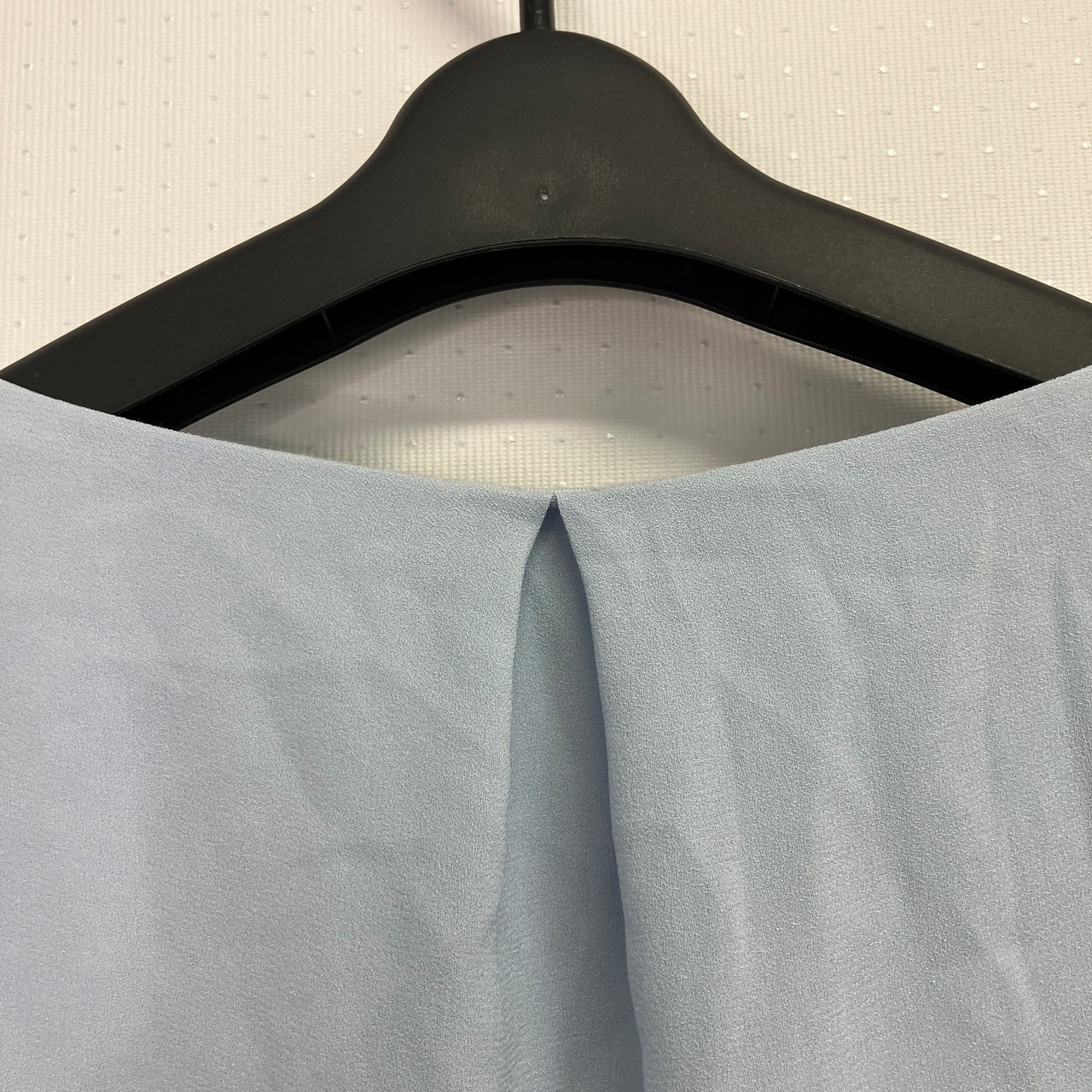 淡いブルー(水色)の上身頃はトリアセテート混の柔らかな生地でドレープ感があり、裾から見える白のインナー(ペチコート風)**が爽やかで上品な印象を与えます。