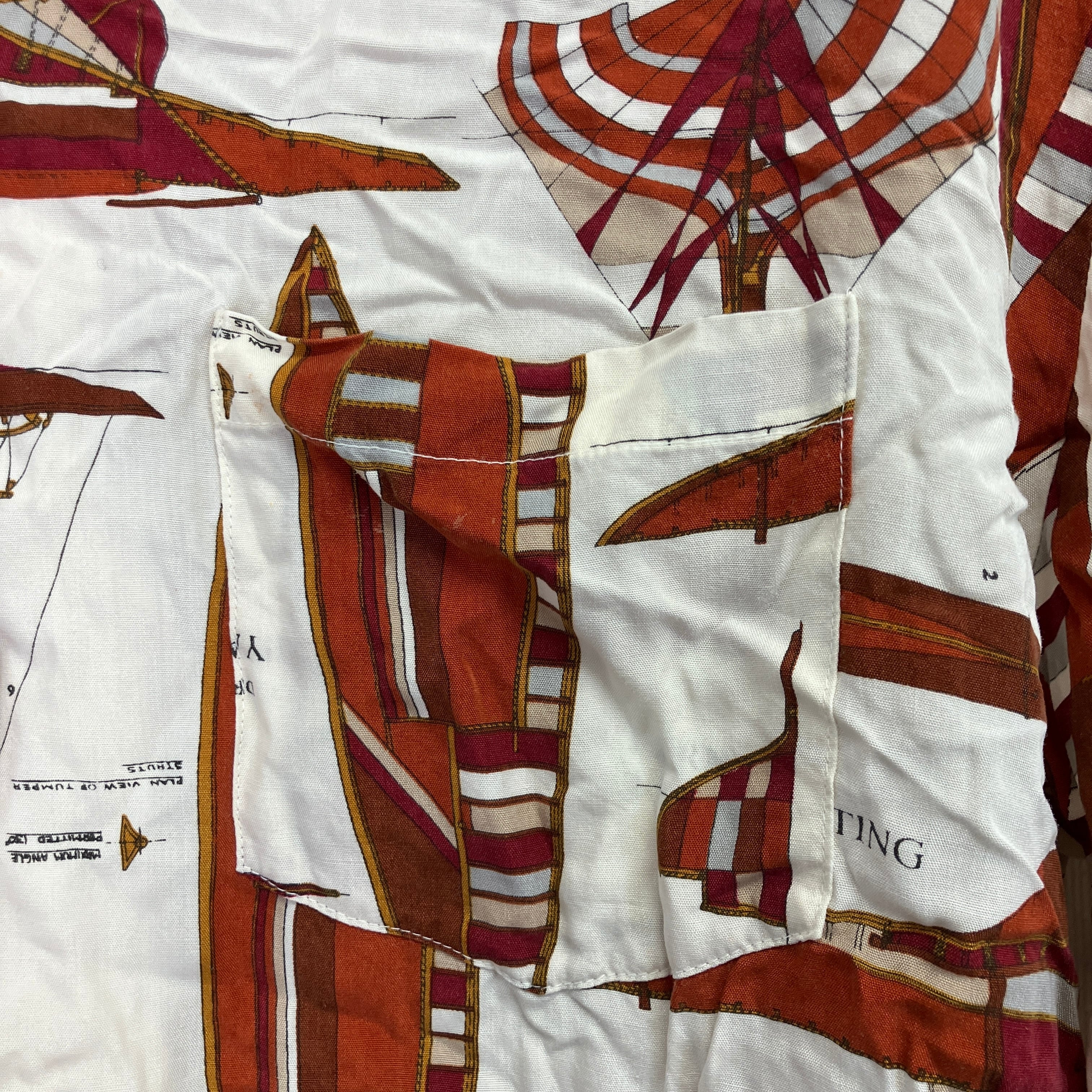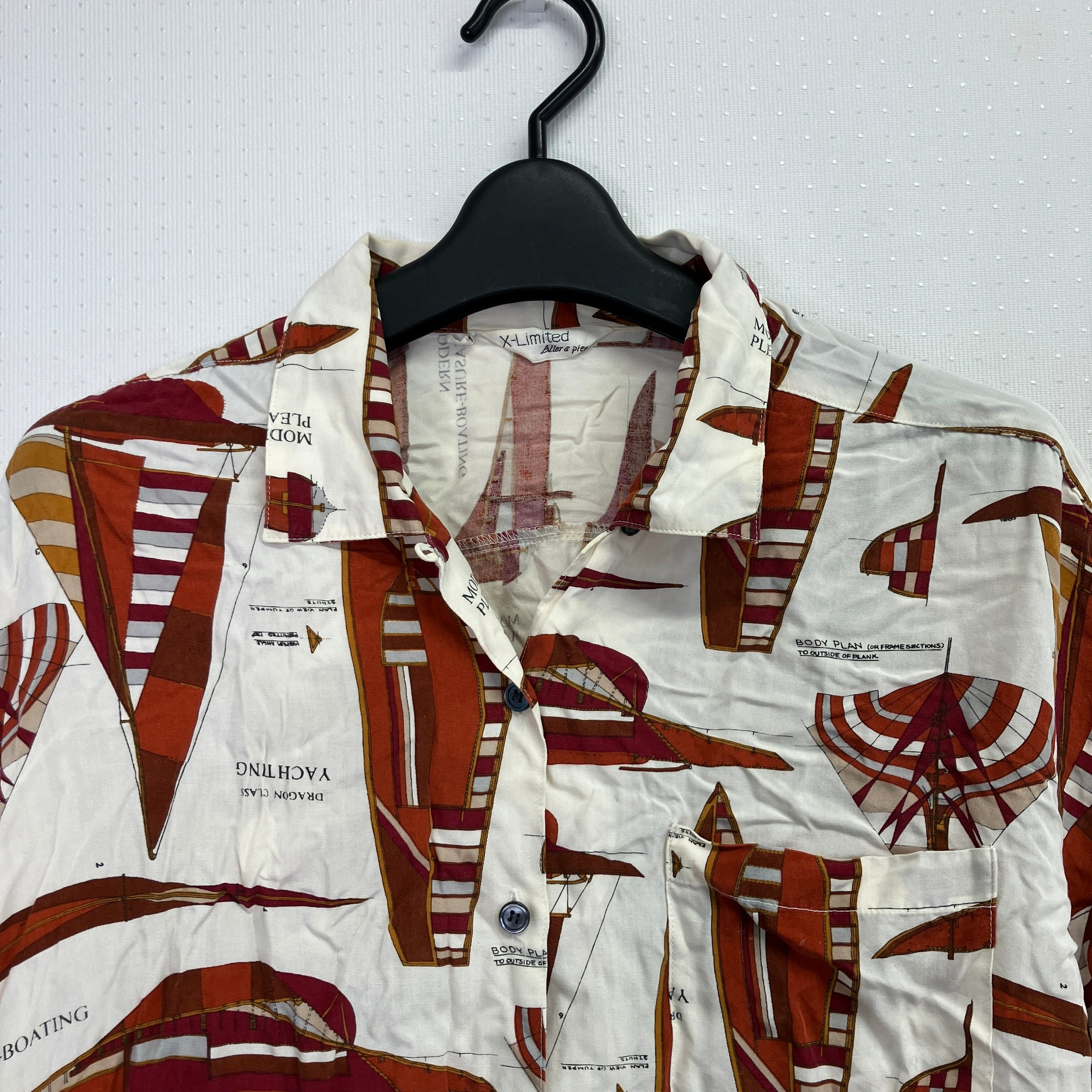 白地に赤や茶系のヨット(セイルボート)のデザインが全面にプリントされた、X-Limited Aller a pierの長袖シャツです。