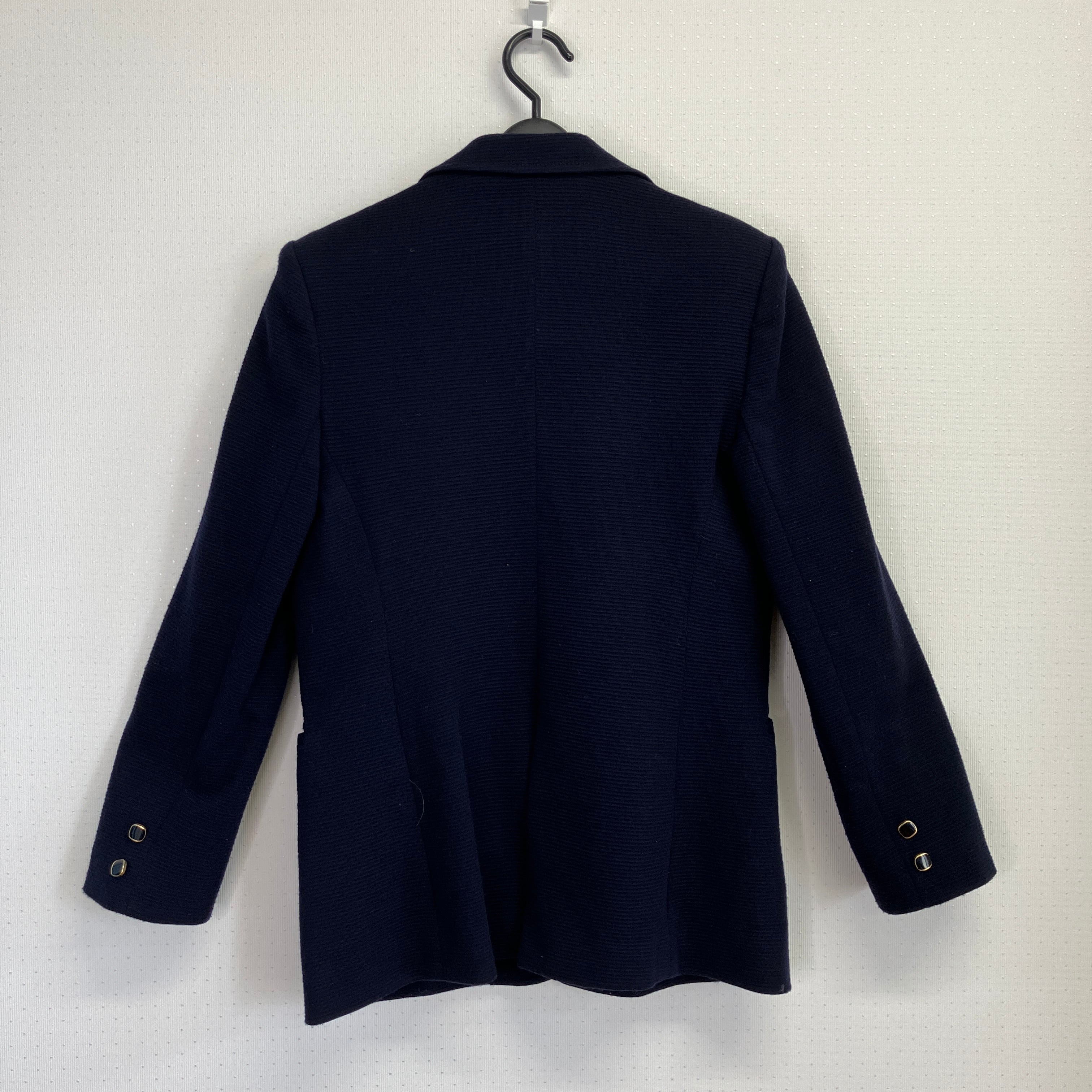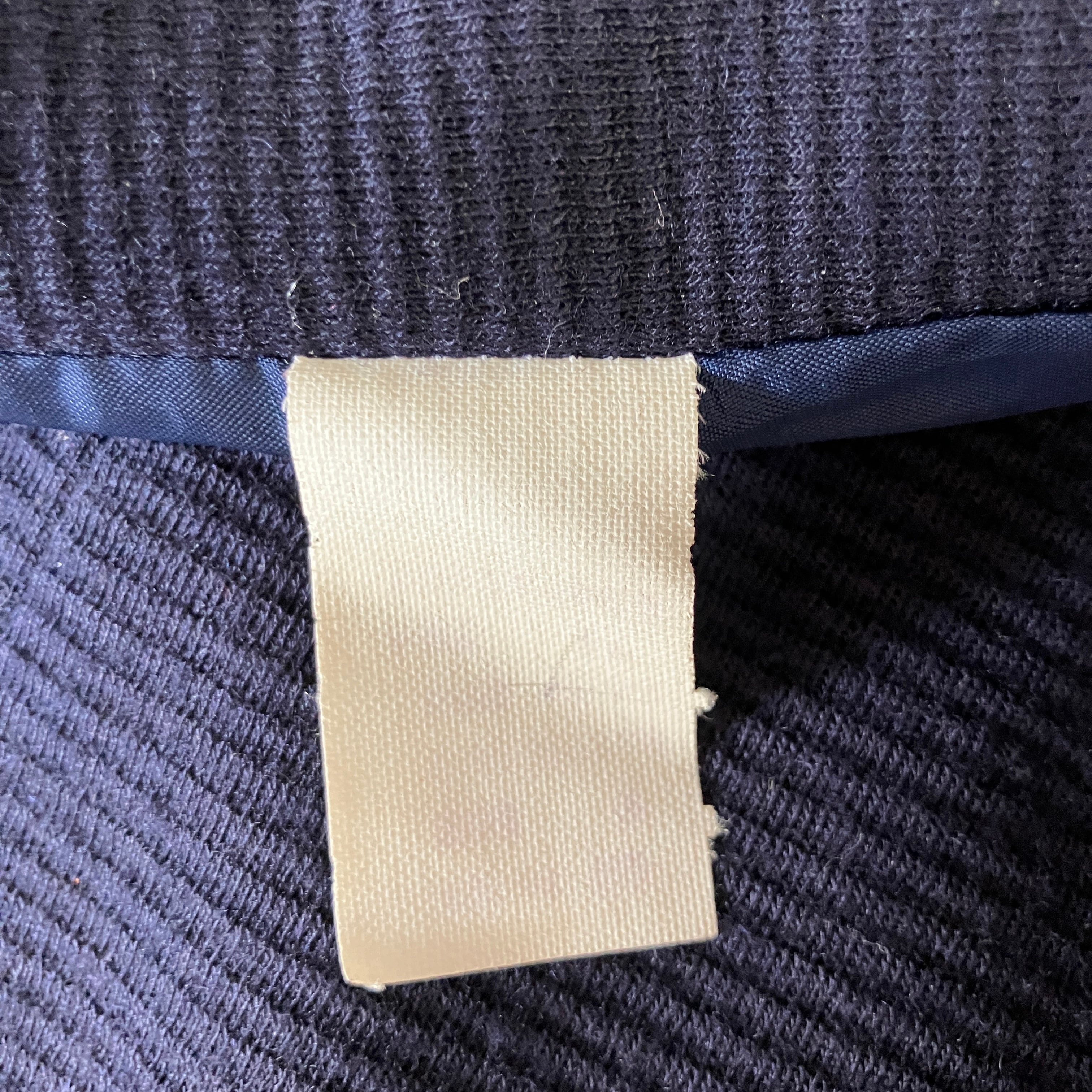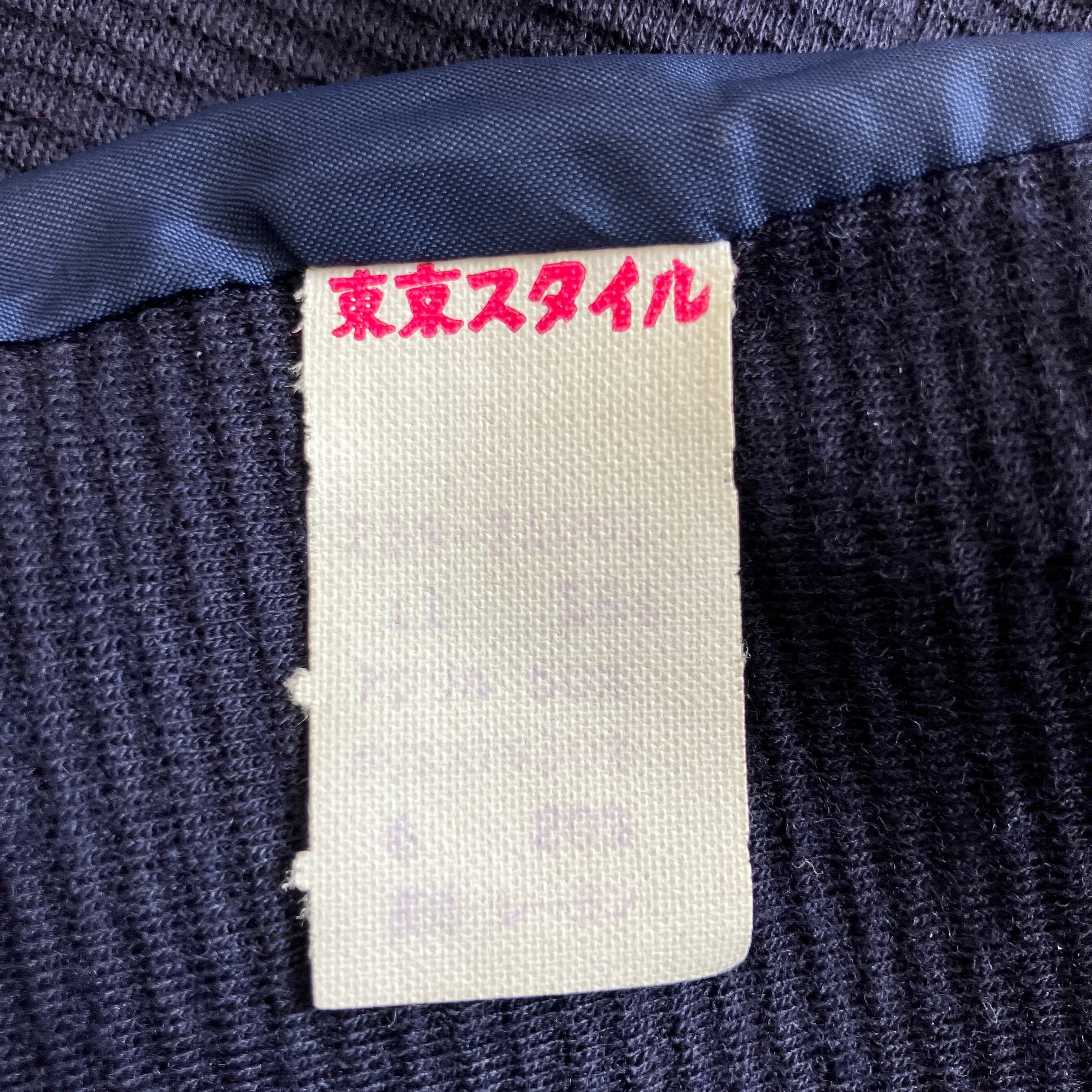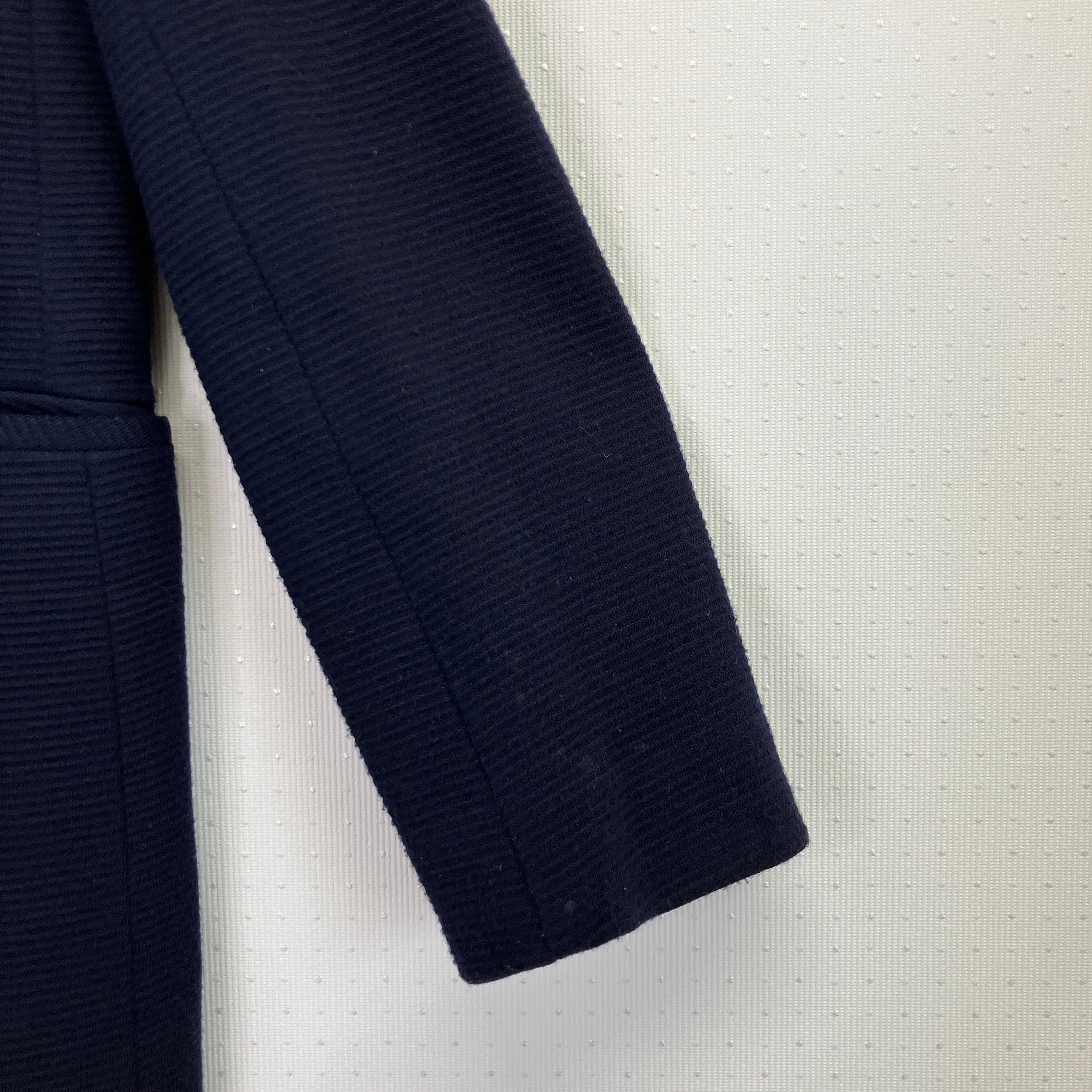 色は落ち着いたネイビー(濃紺)で、生地全体に細かなリブのような横畝(よこうね)があり、シンプルなデザインながらも表情豊かです。