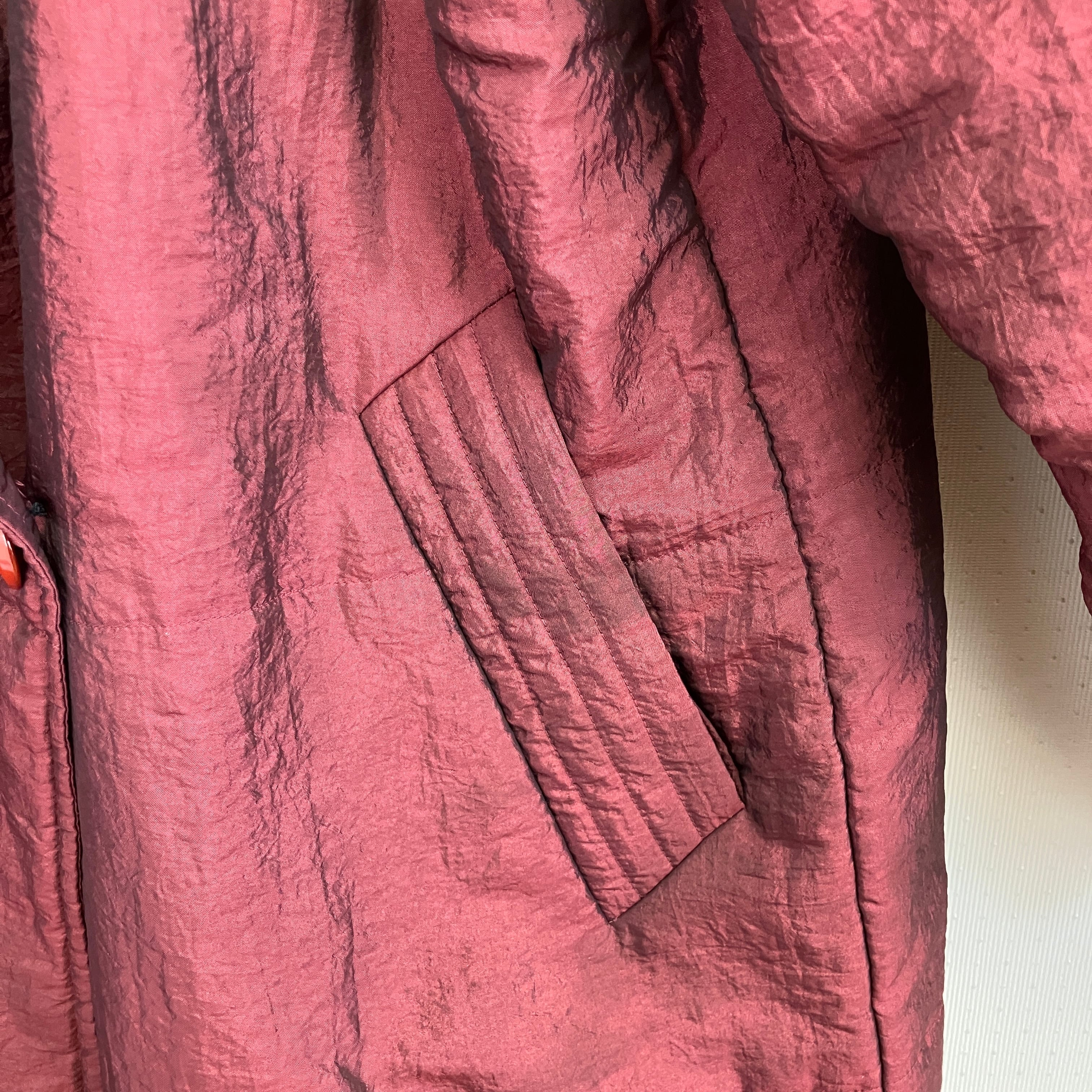 落ち着いたワインレッド(ボルドー系)の玉虫色の生地で、光沢があり高級感があります。