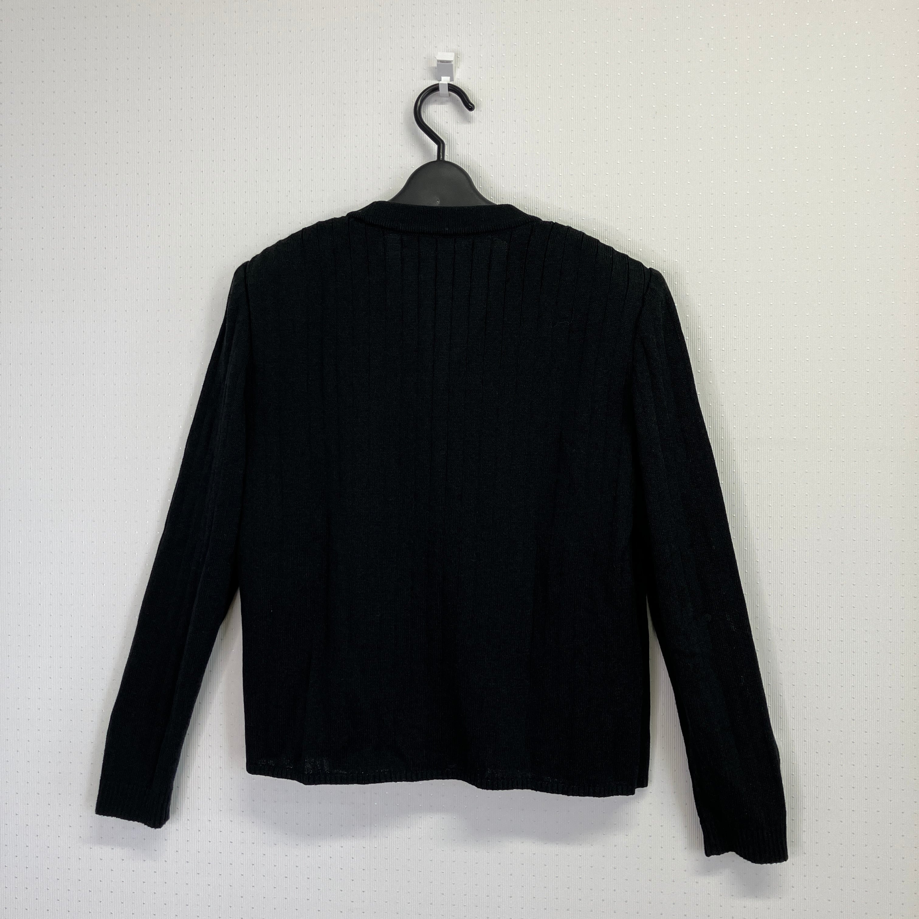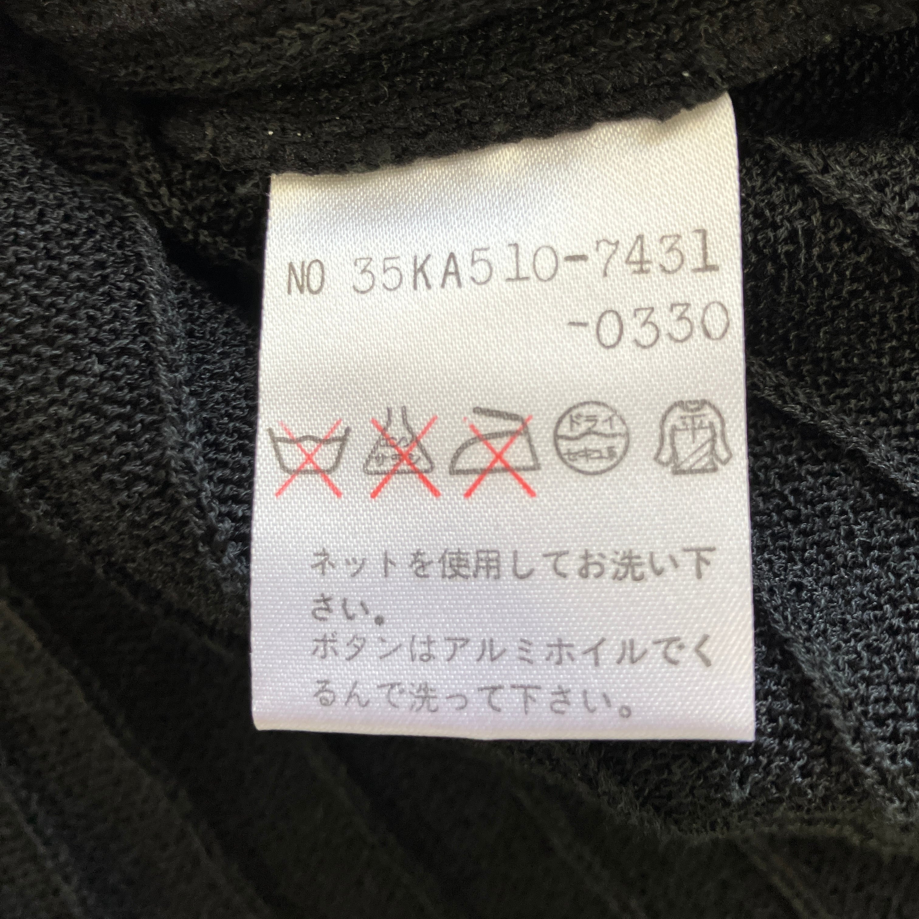 黒のVネックカーディガンです。リブのような凹凸のある編み地で、程よい透け感と落ち感のある素材が特徴です。