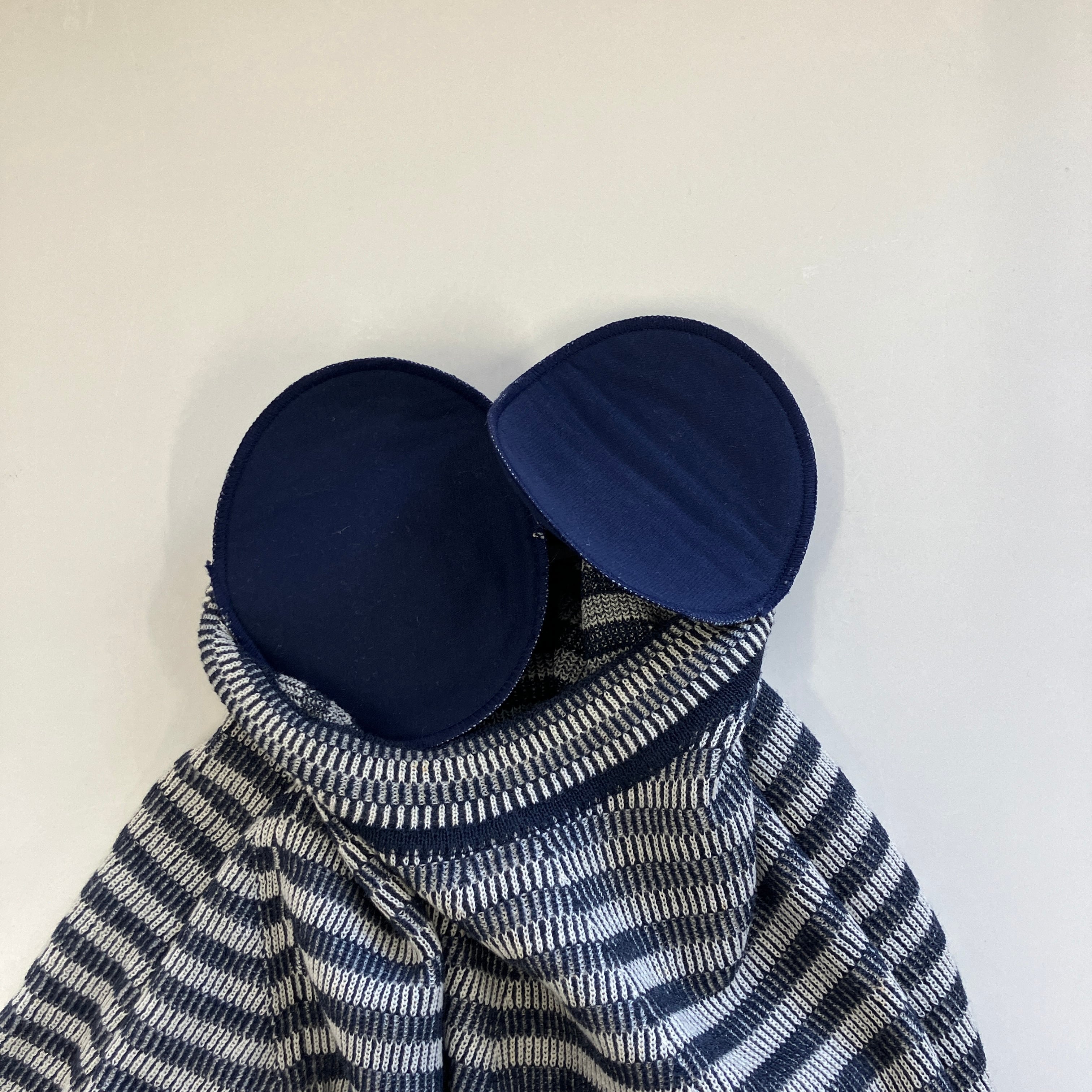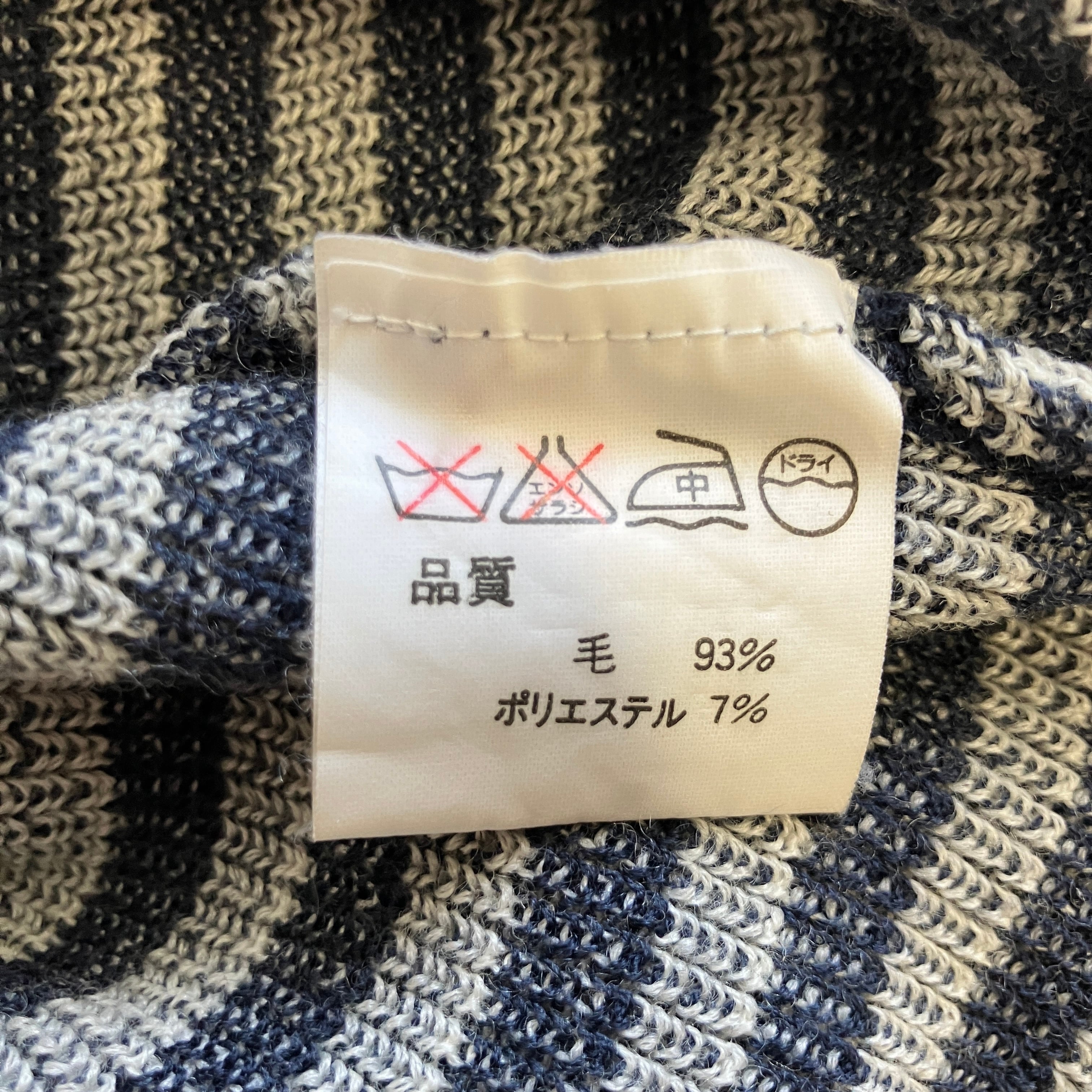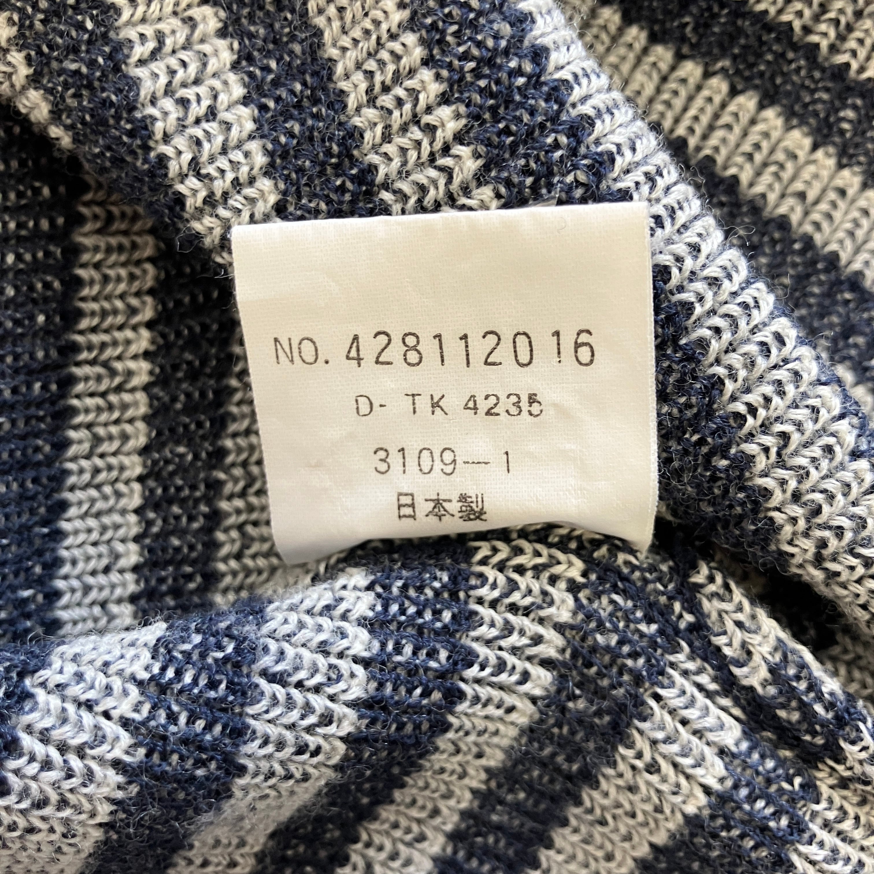 ネイビーとオフホワイト(またはグレー)のボーダー柄が特徴の半袖ニットプルオーバーです。