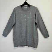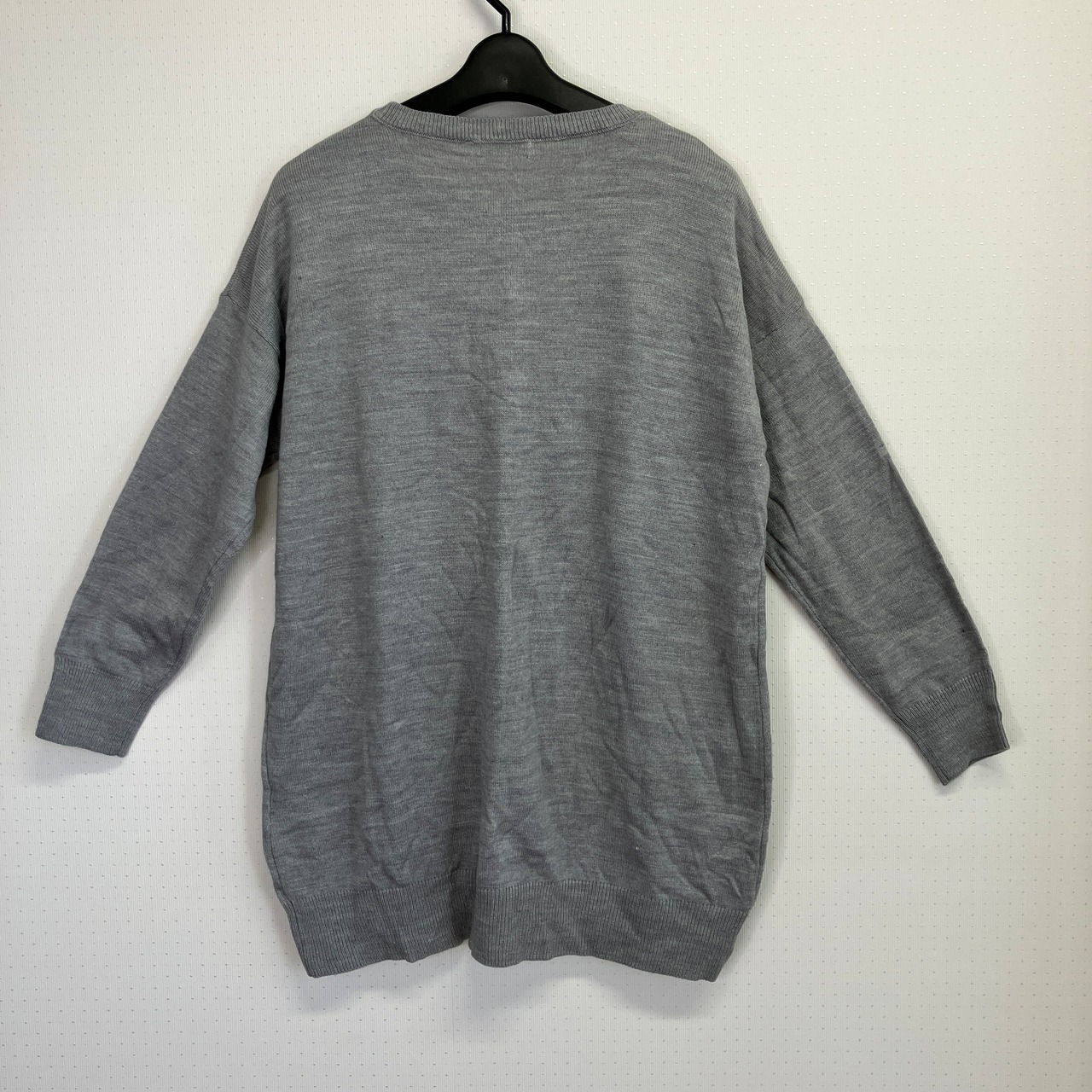 ライトグレーのクルーネックニットです。アクリル100%の柔らかい素材で、ゆったりとしたシルエットで着用できるロング丈になっています。