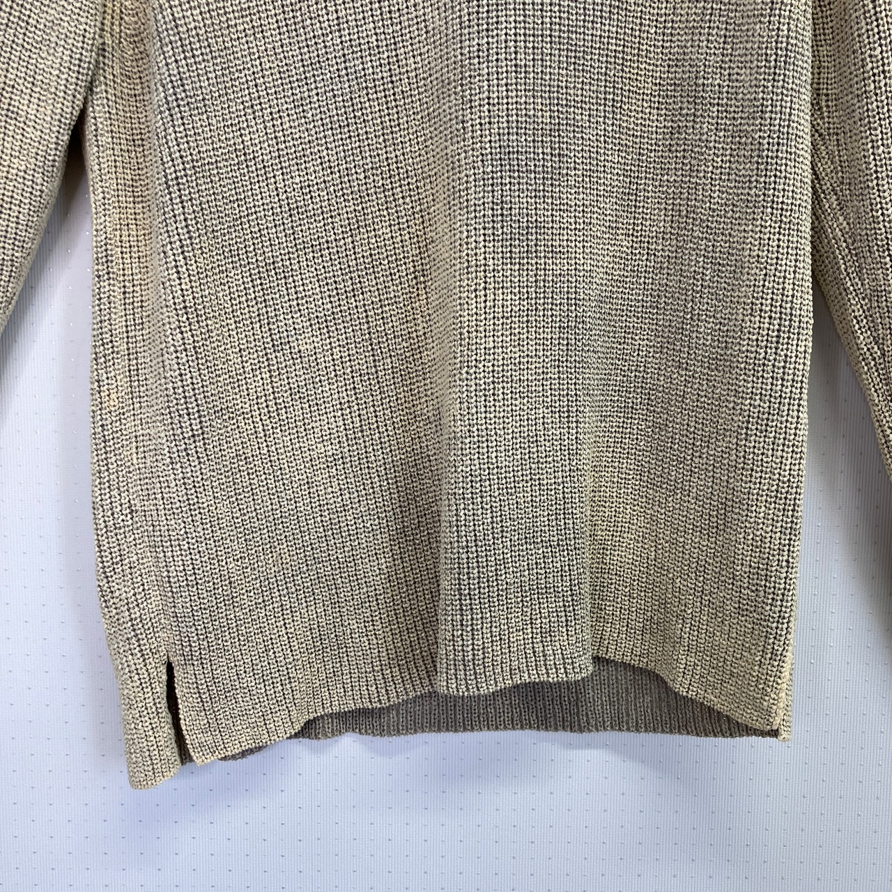 ベージュ〜ライトブラウン系のVネック長袖ニットです。