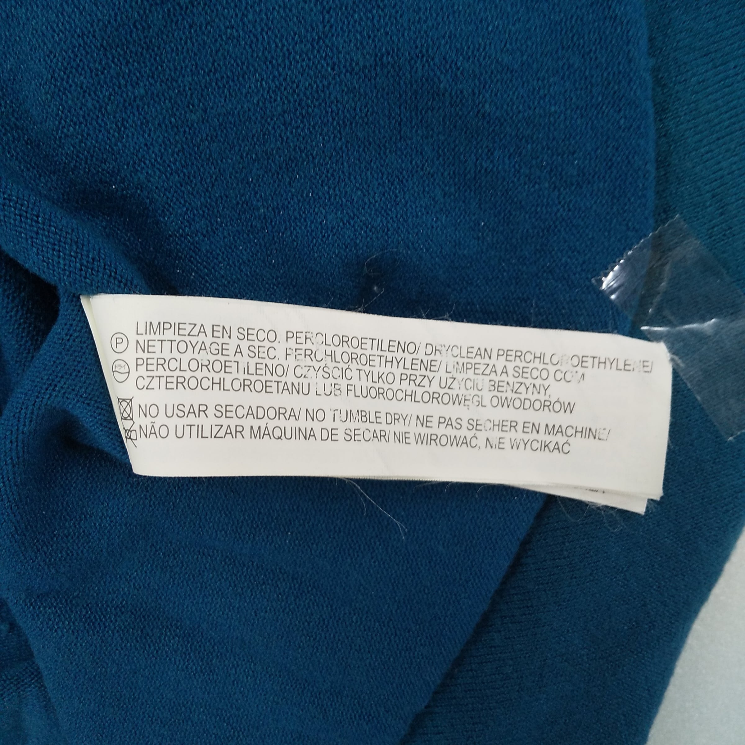 ティールカラーのZARA製長袖ニットワンピース、Vネックデザインでサイドポケット付き。