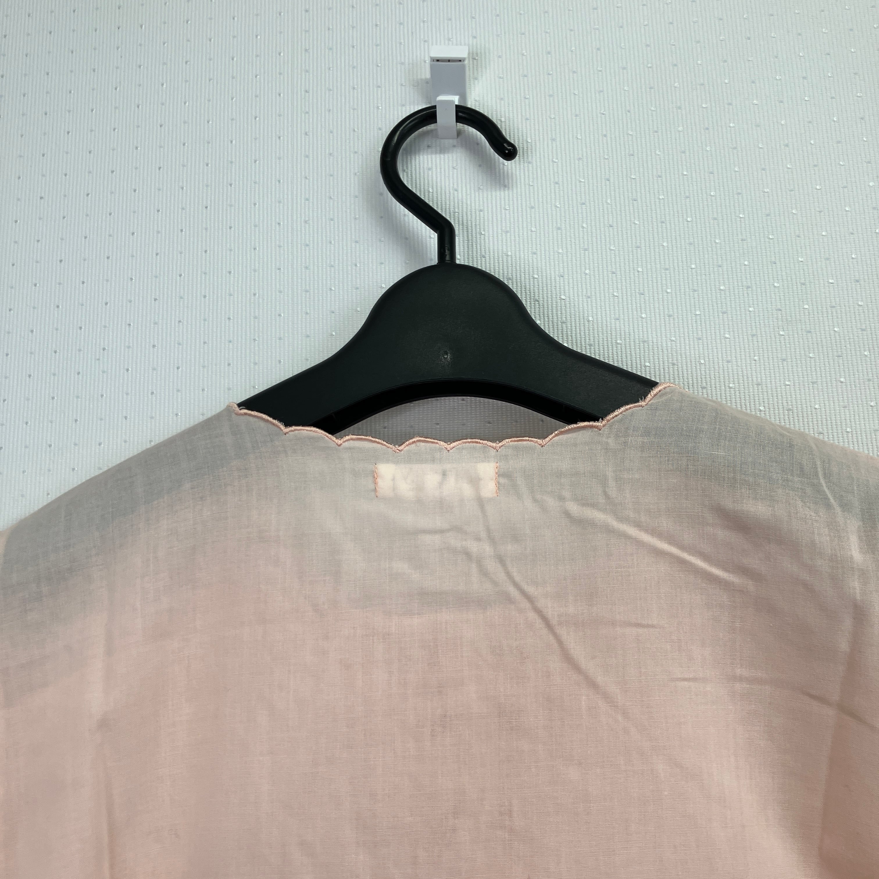 ※ご不明な点がございましたら、お気軽にお問い合わせください。刺繍デザインのピンク半袖ブラウス。