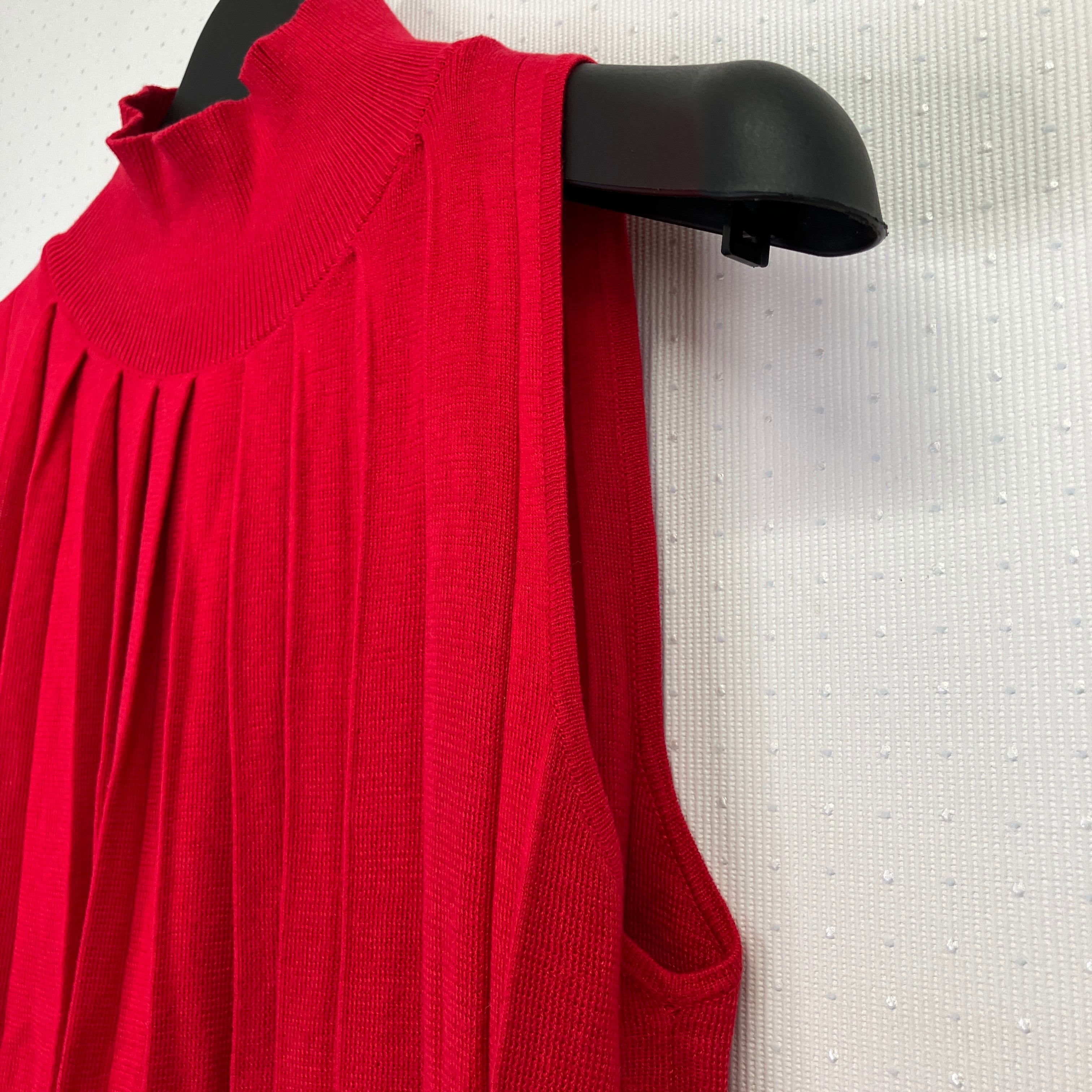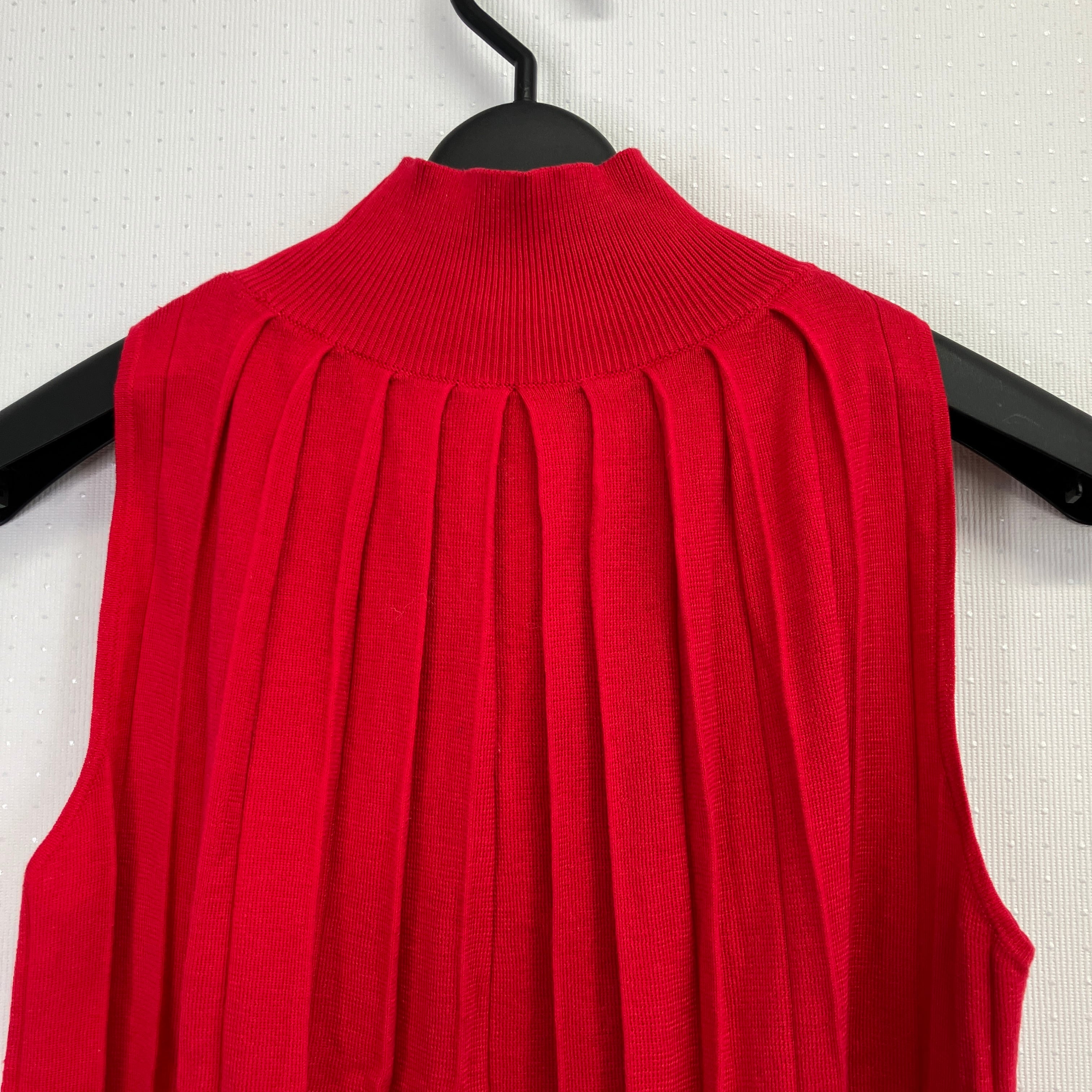 鮮やかな赤色のプリーツノースリーブトップス、ハイネックデザインでスタイリッシュ。