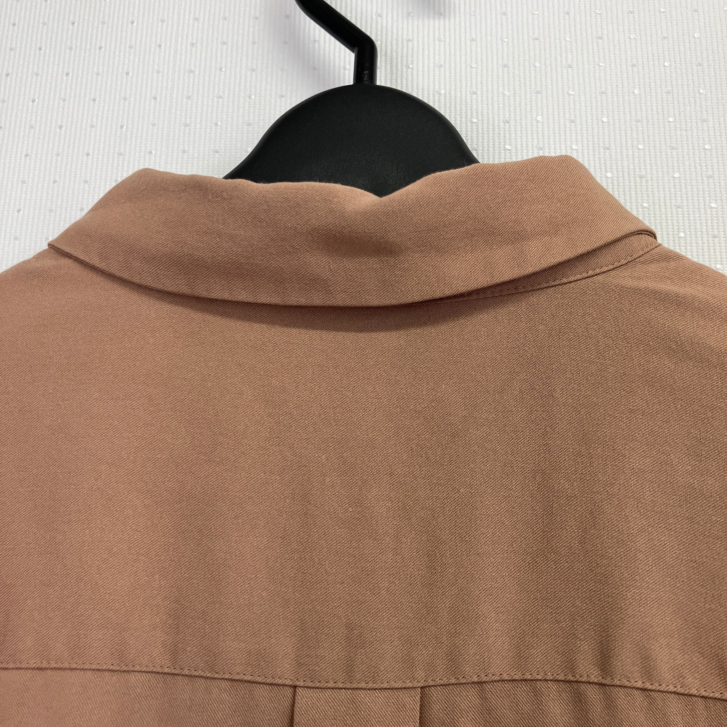 シンプルなブラウンの長袖ボタンシャツ。
