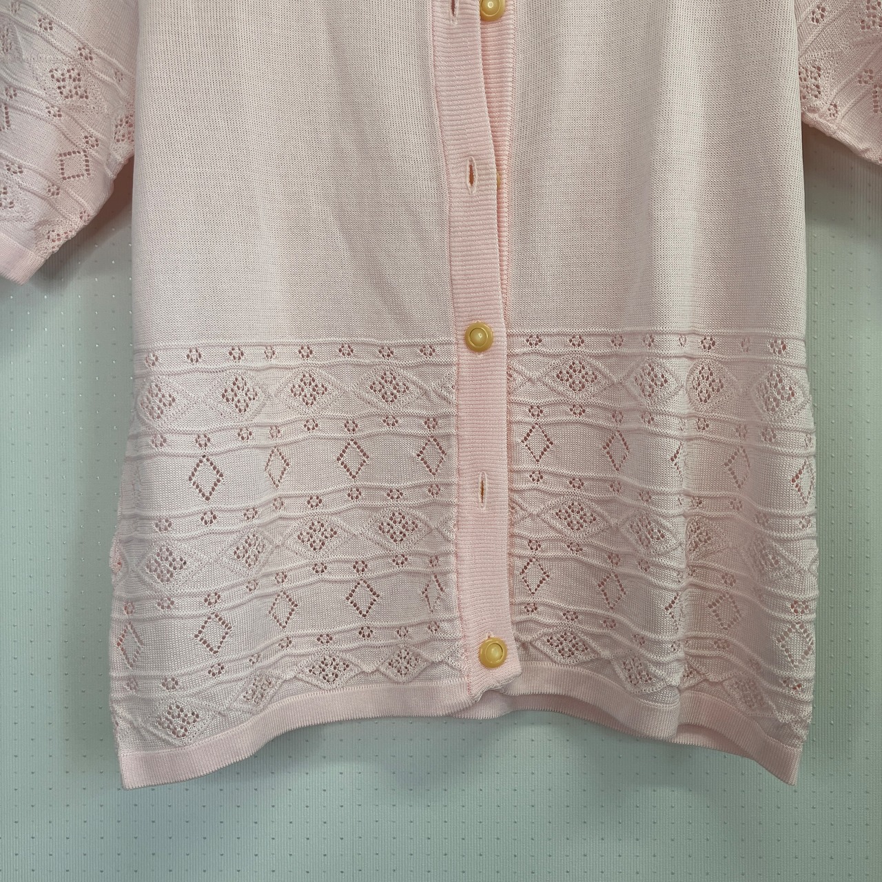 優しい淡いピンク色の、半袖ニットカーディガンです。