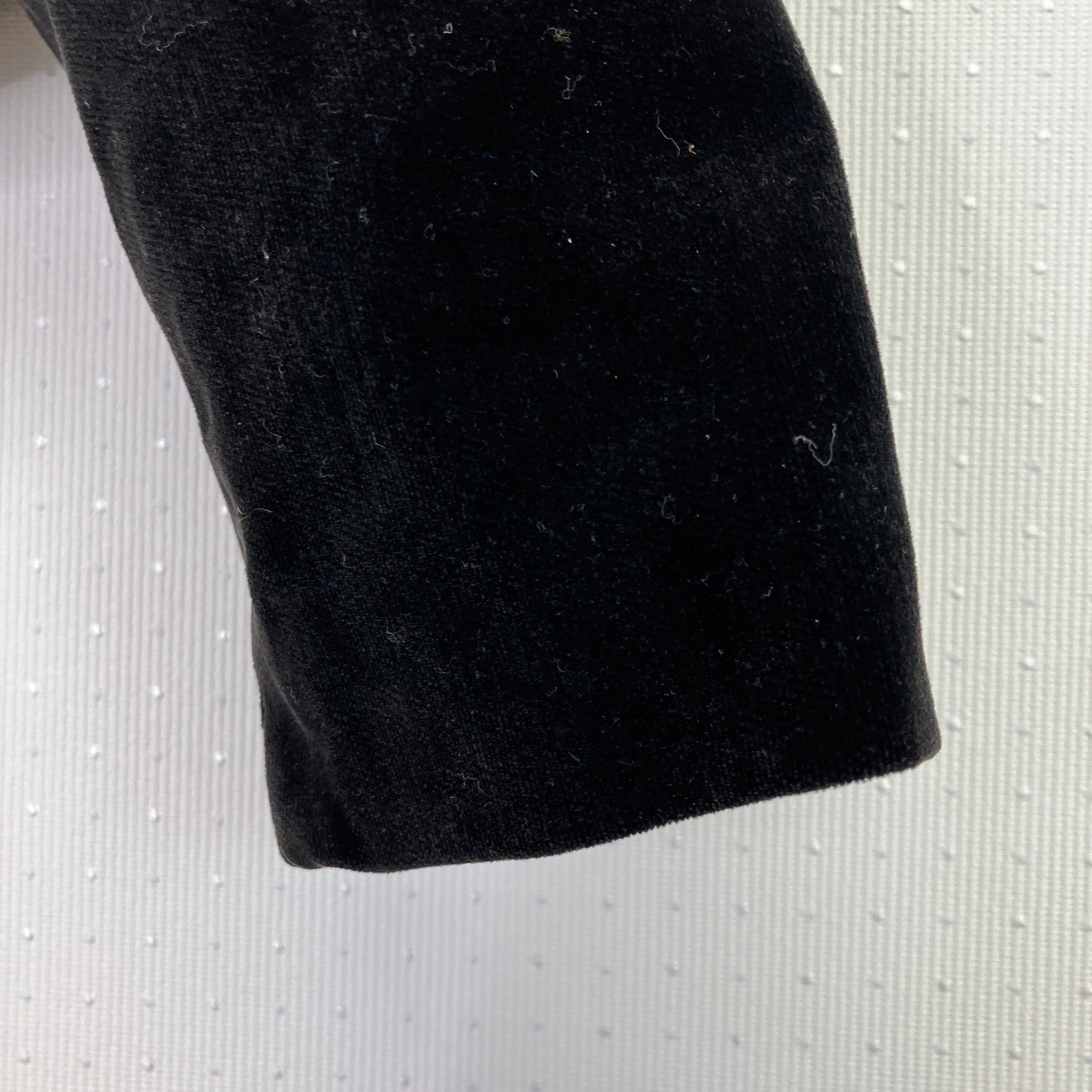 深みのあるブラックのベロア生地に、フロント部分にはゴールド系の糸で華やかな刺繍が施されています。