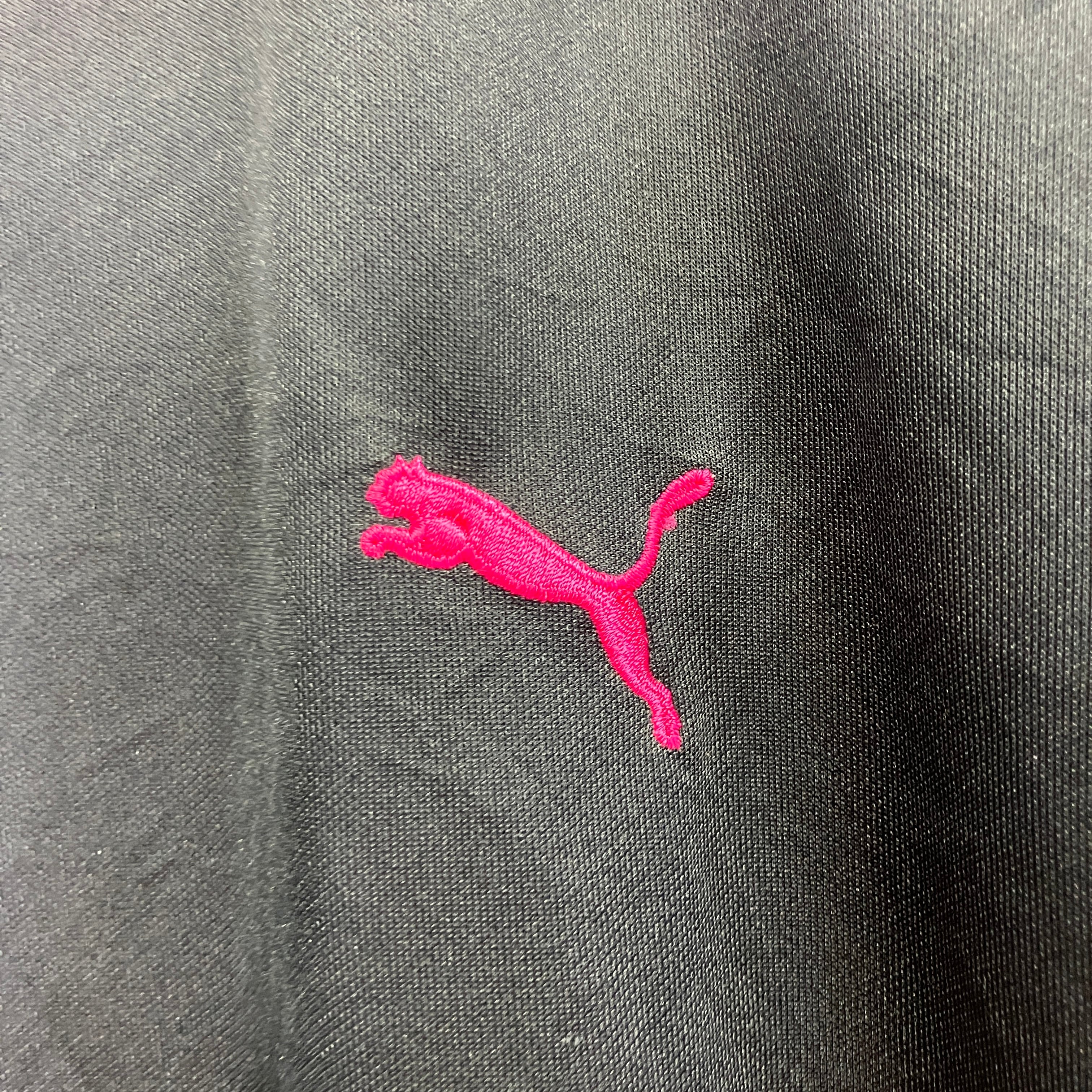 黒の本体に、脇腹や裾にかけてグレーのメッシュ切替、そしてVネックラインと胸のプーマロゴに鮮やかな蛍光ピンク(フューシャピンク)がアクセントとして使われたスポーティーなデザインです。