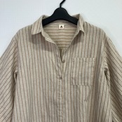 ベージュのストライプデザインの長袖シャツワンピース、リラックスしたフィット感が特徴。