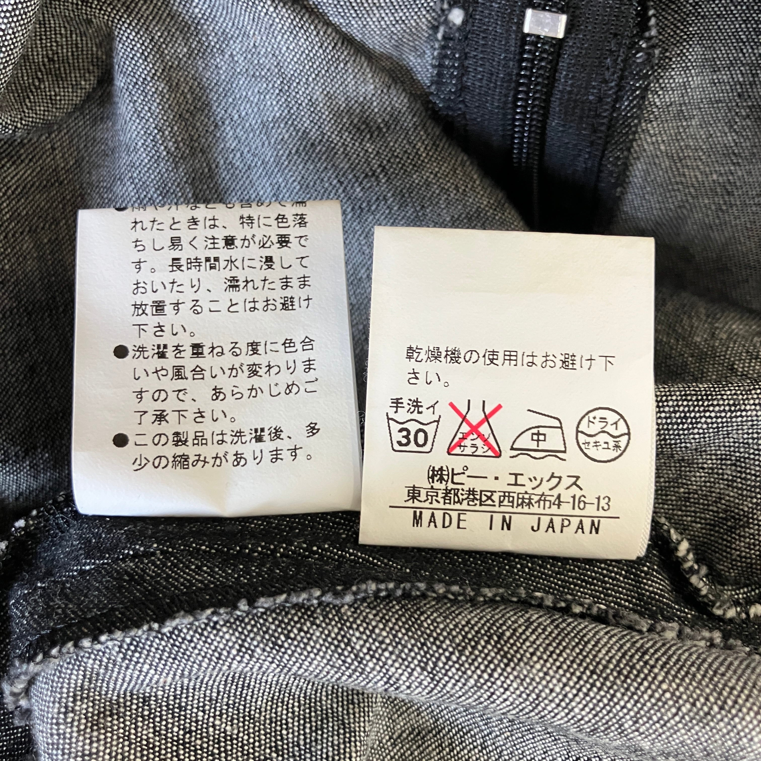 綿100%のデニムまたはインディゴ系の素材感で、濃紺と白が混ざったような奥行きのある色合いが特徴です。