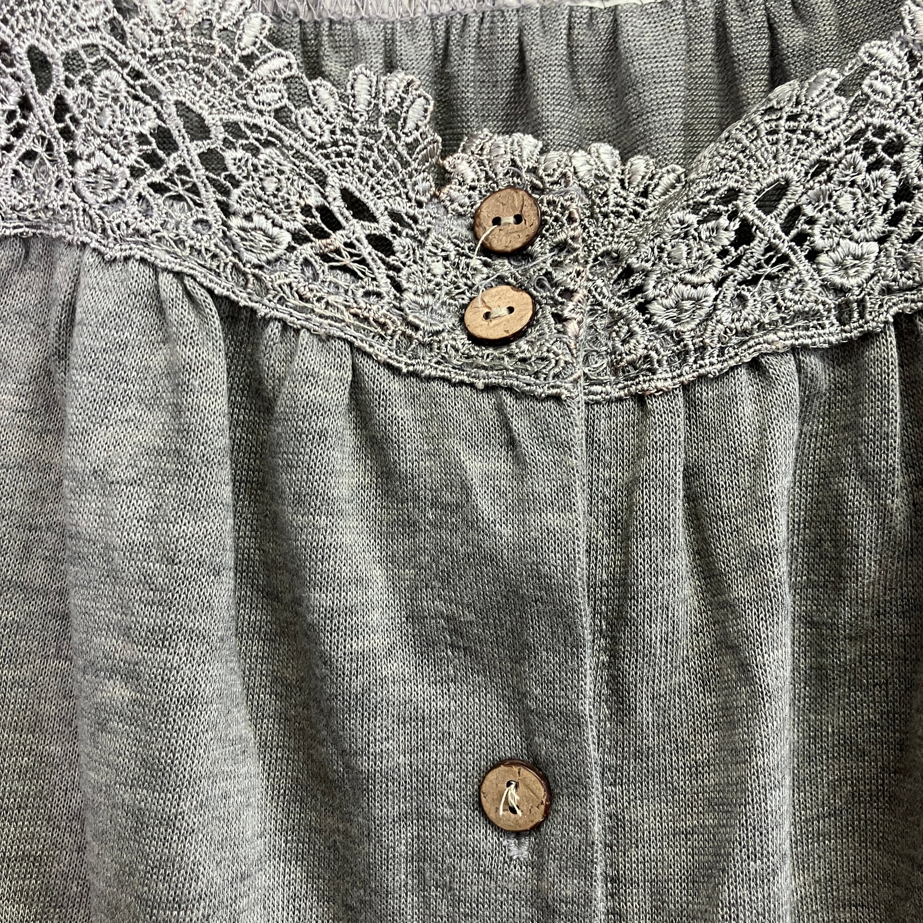 ※お洗濯は「手洗い30℃」で、揉み洗いせず短時間で行い、単独洗いで十分にすすいでください。生成・淡色系は無蛍光洗剤を使用してください。レース付きのスクエアネックデザインで、木製ボタンが特徴のグレーのチュニックです。