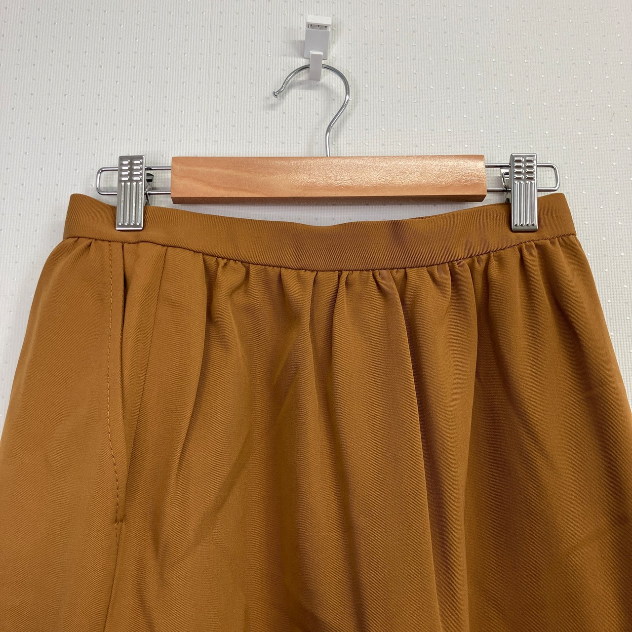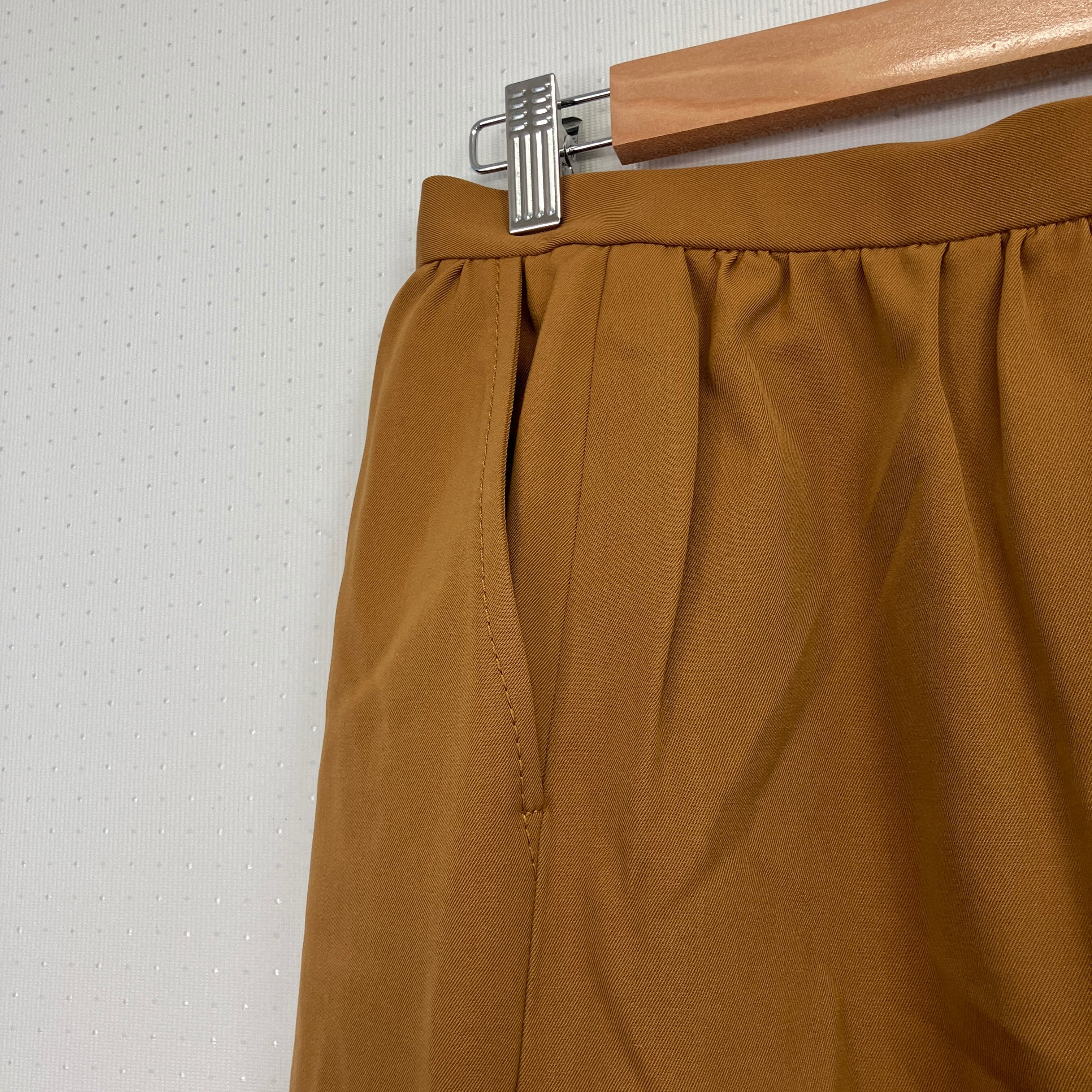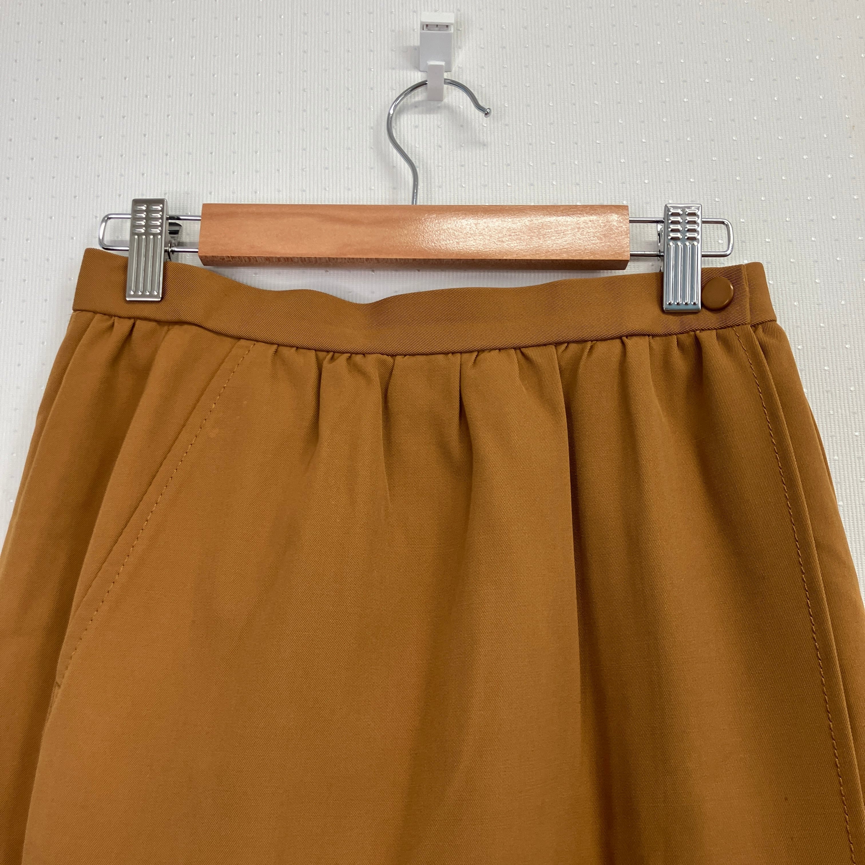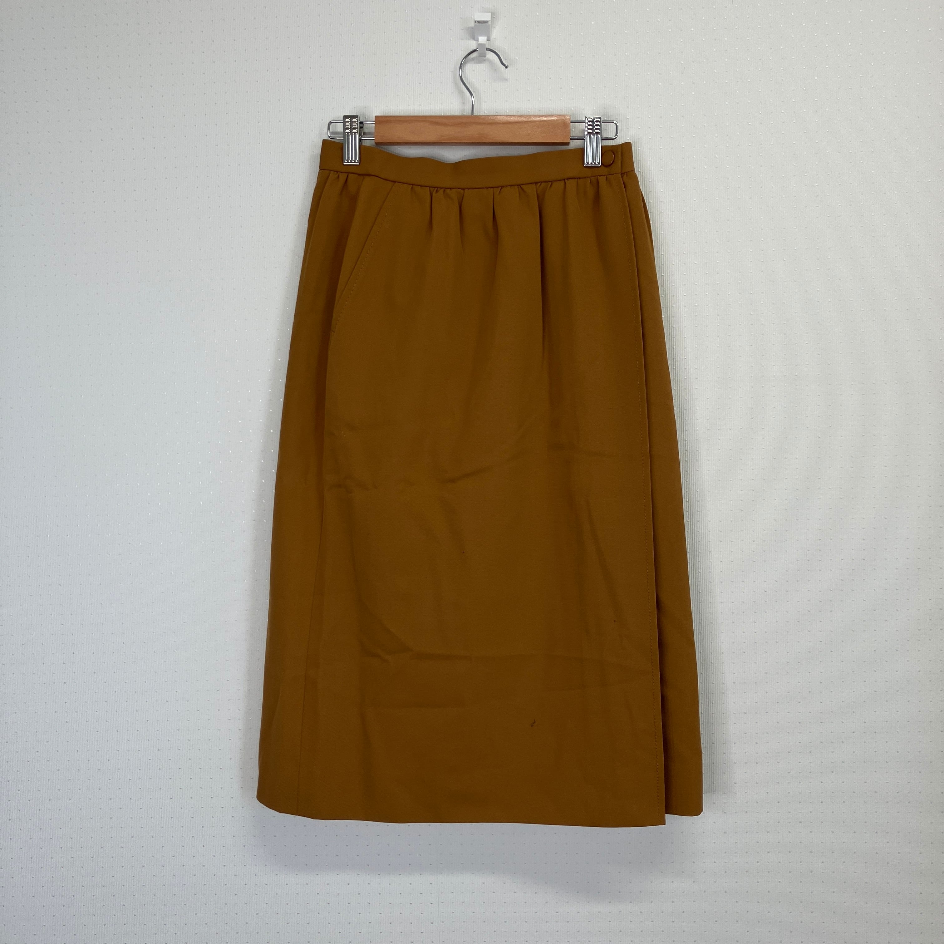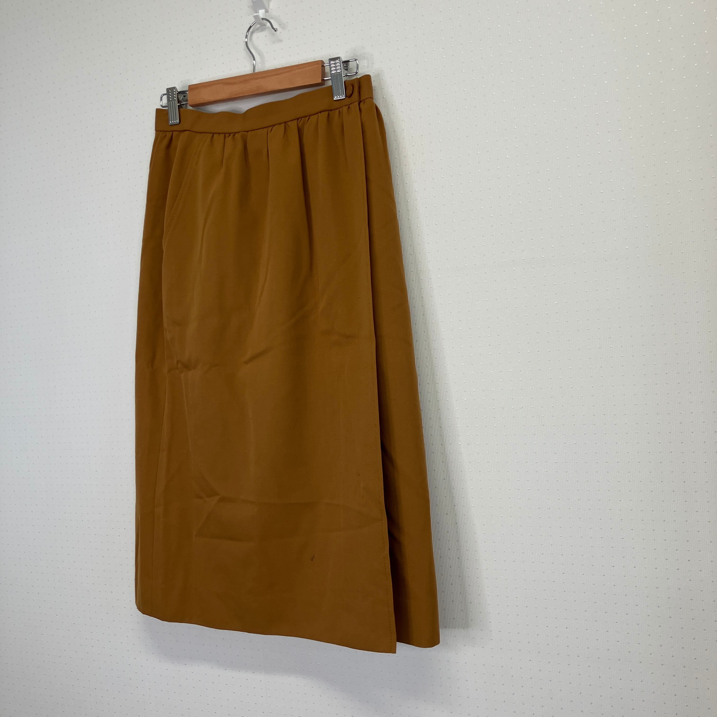 ブラウンの膝丈タイトスカート、サイドポケット付き。