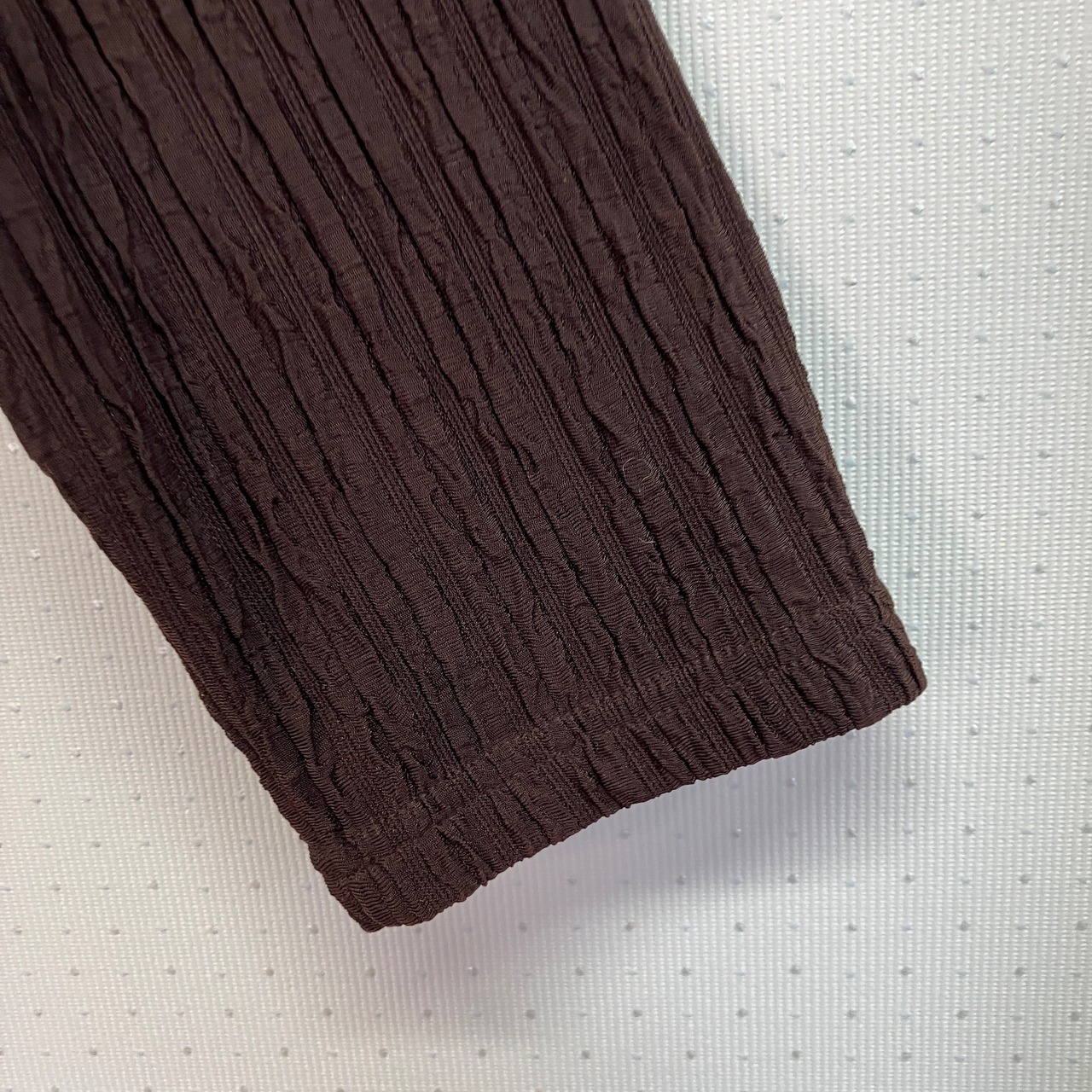 濃いブラウンの生地は全体的に細かな凹凸のあるプリーツ調になっており、伸縮性があり快適な着心地です(ポリエステル90%、ポリウレタン10%)。
