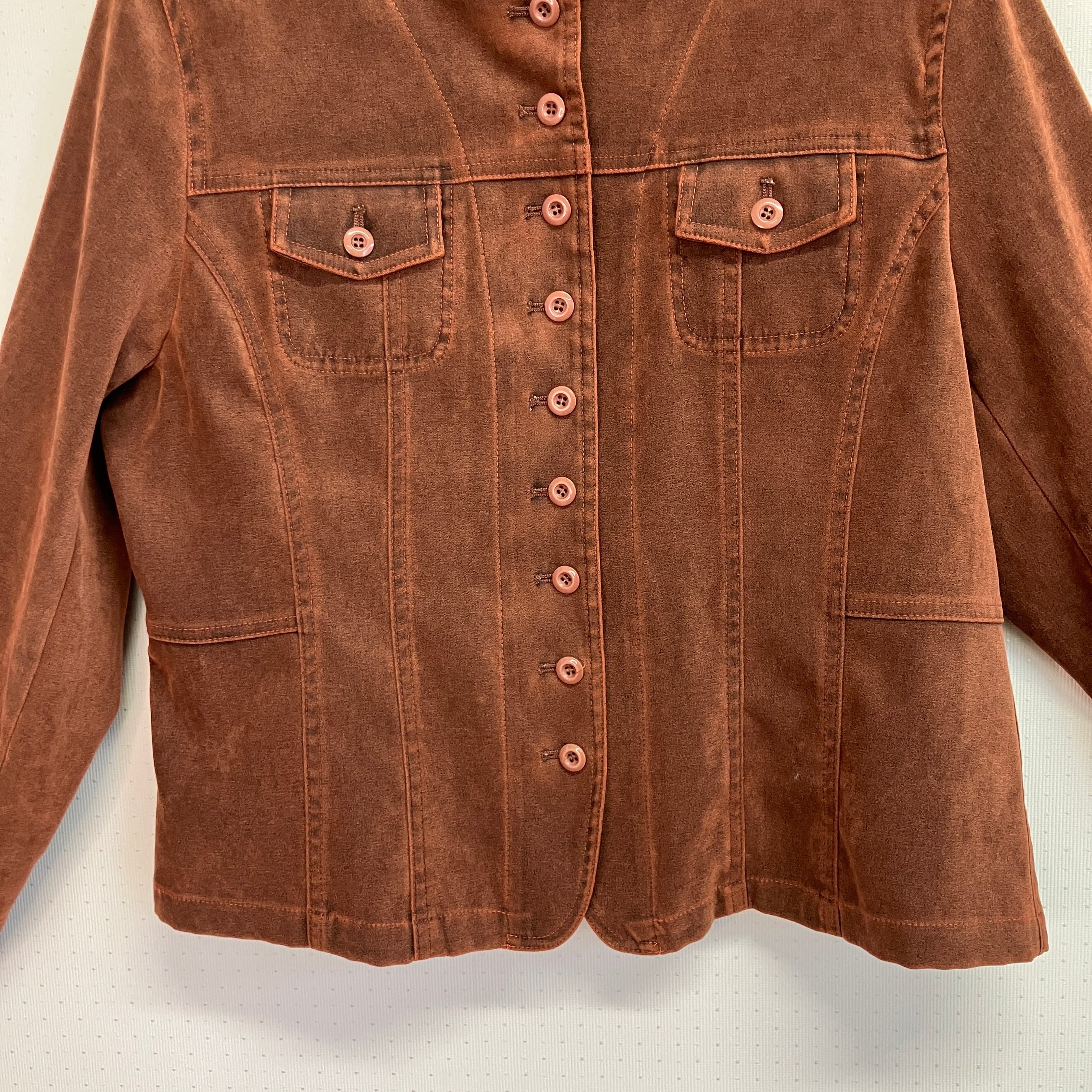 スエード調のような起毛感のある素材で、前身頃にポケットが2つあり、ボタンのデザインが特徴的です。