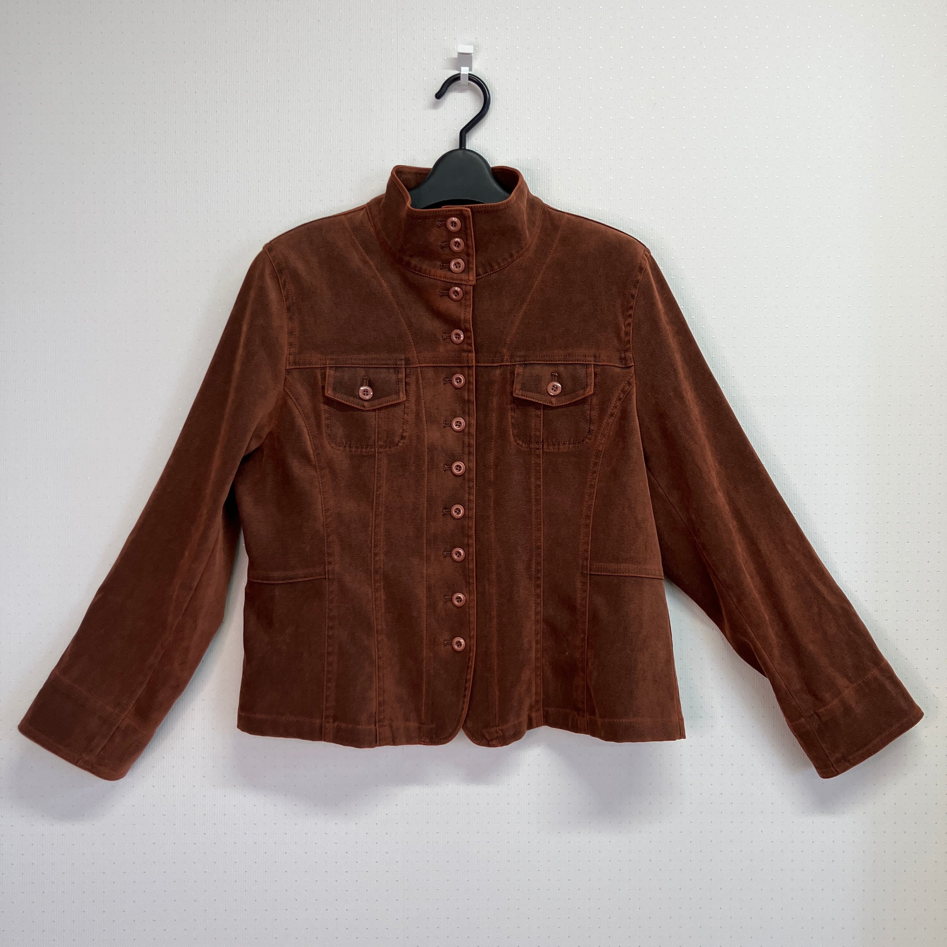 テラコッタまたは赤茶系の色味のスタンドカラージャケットです。
