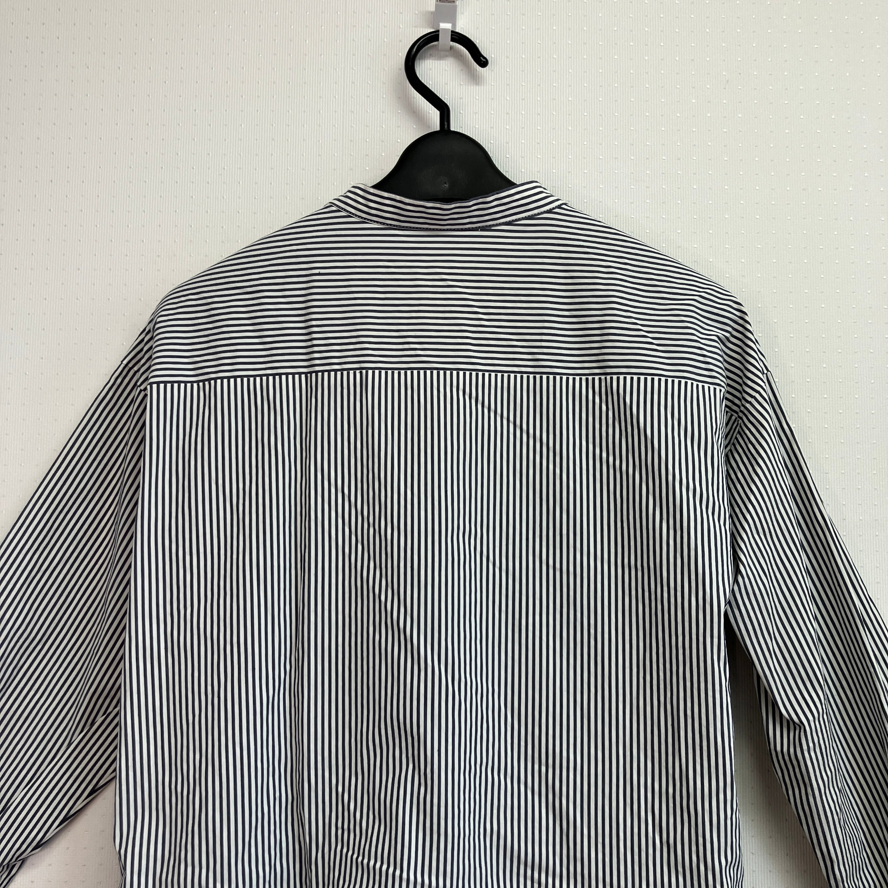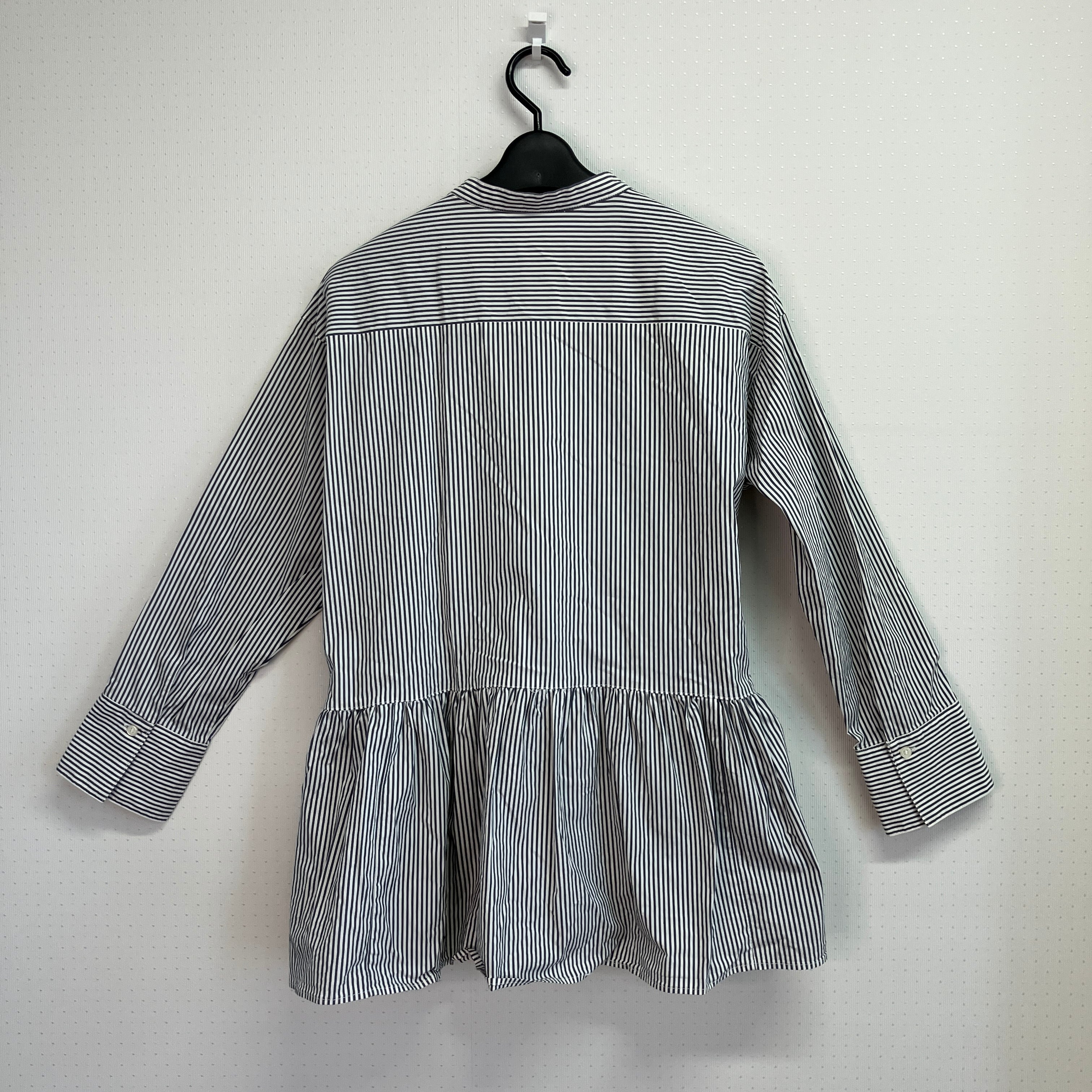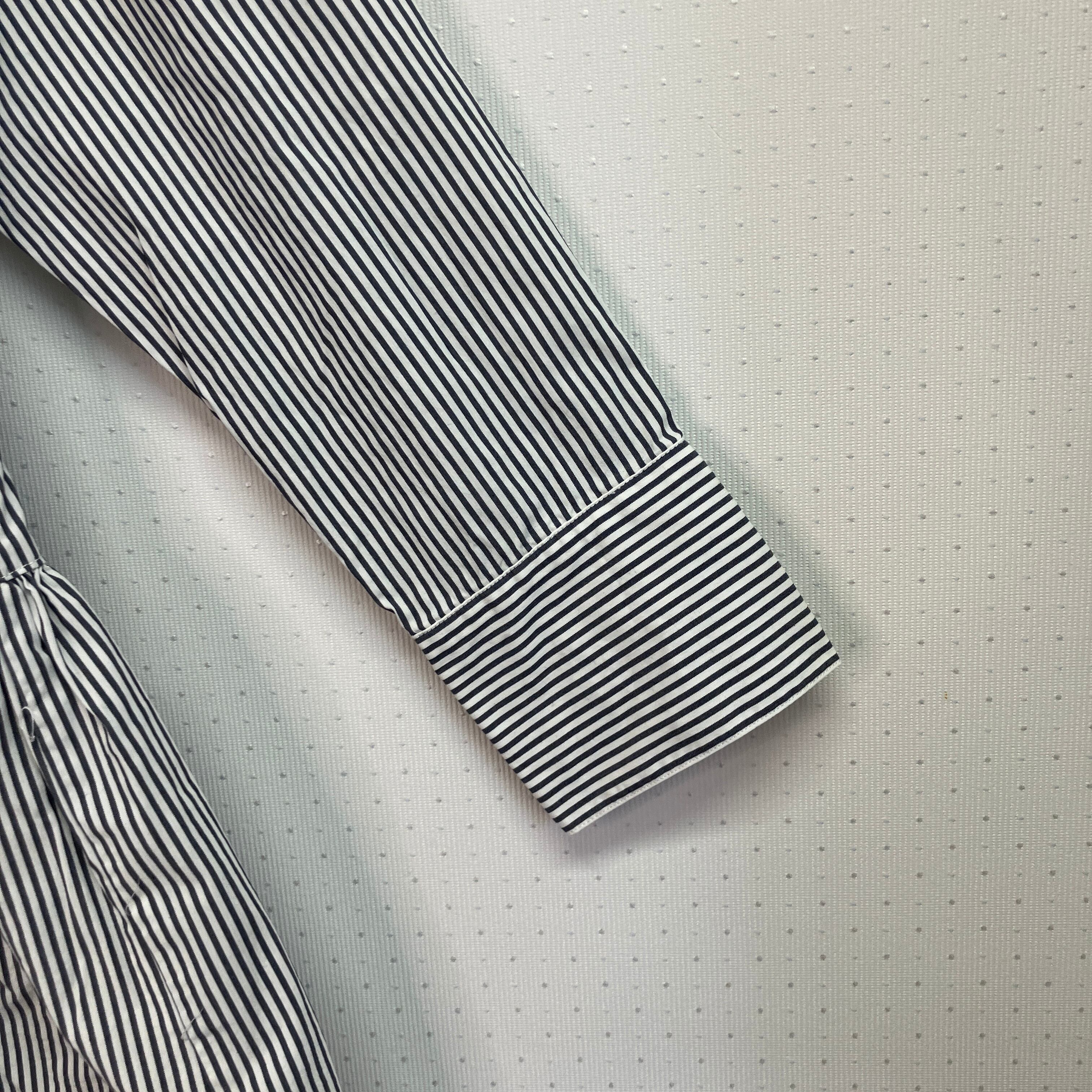 ネイビーとホワイトの細いストライプ柄の長袖ブラウスです。