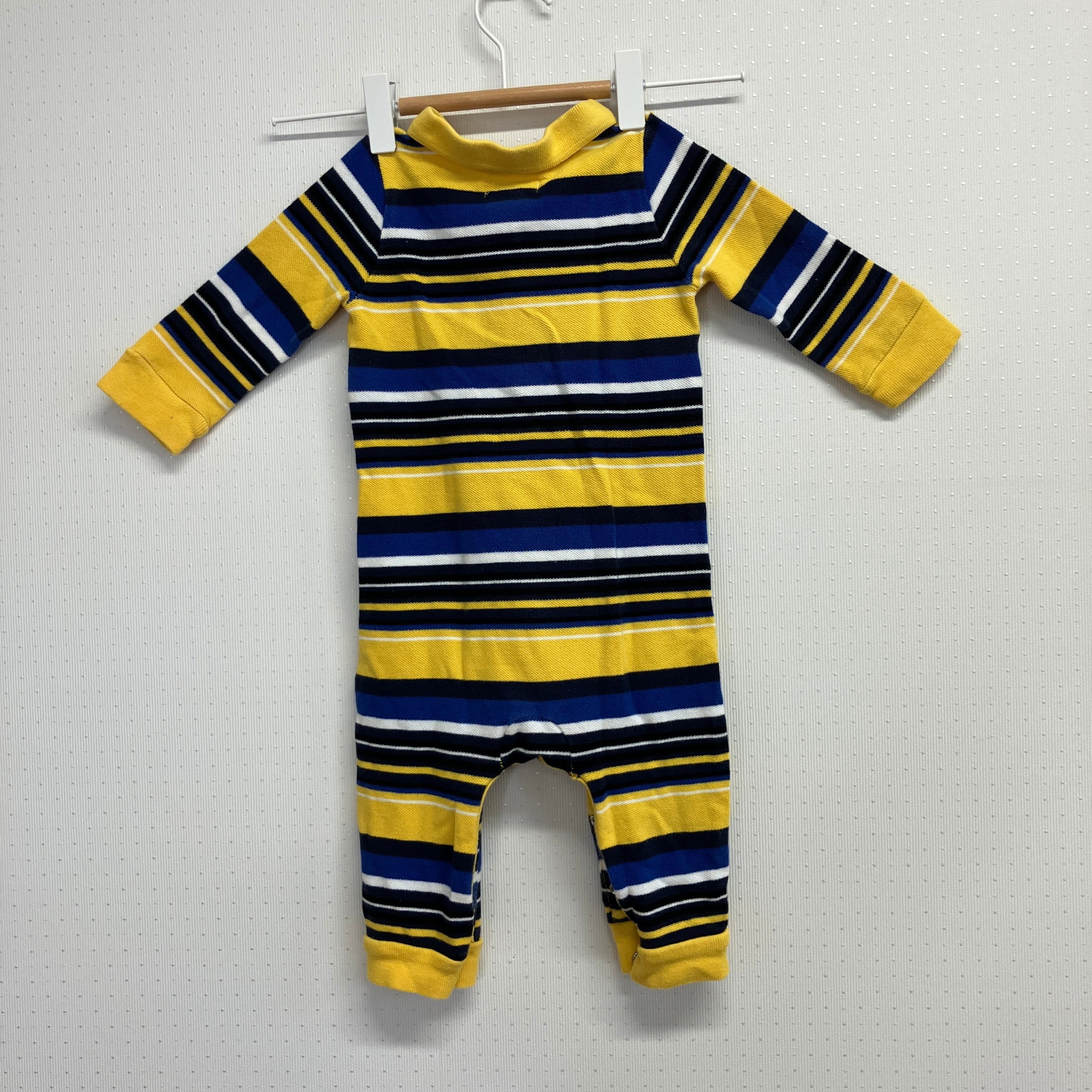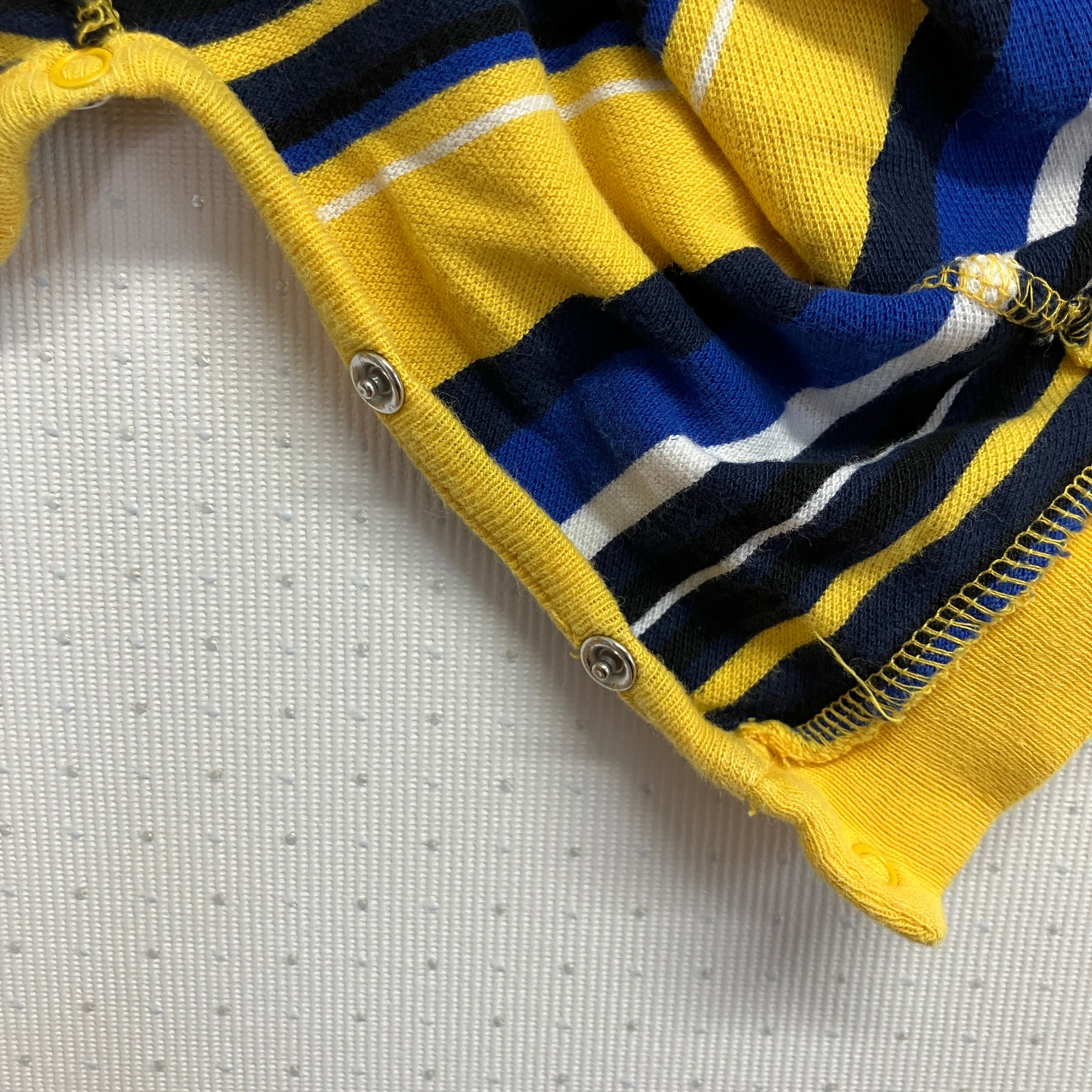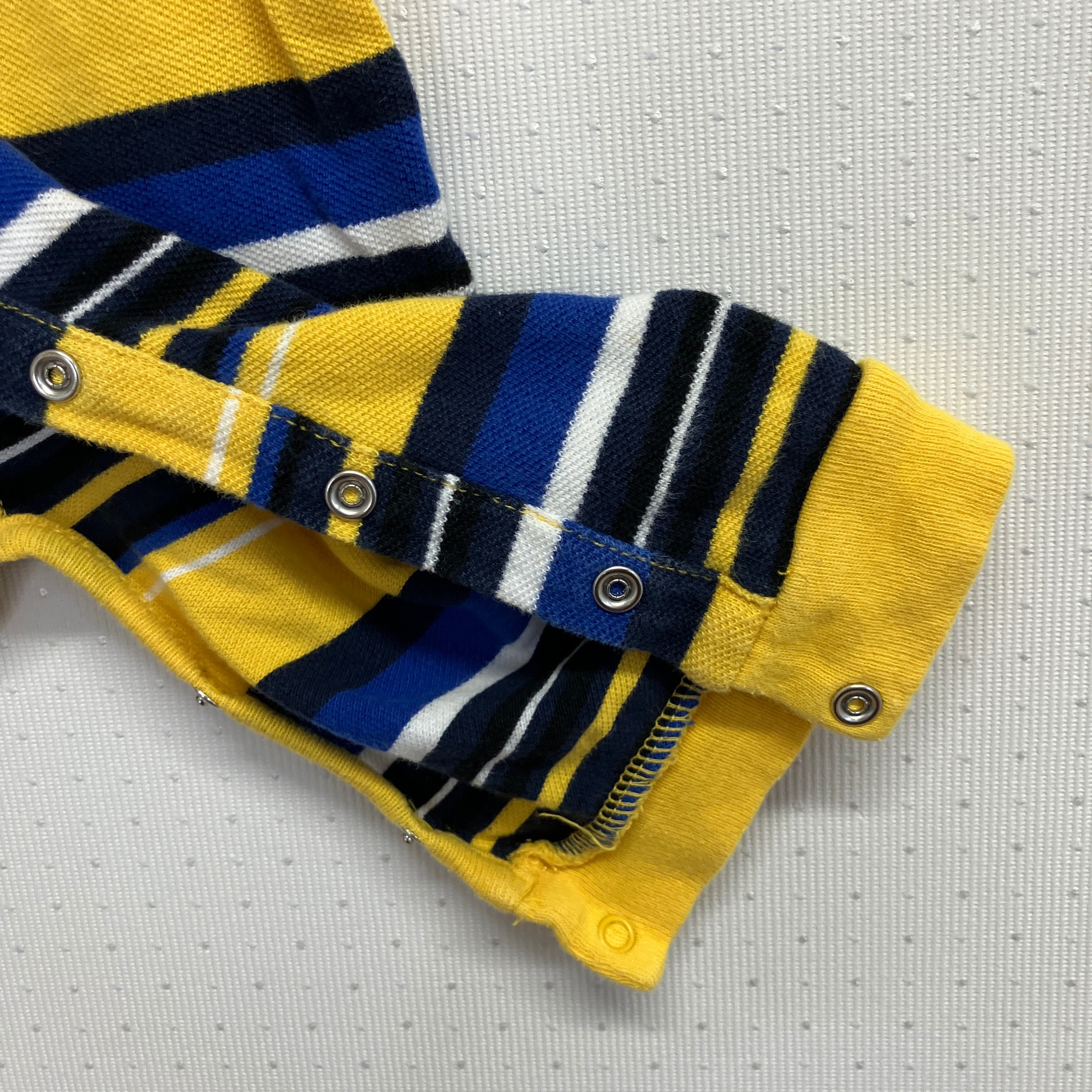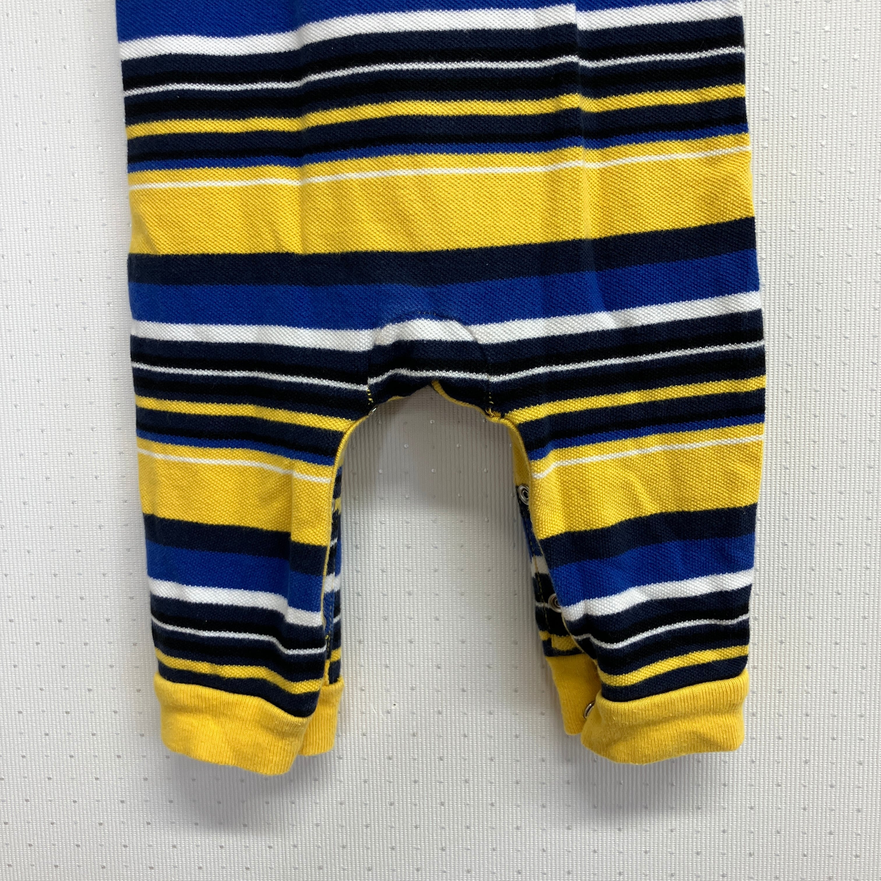 イエローとブルーのストライプデザイン、100%コットン製のロンパース。
