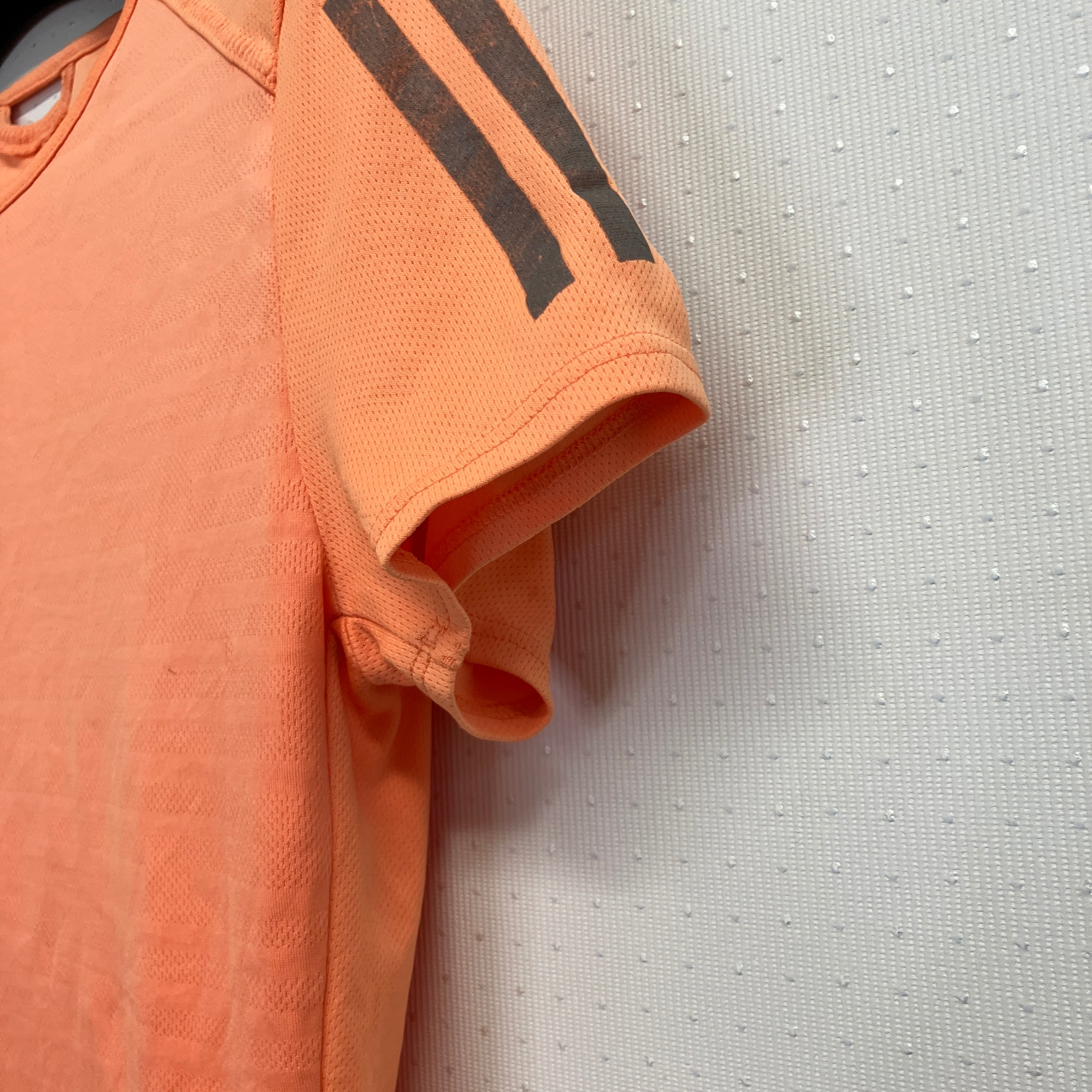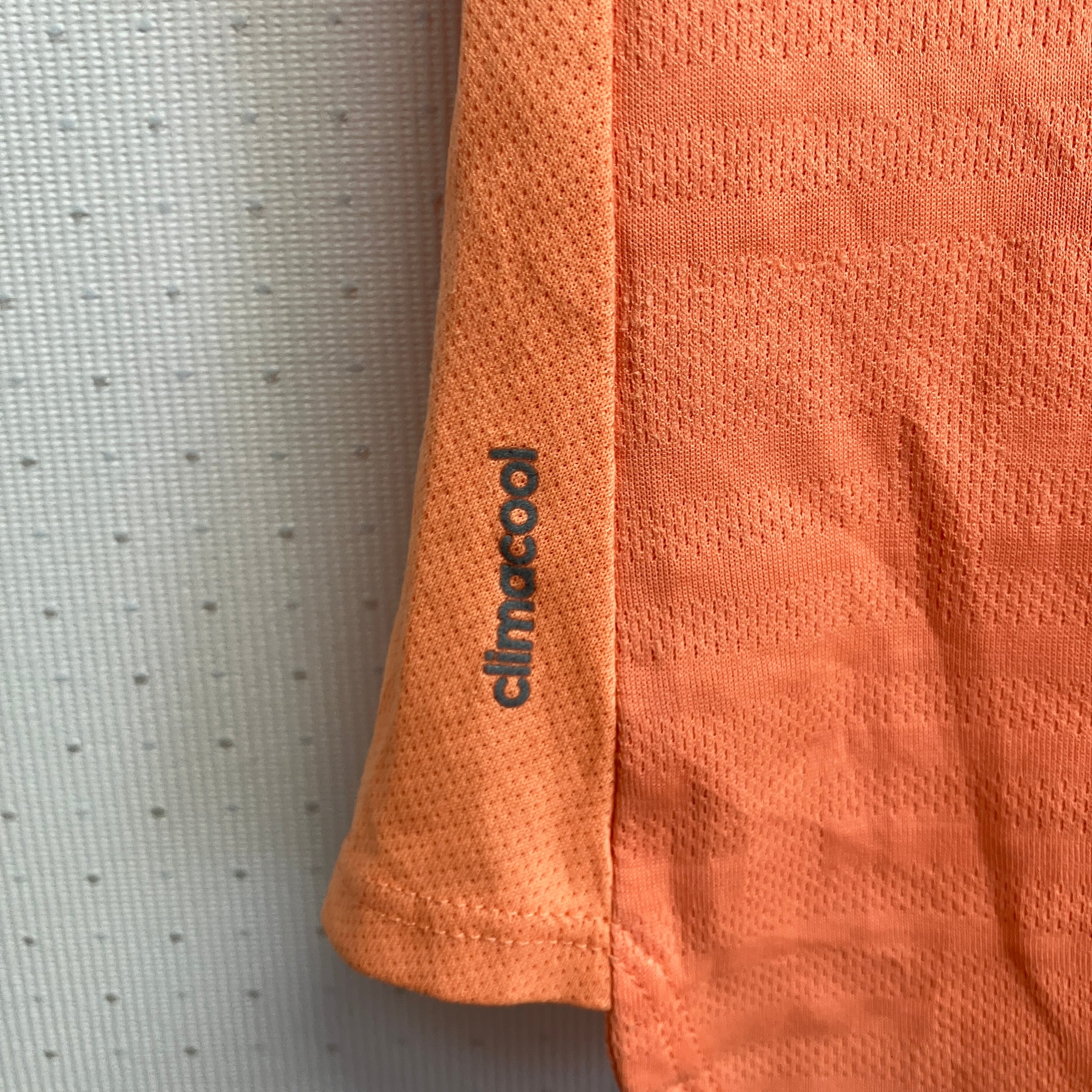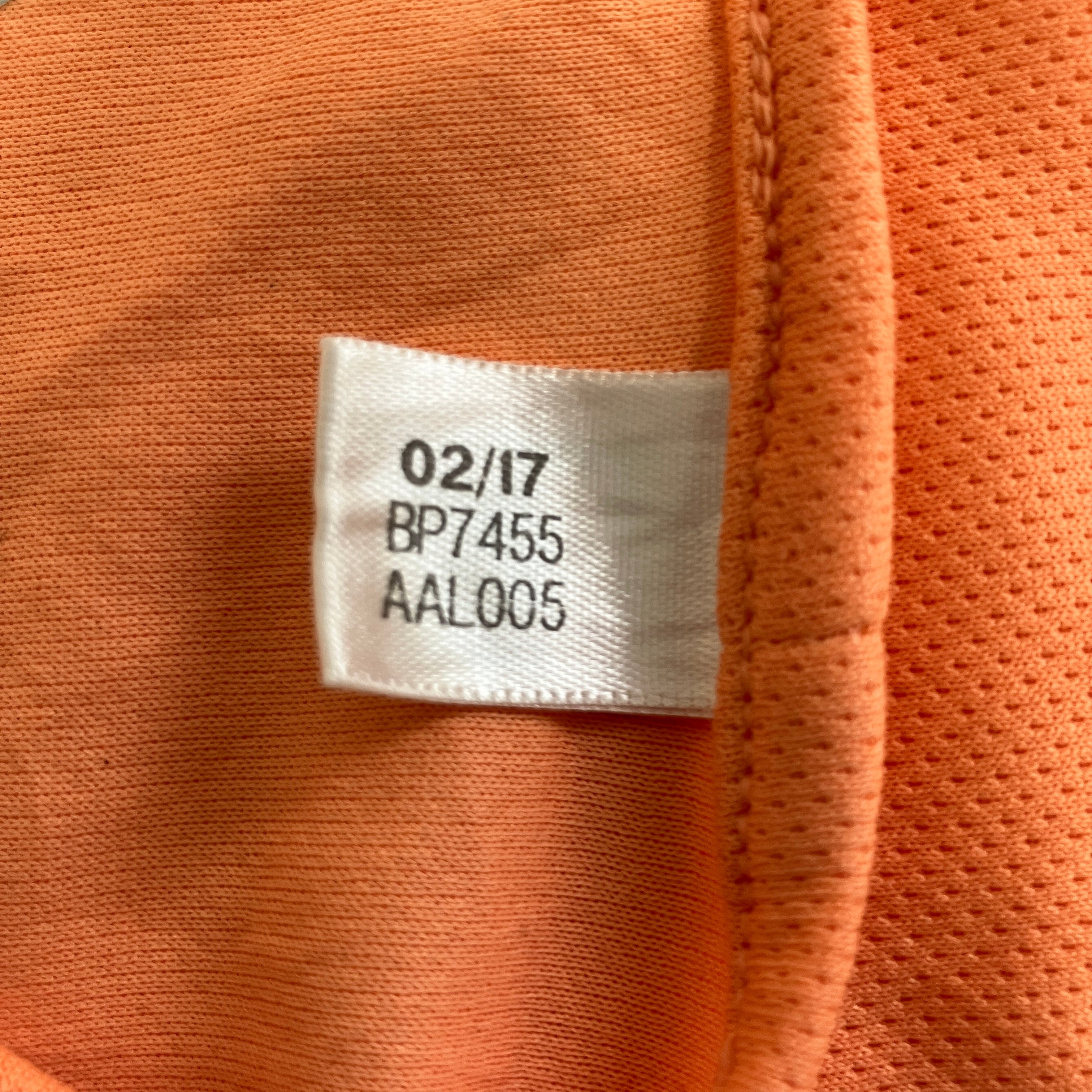 鮮やかなオレンジ色で、袖と裾にはアディダスのロゴやスリーストライプス(3本線)が施されています。
