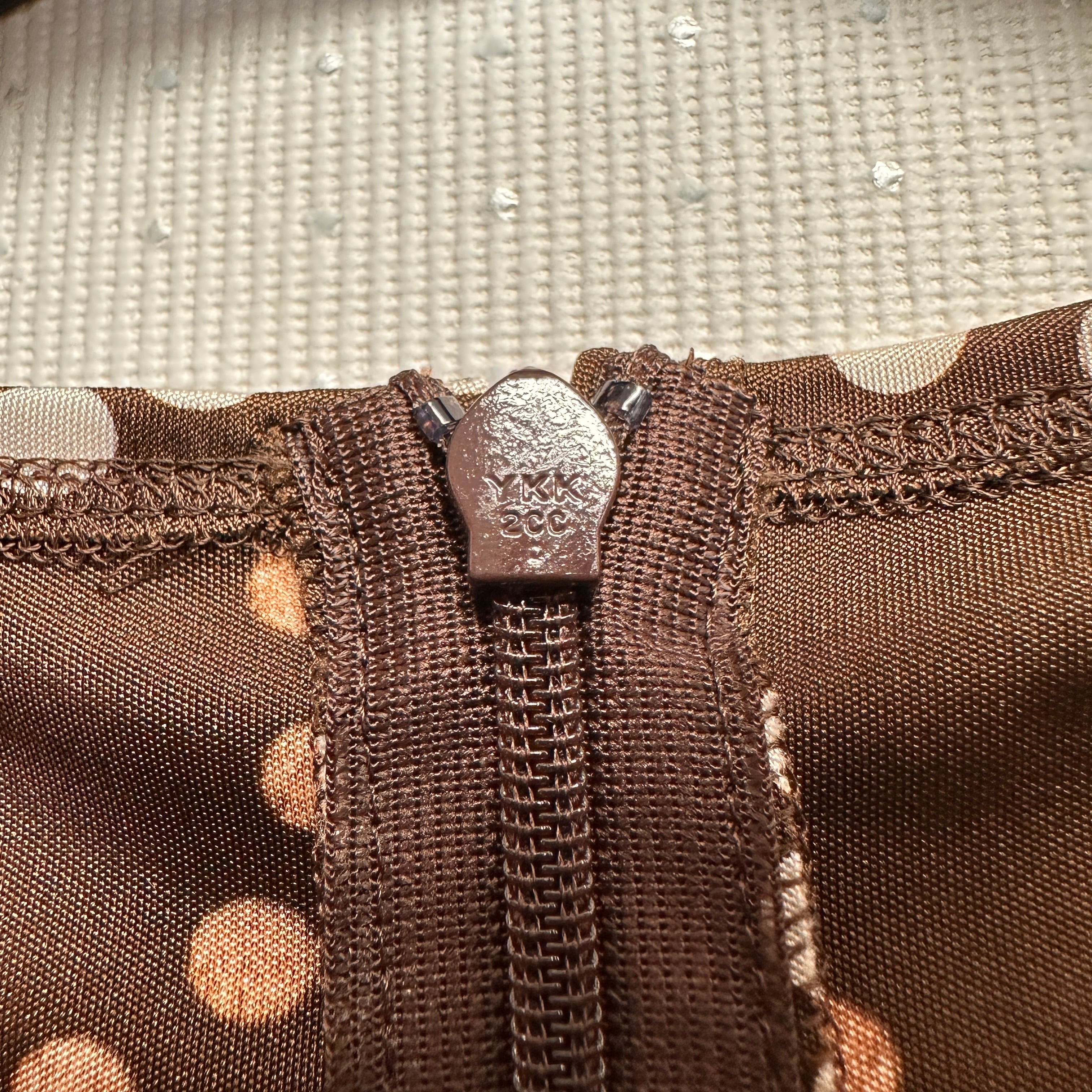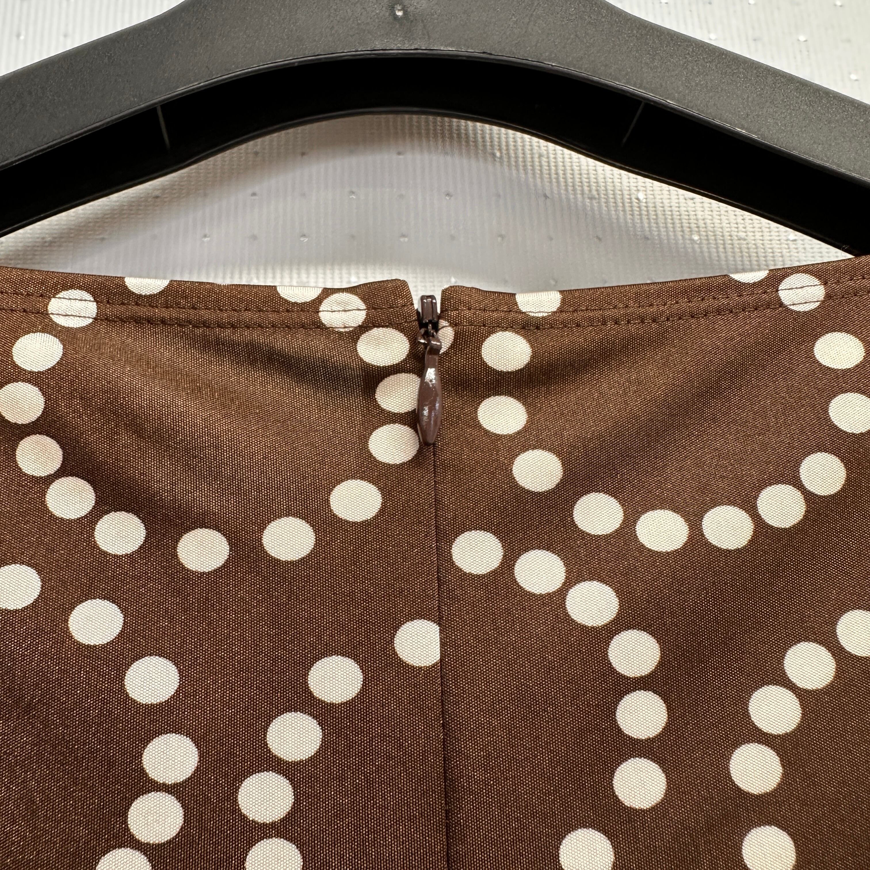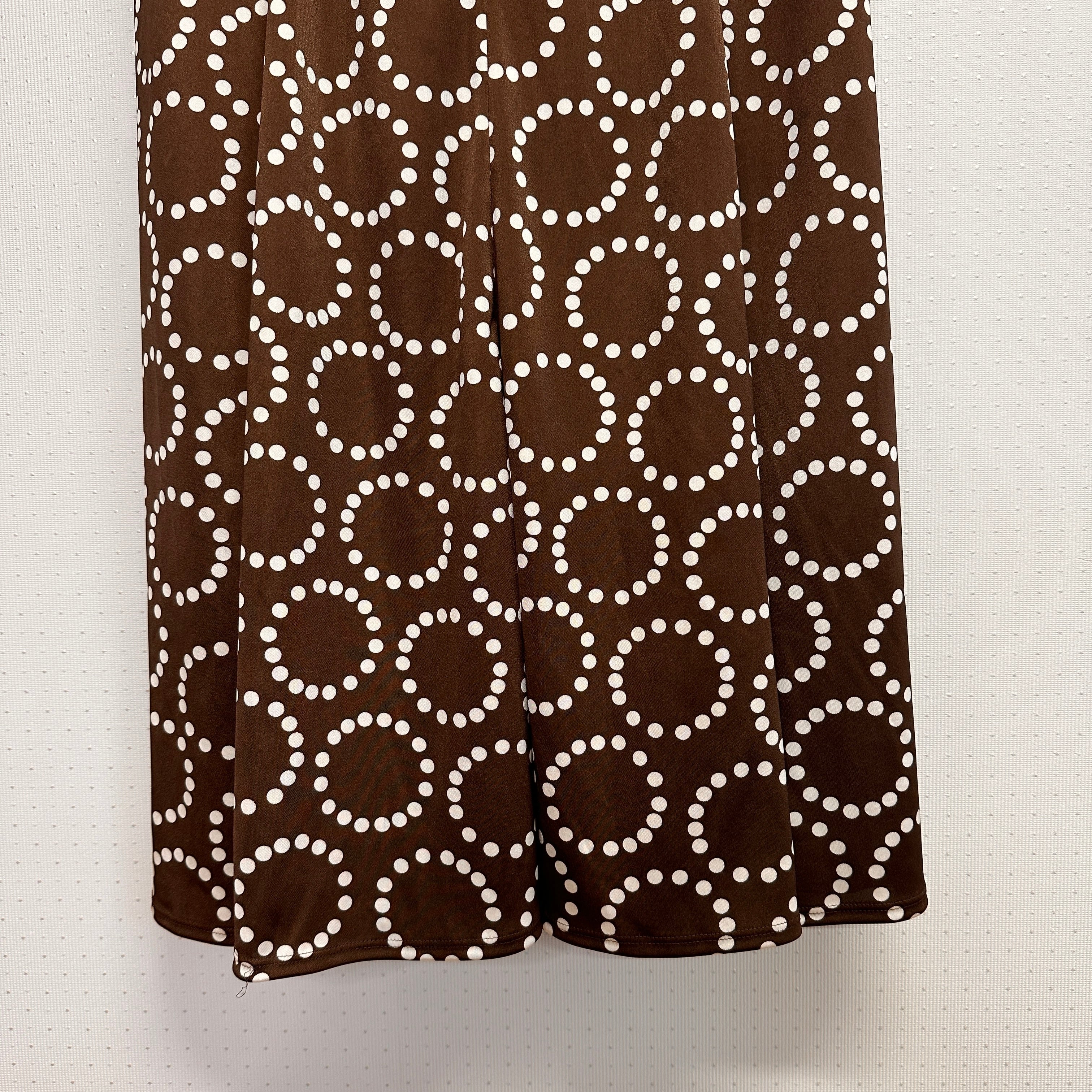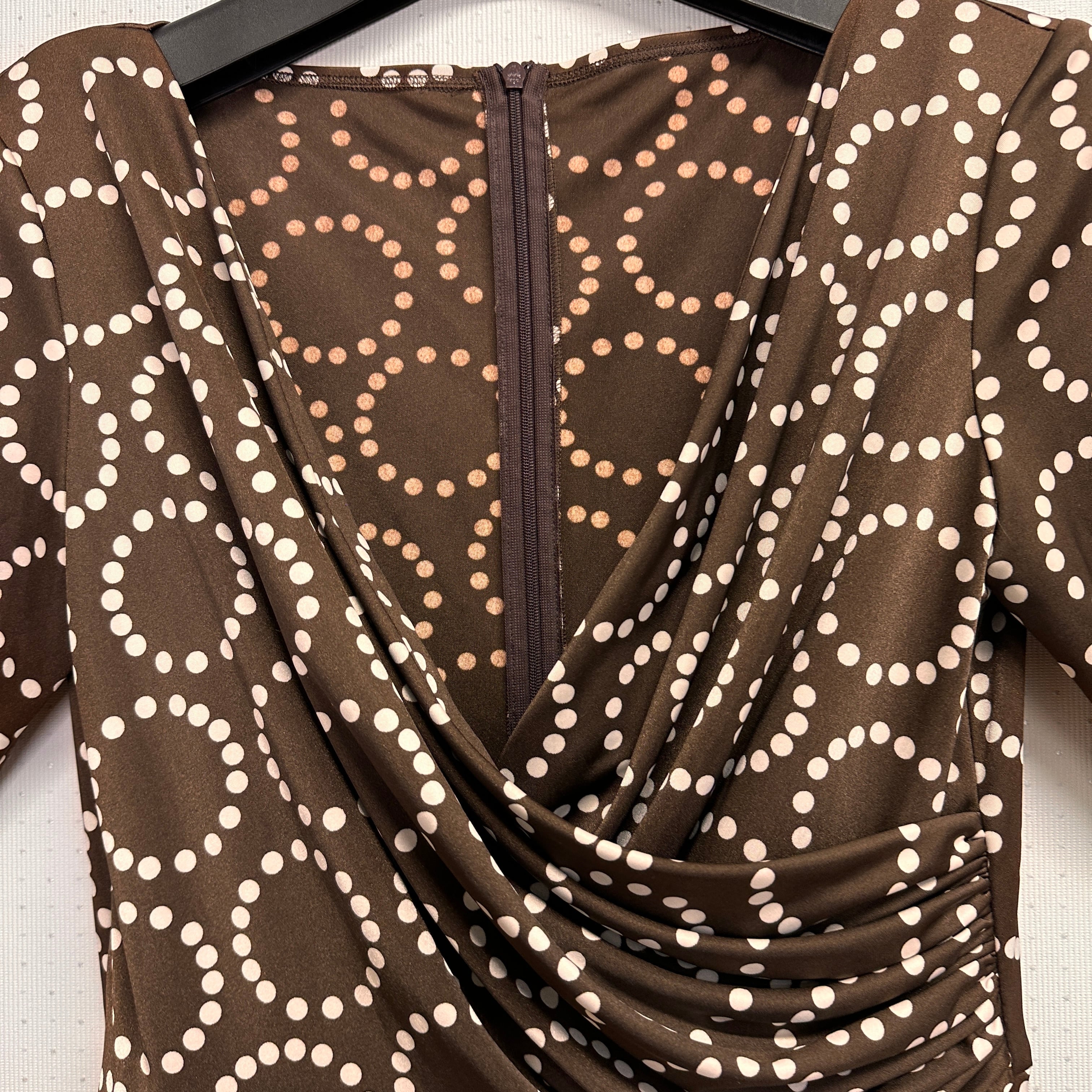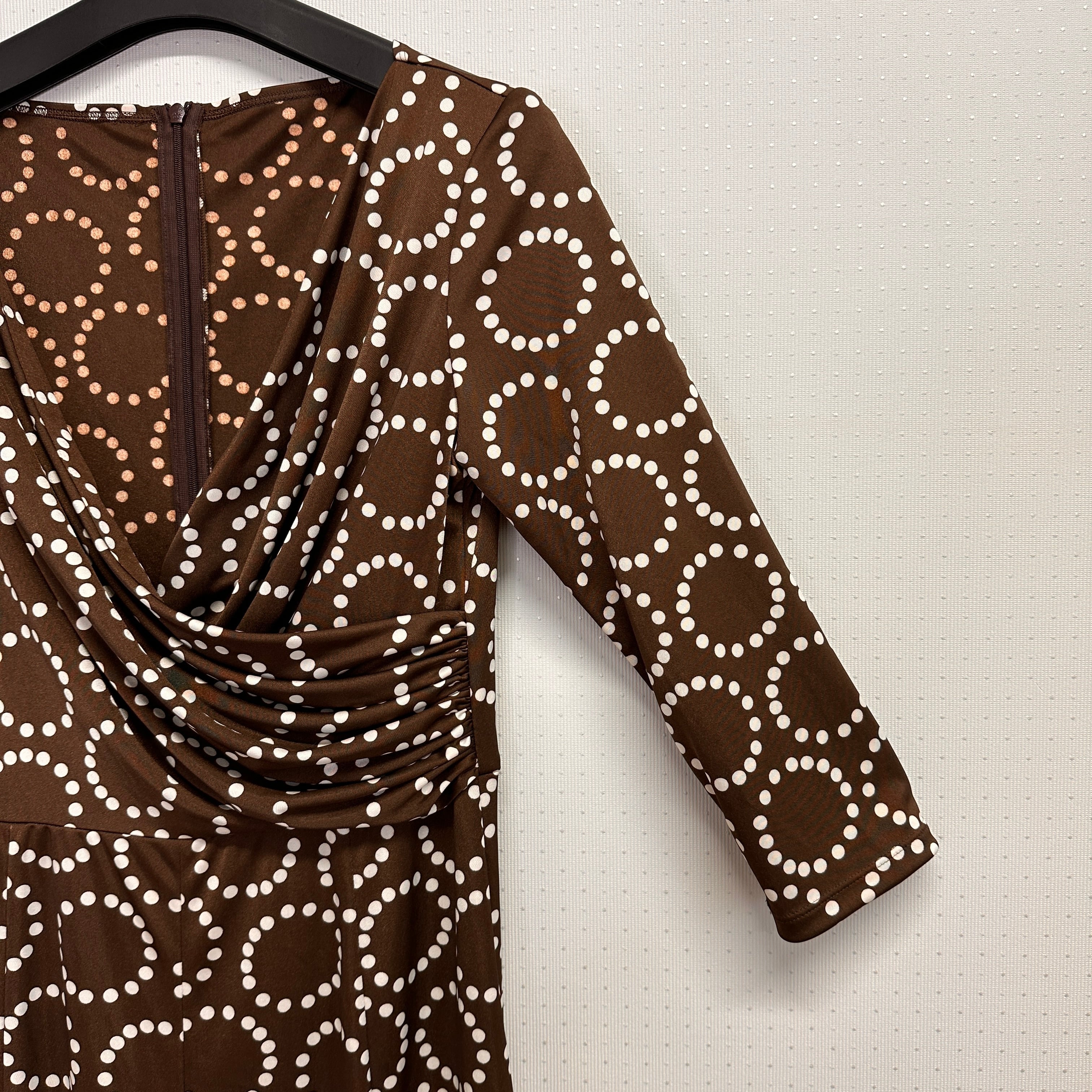目立った傷や汚れはありませんが、中古品にご理解いただける方のみご購入をお願いいたします。ドット柄のブラウンワンピース、七分袖、ドレープデザインでエレガントな印象。