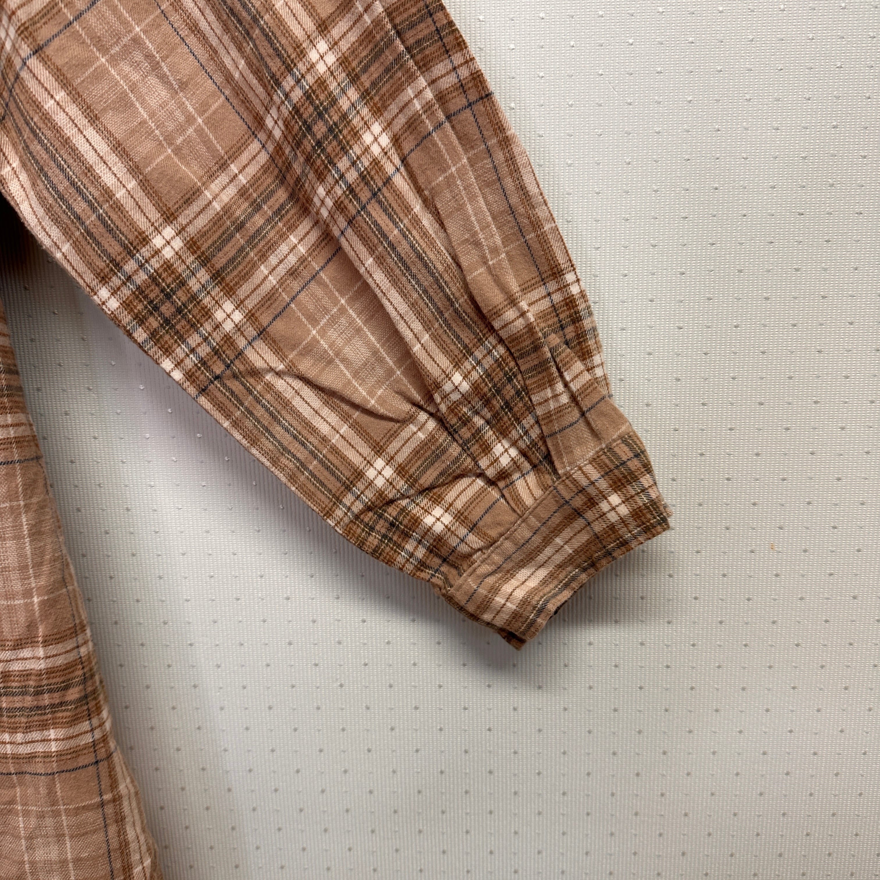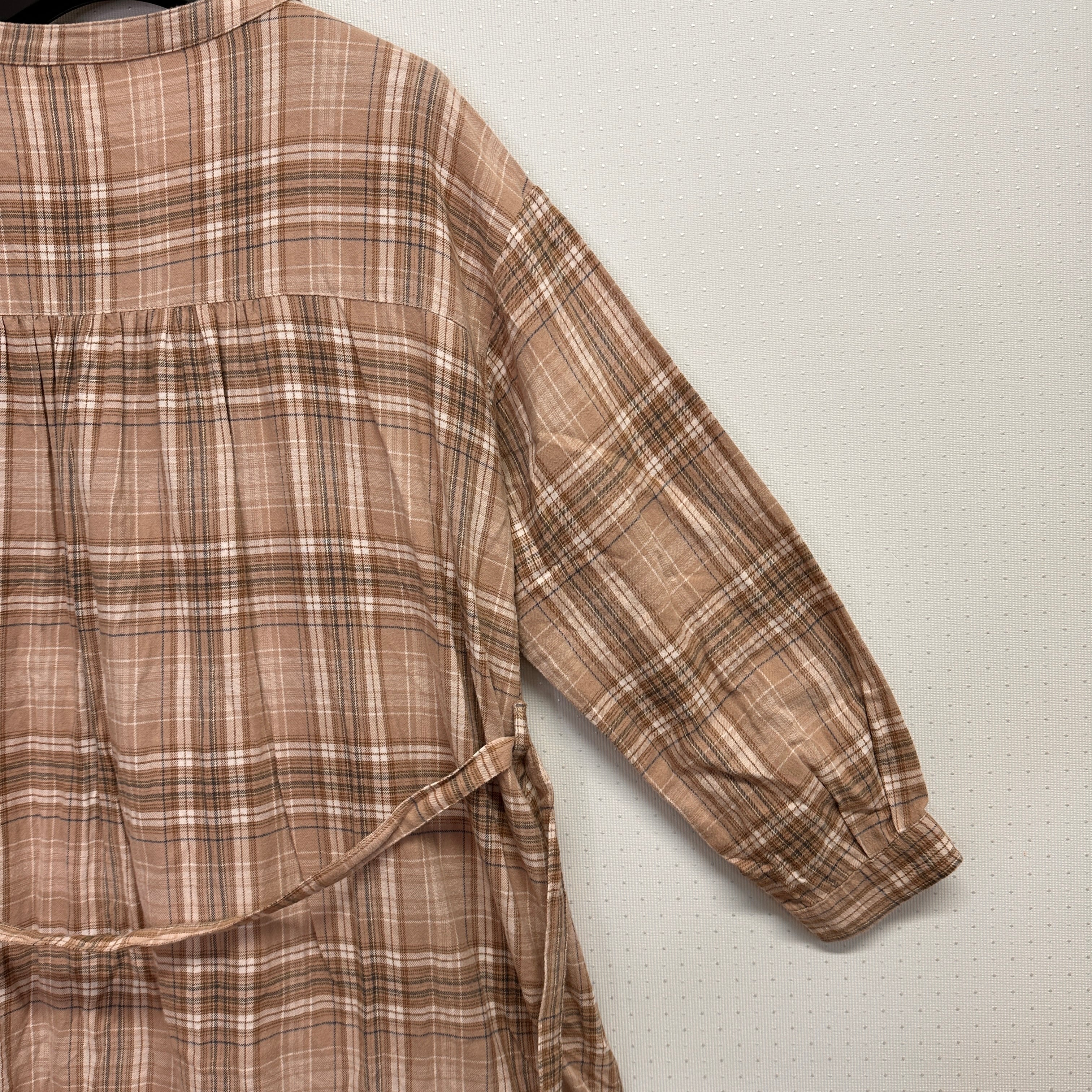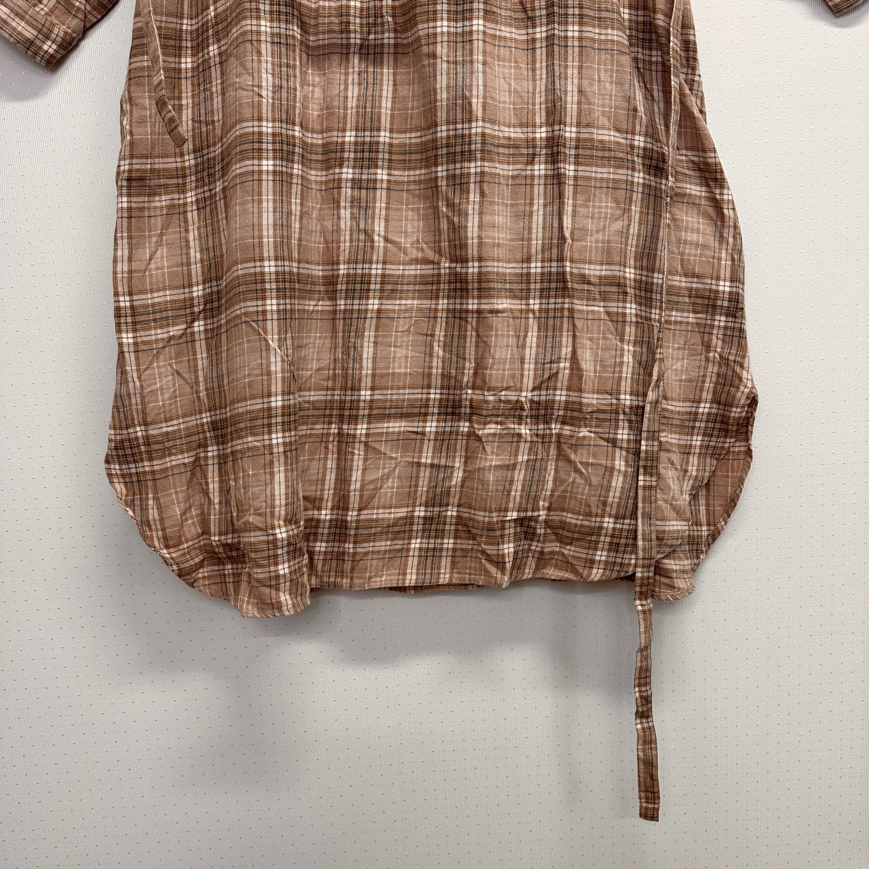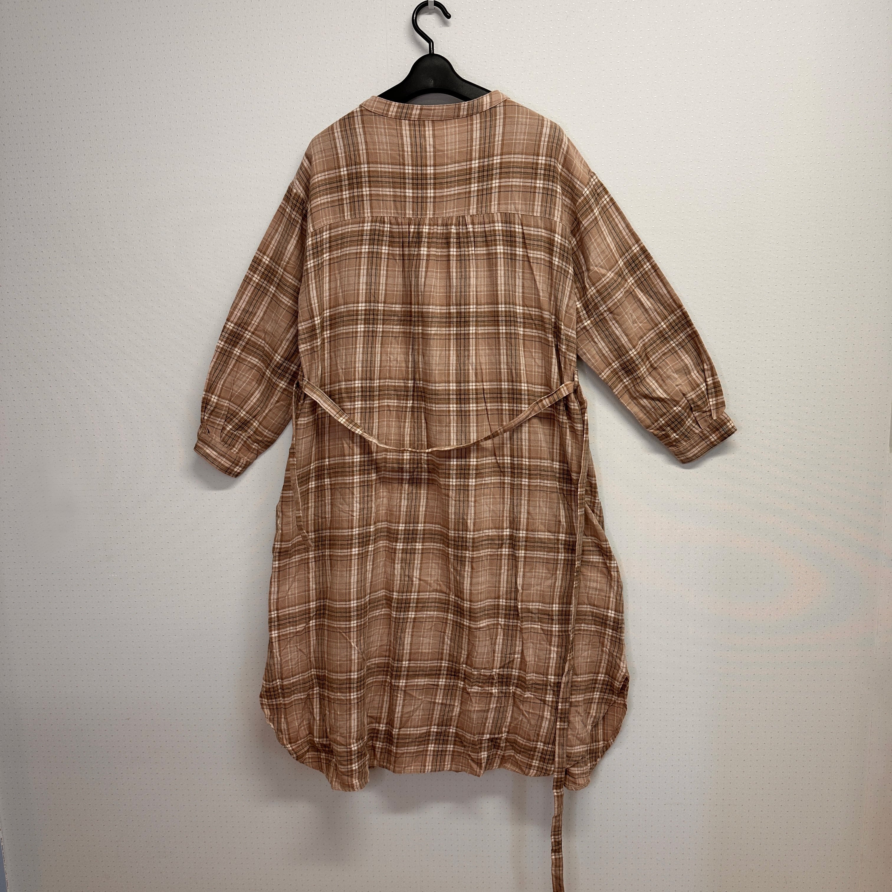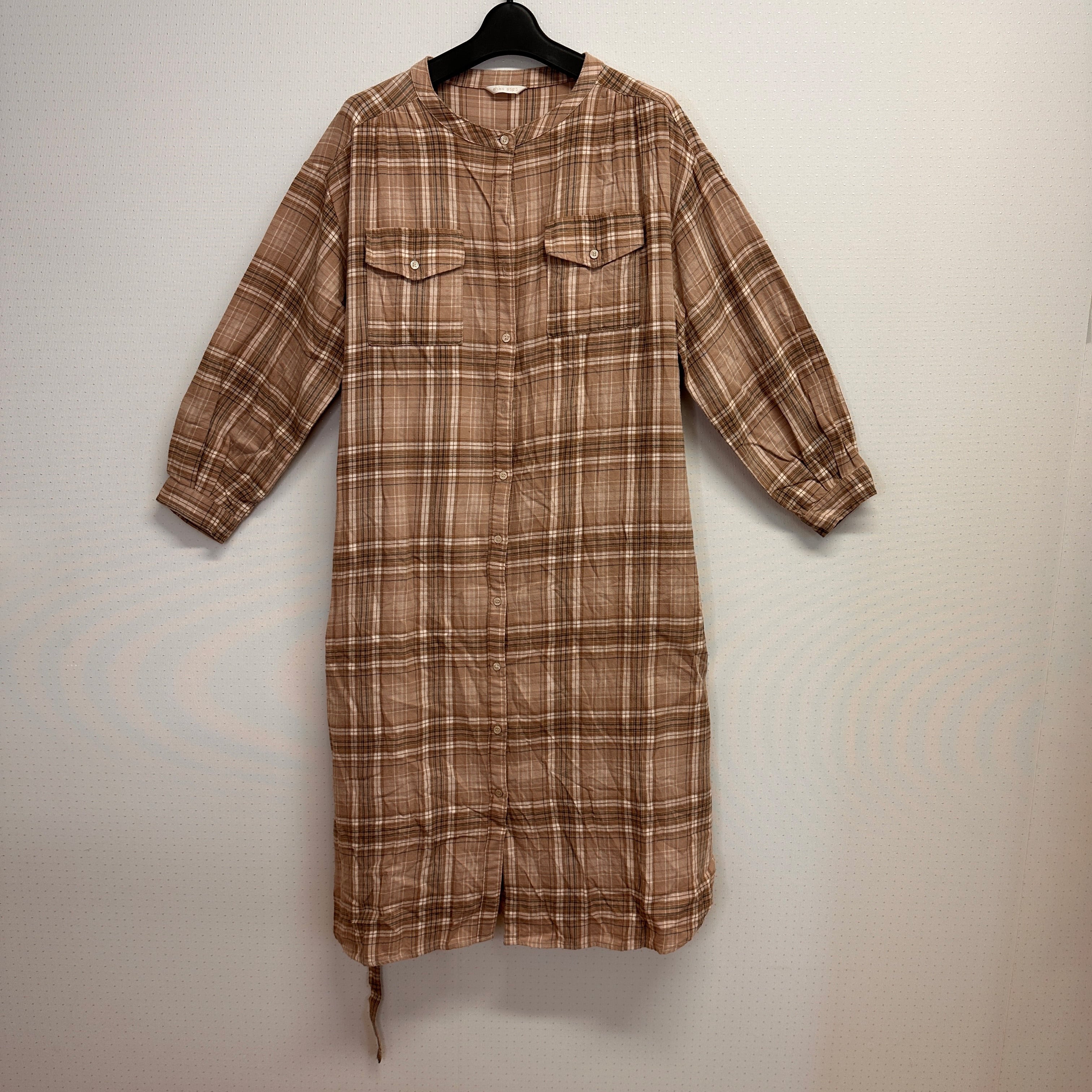 ブラウン系のチェック柄シャツワンピース、長袖デザインでカジュアルなスタイルに最適。