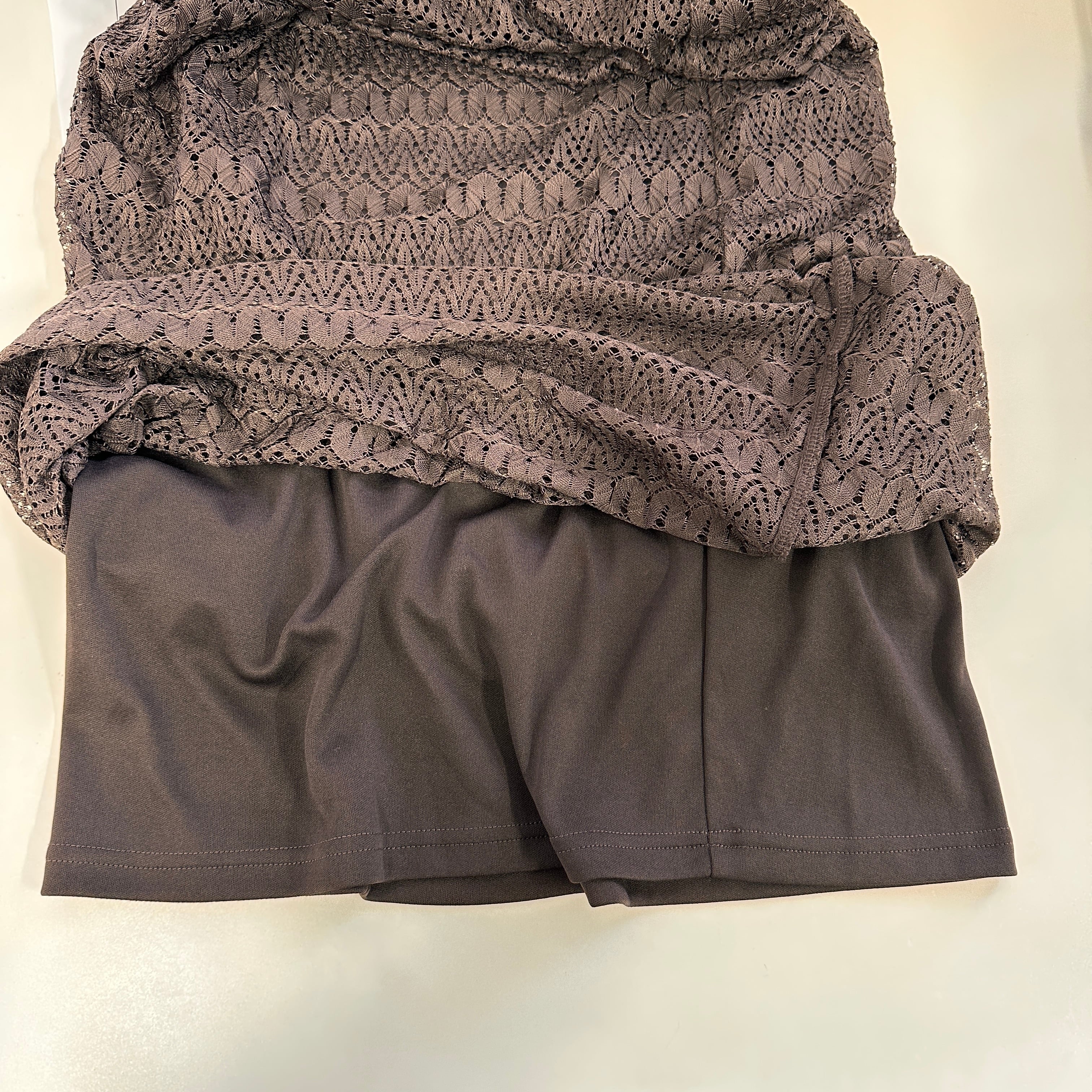 落ち着いたブラウンカラーのレース編みロングスカートです 。