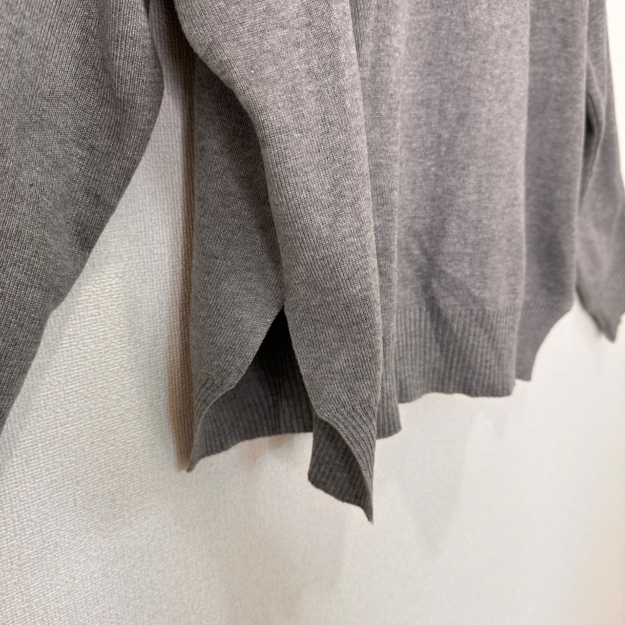 レーヨン70%、ポリエステル30%のさらっとした薄手のニット素材で、色はグレージュまたはライトグレーのような合わせやすい色合いです。