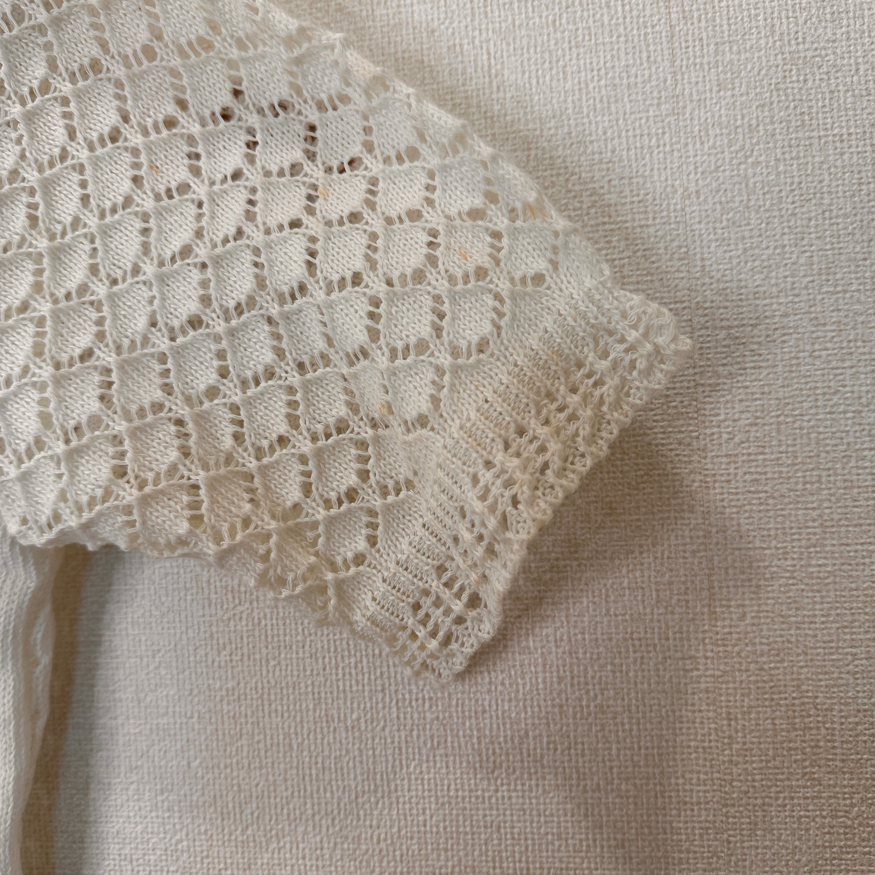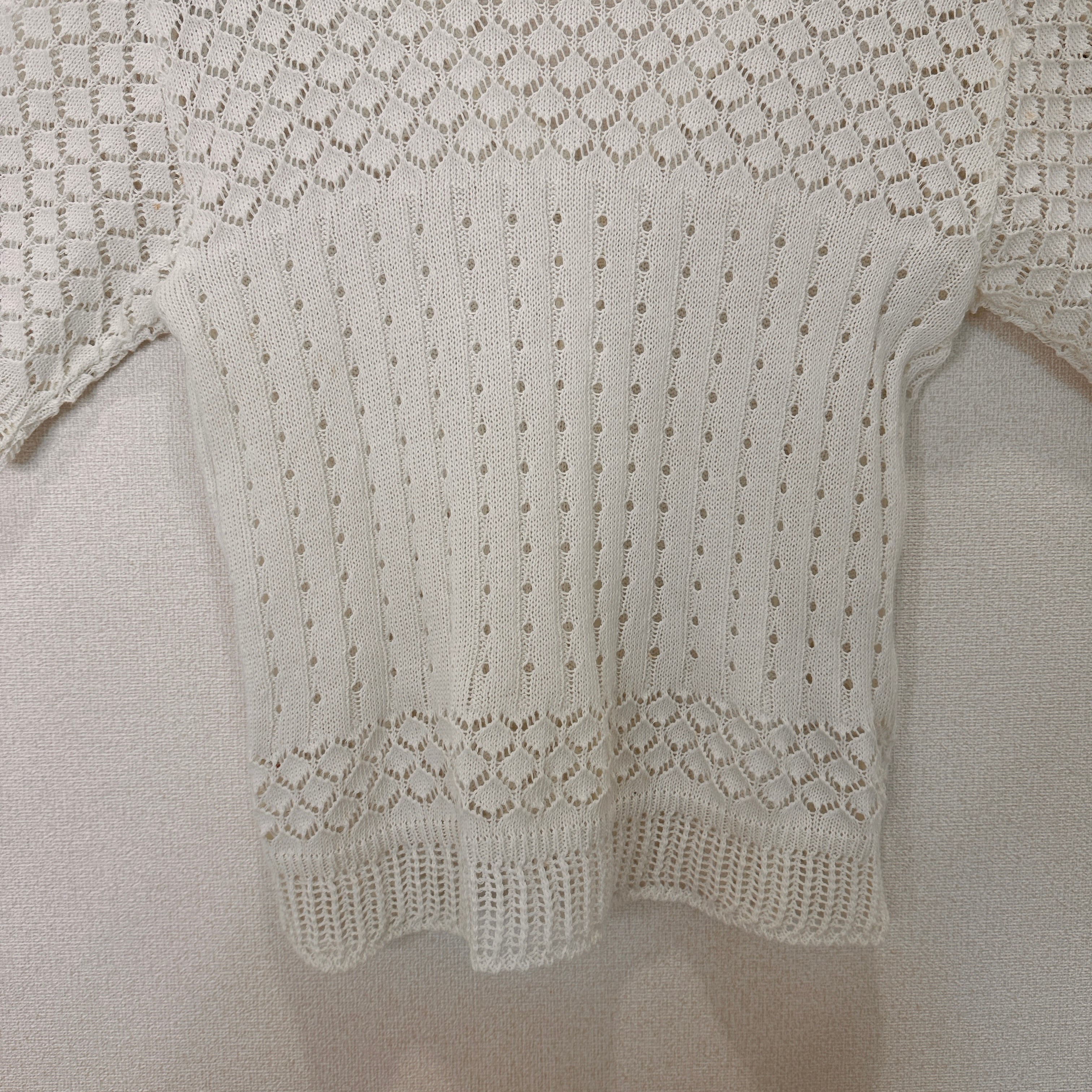 目立った傷や汚れはありませんが、中古品にご理解いただける方のみご購入をお願いいたします。レース編みのホワイトショートスリーブカーディガン。