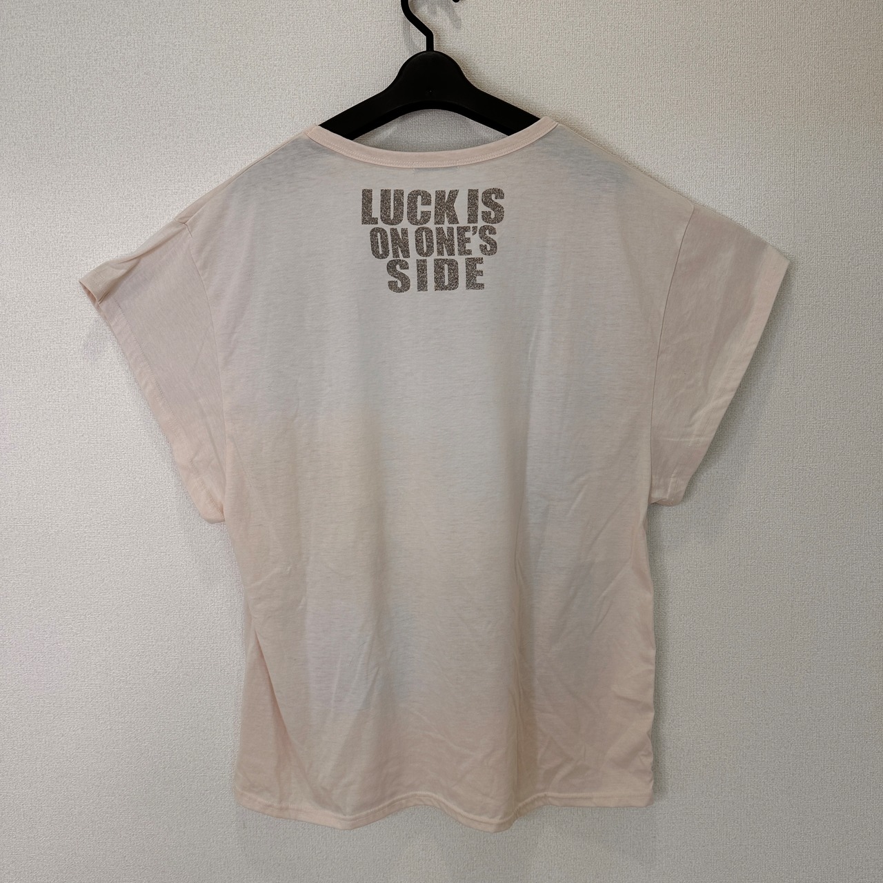 色は淡いピンクまたはベージュ系で、フロントに「LUCK SMILE OVER」、バックに「LUCK IS ON ONE'S SIDE」と、ラメまたはフロッキーのような質感のダークトーンのプリントが施されています。