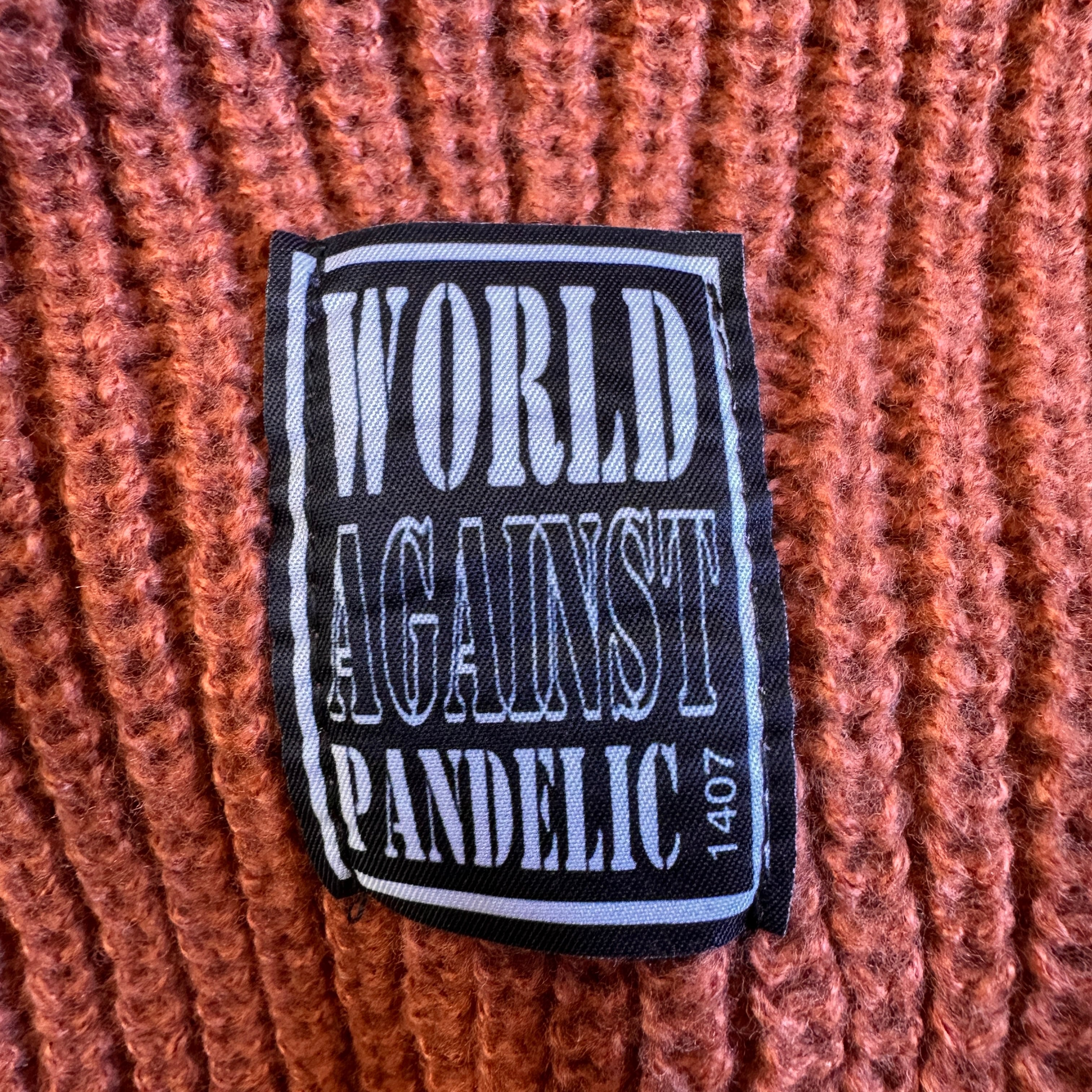 左裾付近には「WORLD AGAINST PANDELIC」と書かれたロゴタグが付いています。