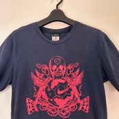 色はネイビーまたは濃いブルー系で、中央に蛍光ピンクのような赤系の色でスカル(ドクロ)やエンブレムをモチーフにしたような大胆なグラフィックがプリントされています。