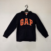 色はネイビー(紺)で、胸元にオレンジ色で大きく「GAP」のロゴがプリントされています。