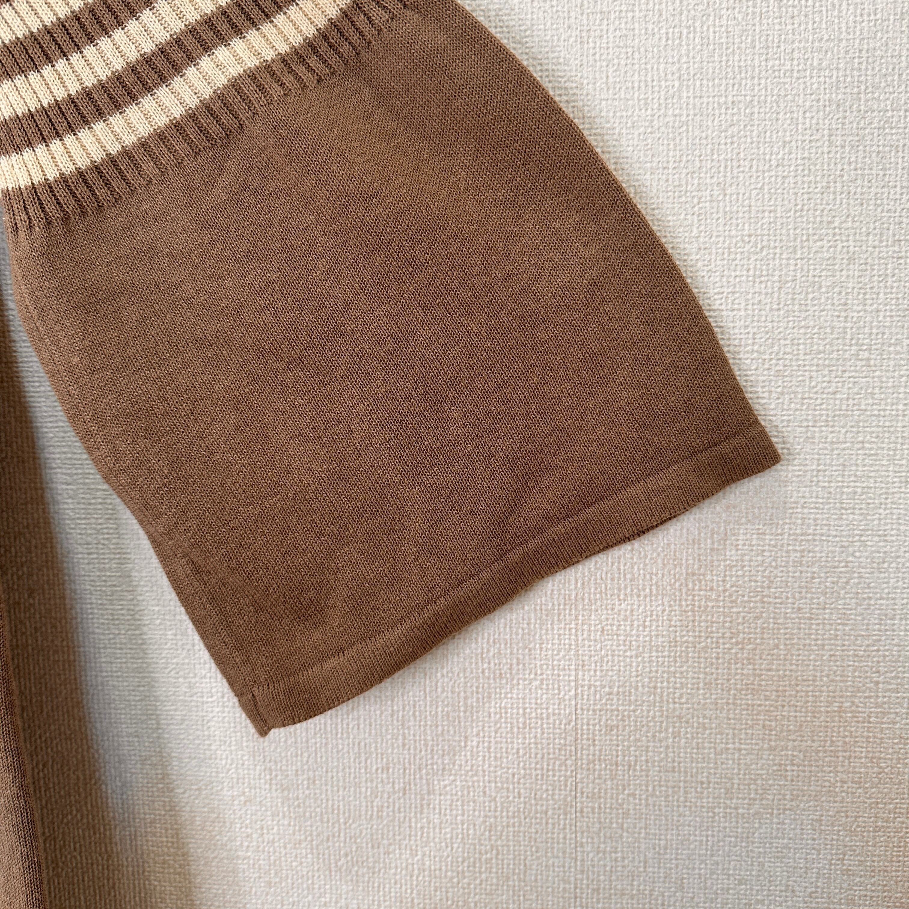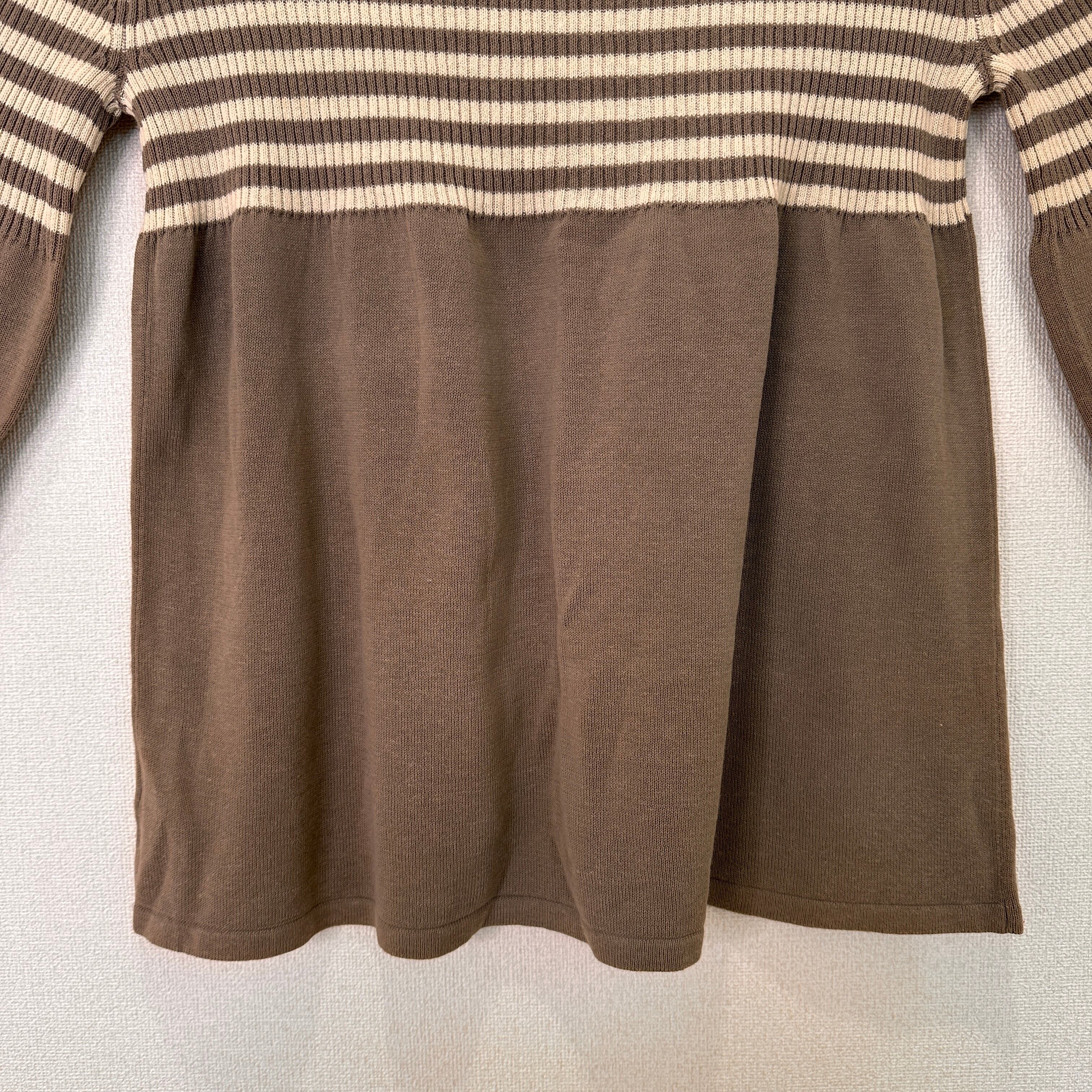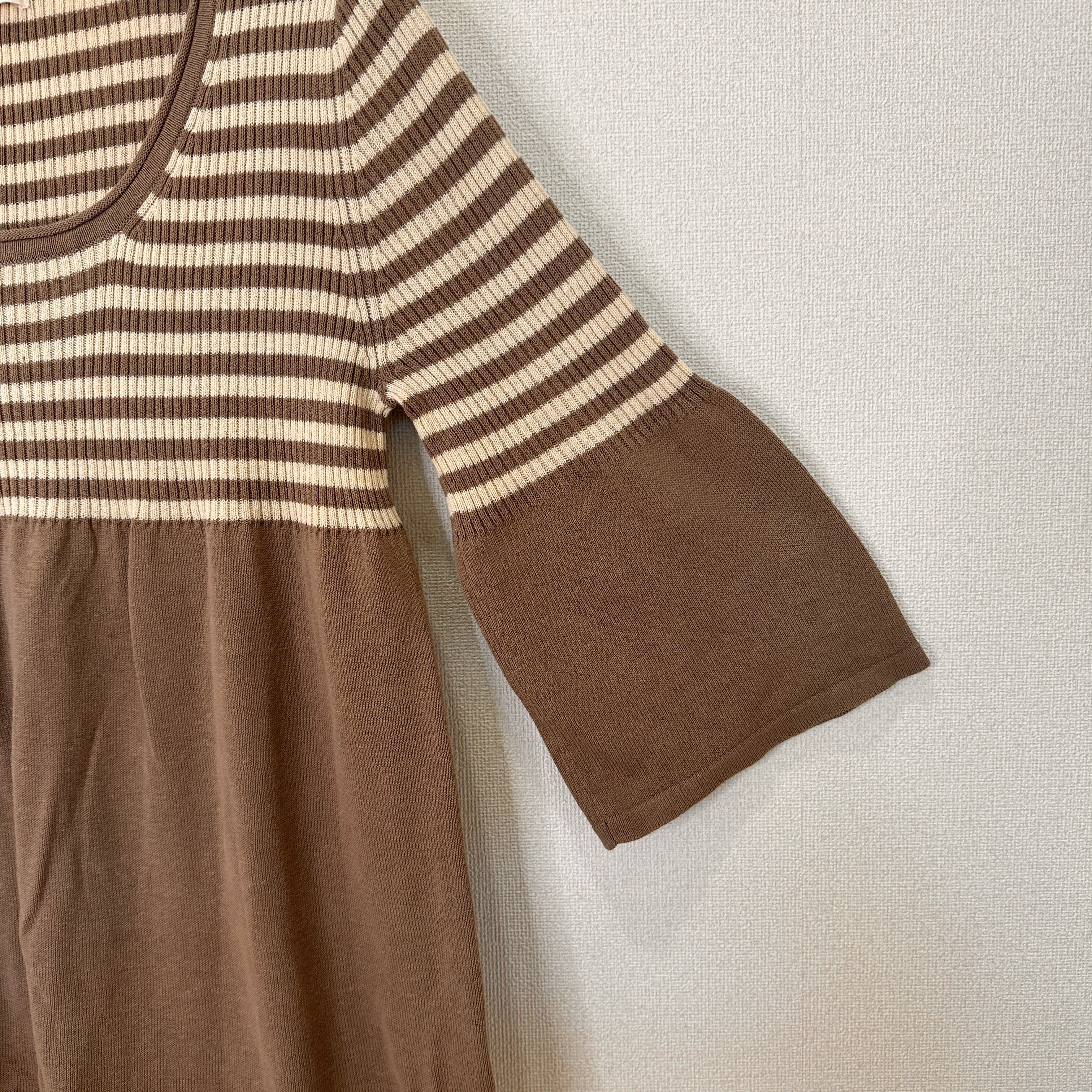 上身頃はリブ編みのボーダー柄(茶色と生成り色)、下身頃はブラウンの無地で、切り替え部分にギャザーが入った裾に向かって広がるフレアシルエットが特徴です。