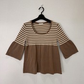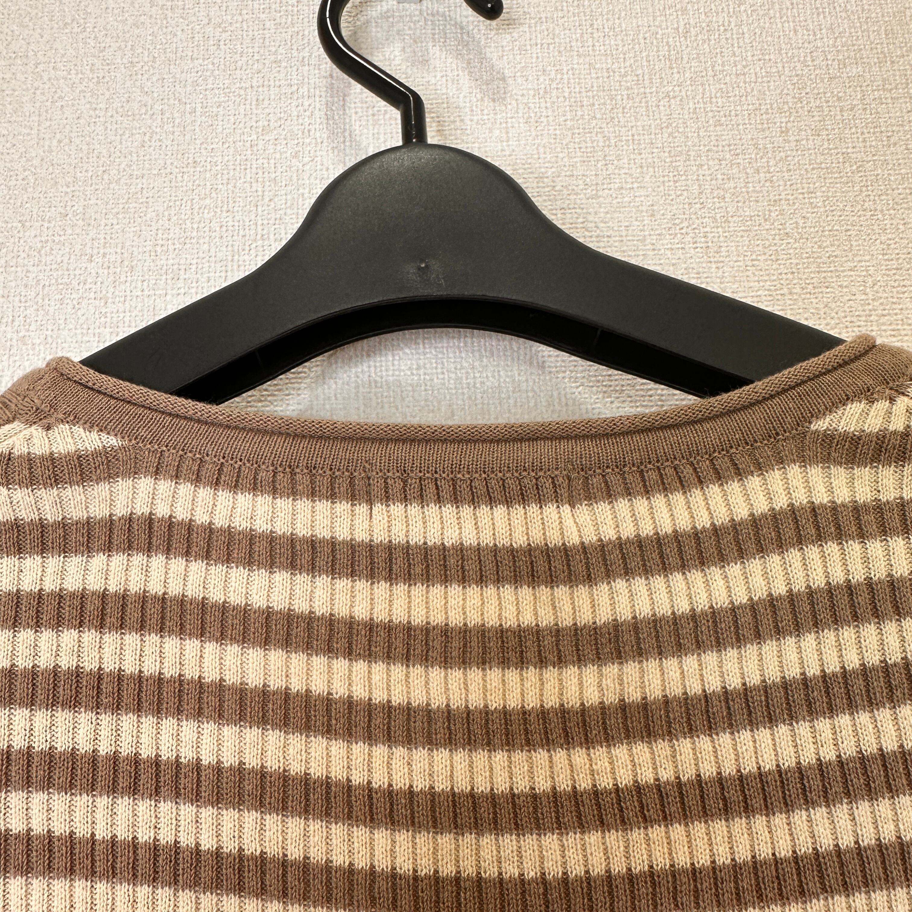 中古品であることをご理解の上、ご購入をお願いいたします。ブラウンとベージュのストライプデザインの五分袖トップス、スクエアネックが特徴。