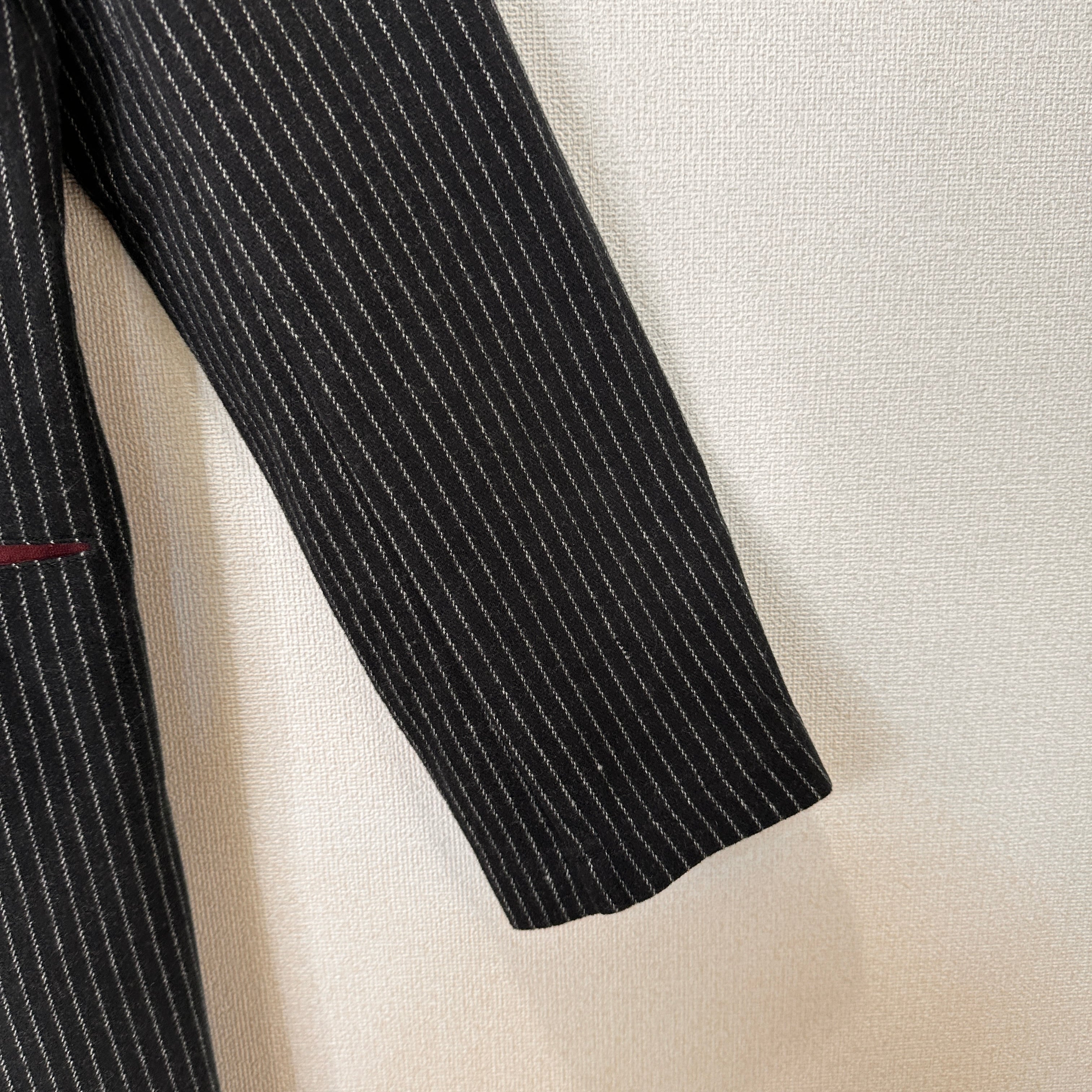ポケットの縁と襟裏(画像では見えにくいですが、ハンガー部分から見える色)にワインレッド/ボルドーのアクセントカラーが入っています。