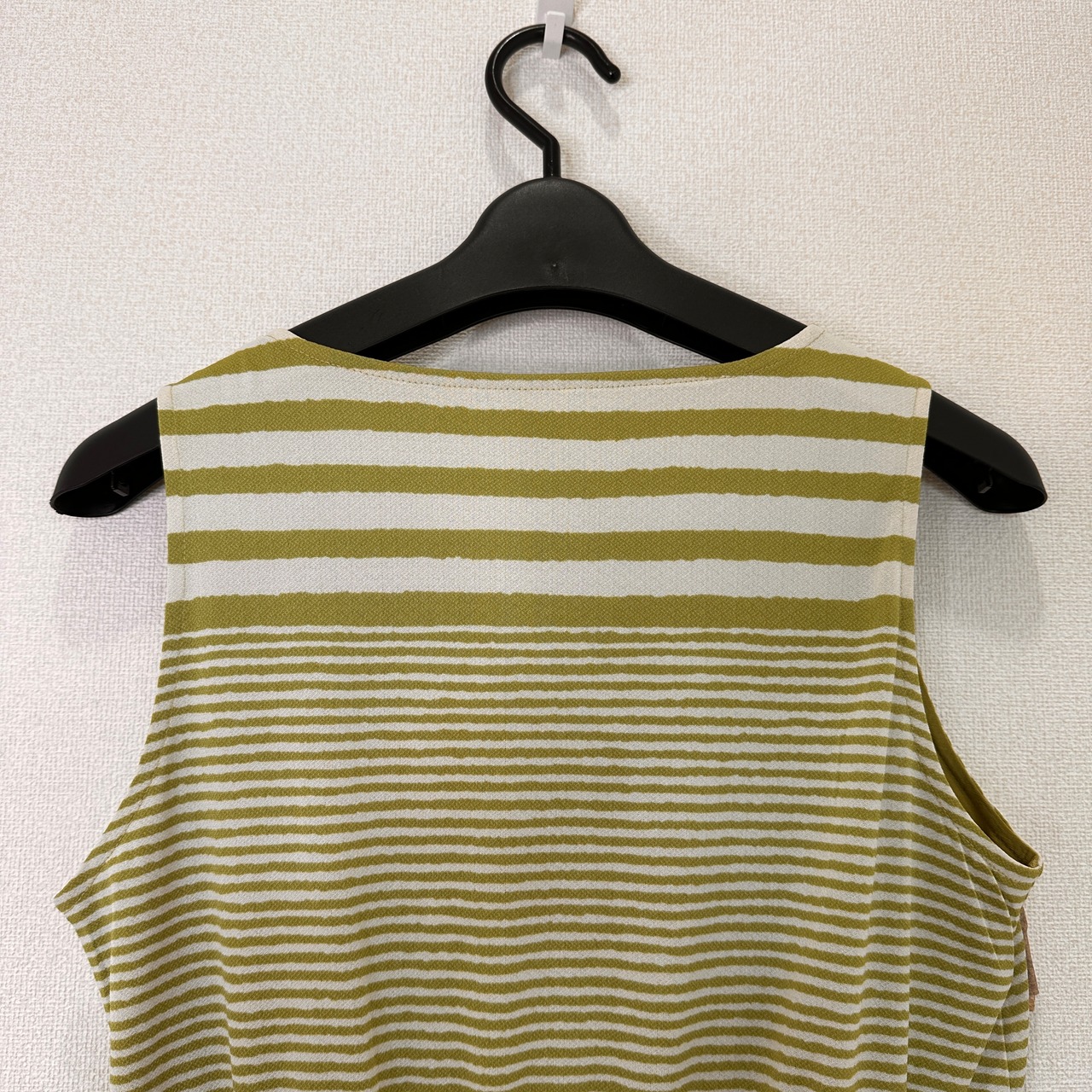 目立った傷や汚れはありませんが、中古品にご理解いただける方のみご購入をお願いいたします。ストライプデザインのオリーブグリーンノースリーブワンピース、ひざ丈で快適な着心地。