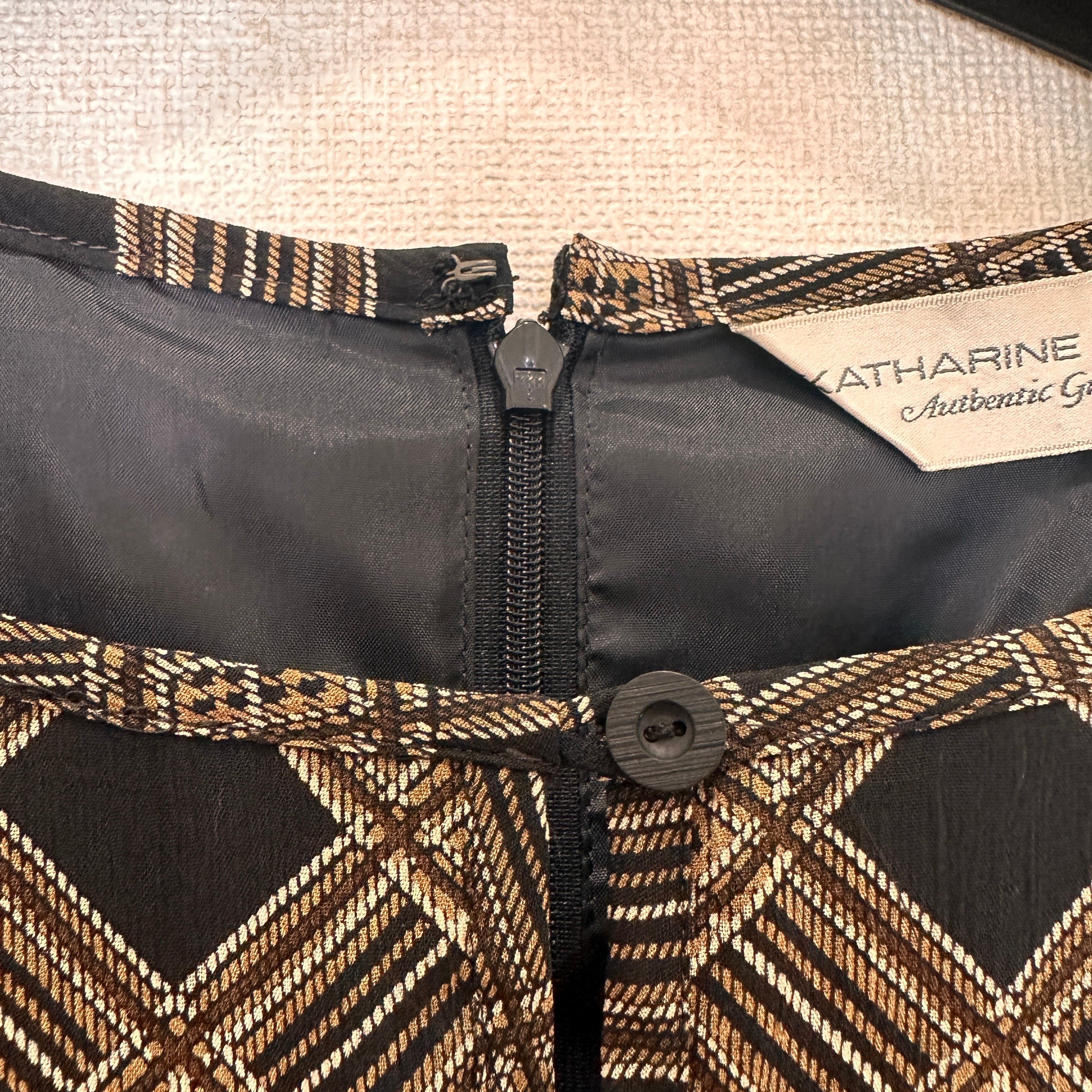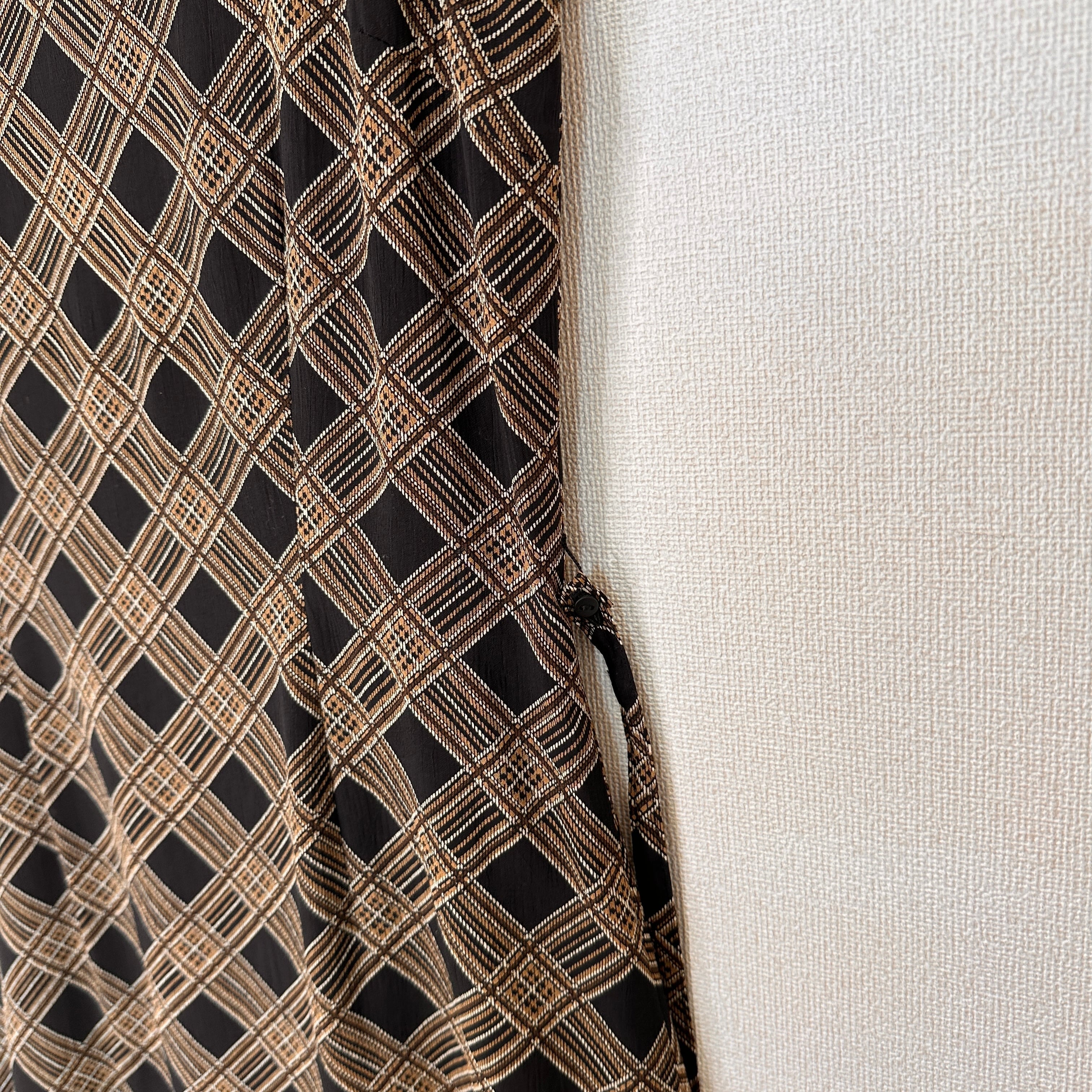 ブラックとゴールド/ブラウン系の糸で織られたような幾何学的なチェック柄が特徴的で、レトロでエレガントな雰囲気です。