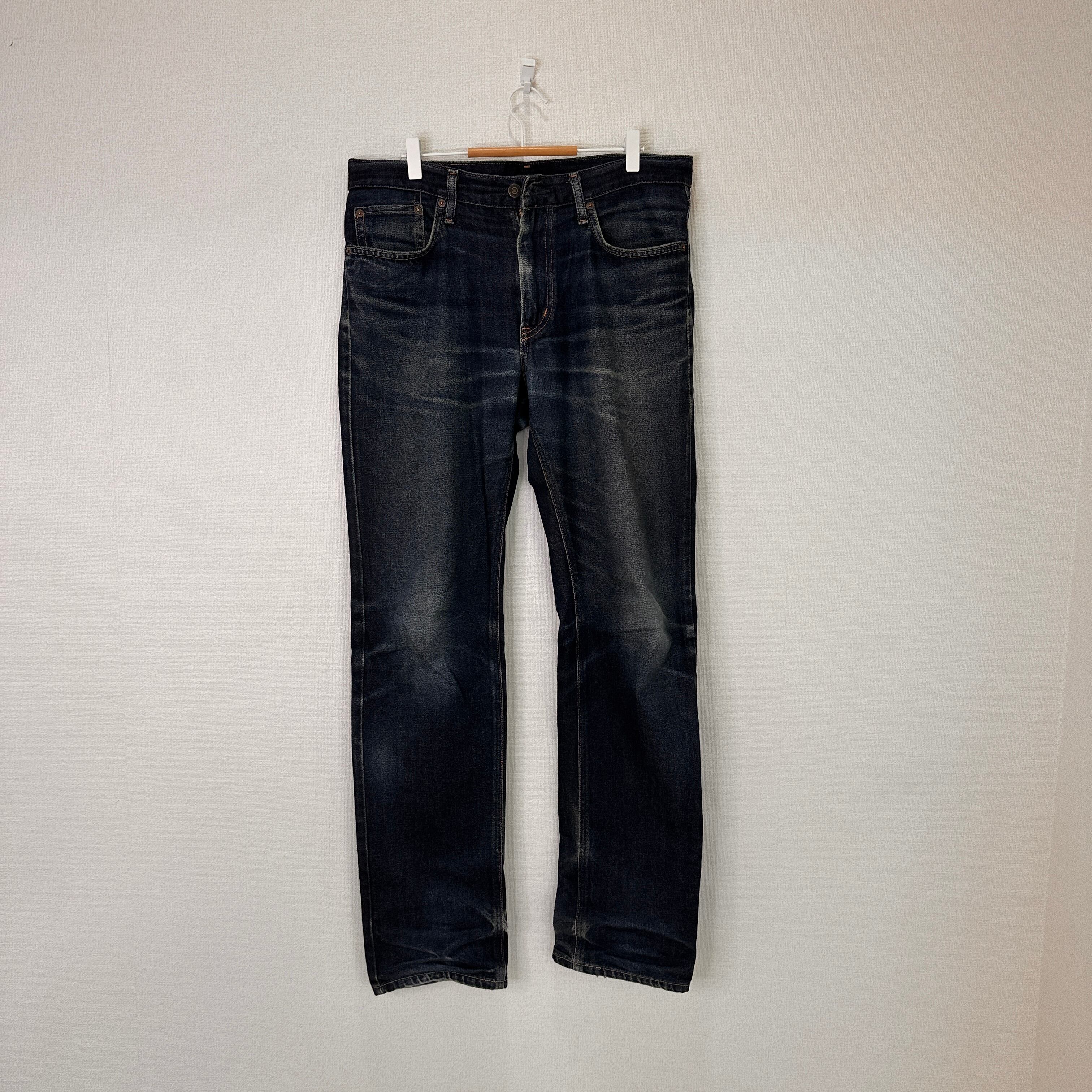 目立った傷や汚れはありませんが、右裾付近にほつれに(画像をご確認ください)、中古品特有の使用感(色落ちやアタリなど)がございます。