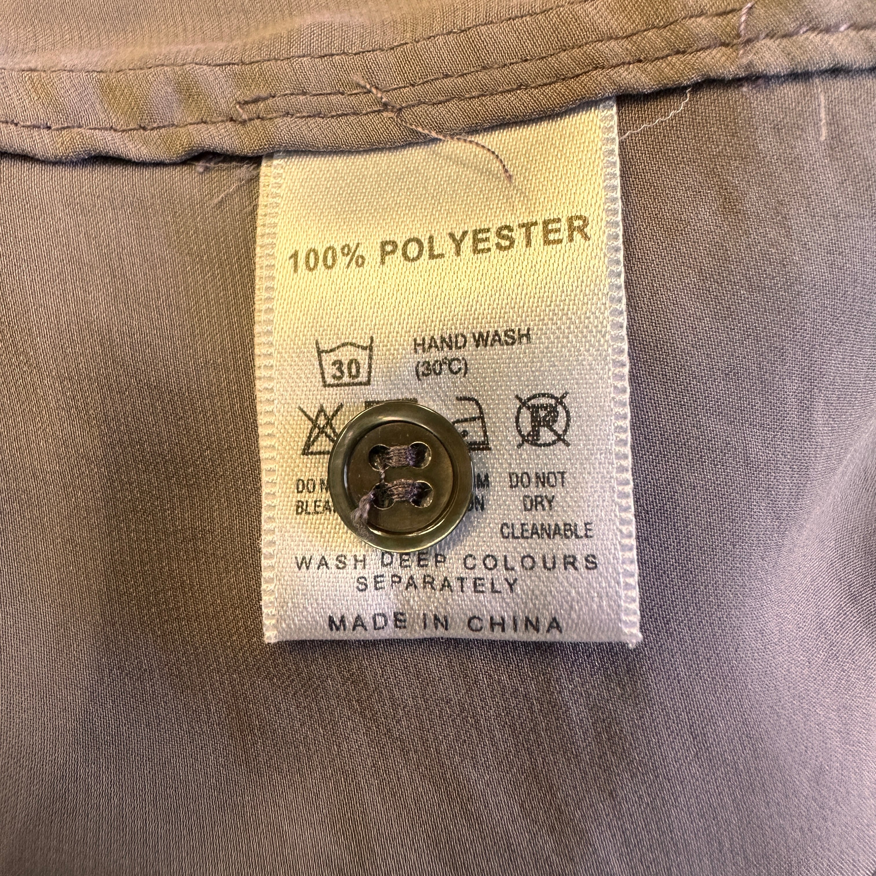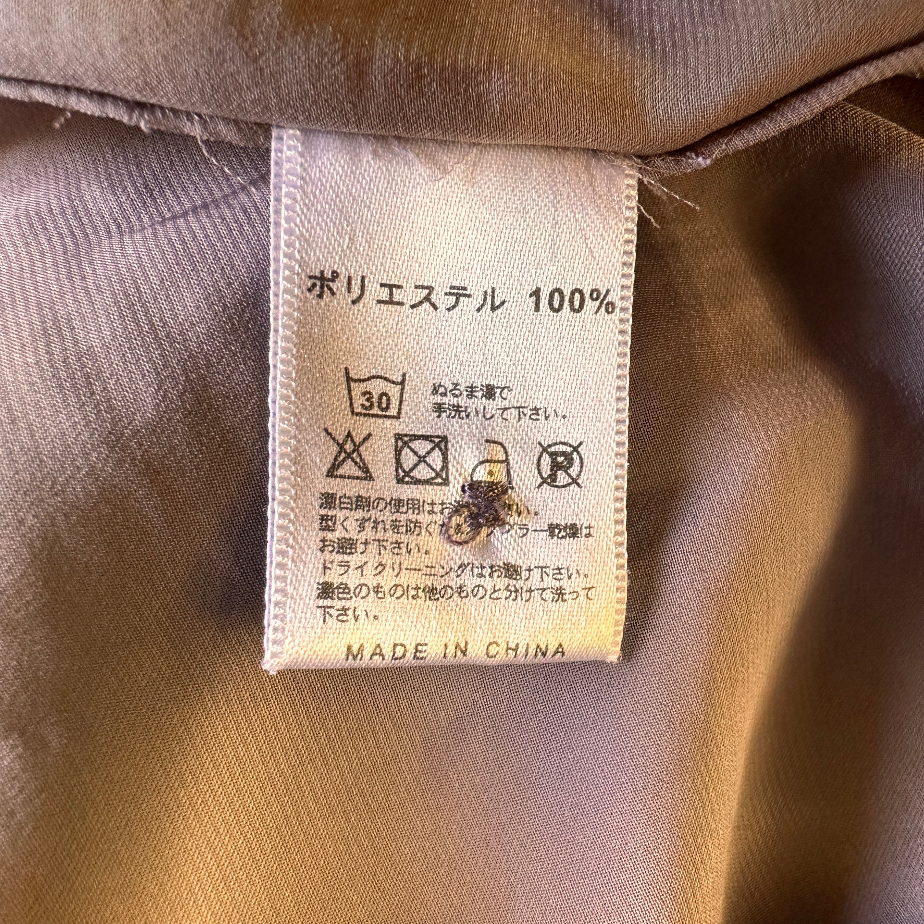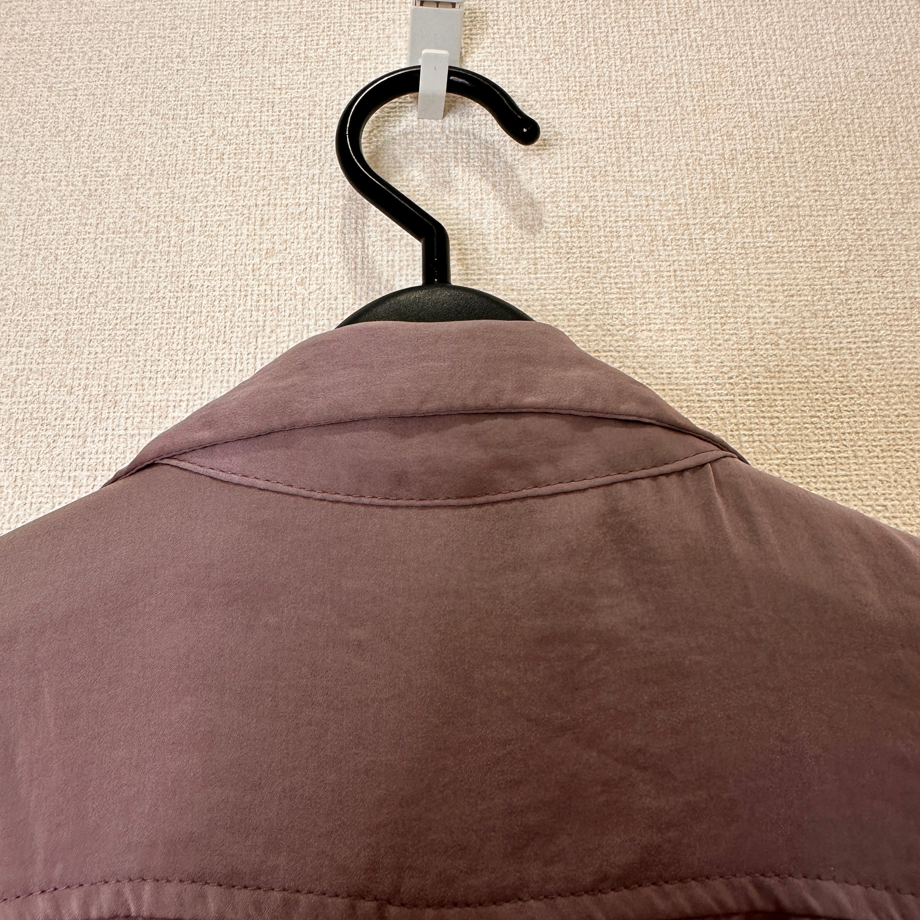 ややくすみのある上品なパープル(モーブ系)で、光沢感のあるポリエステル素材がドレッシーな印象を与えます。