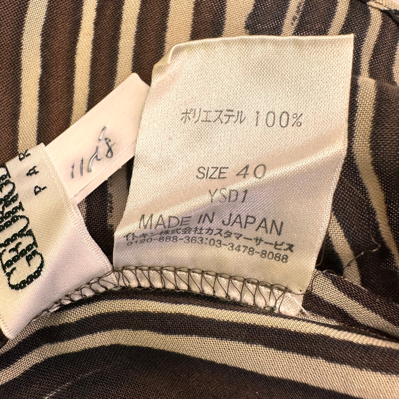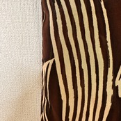 ブラウンとベージュ系のゼブラ柄またはアニマル柄のようなデザインで、シアー感のあるポリエステル100%素材が使用されています。