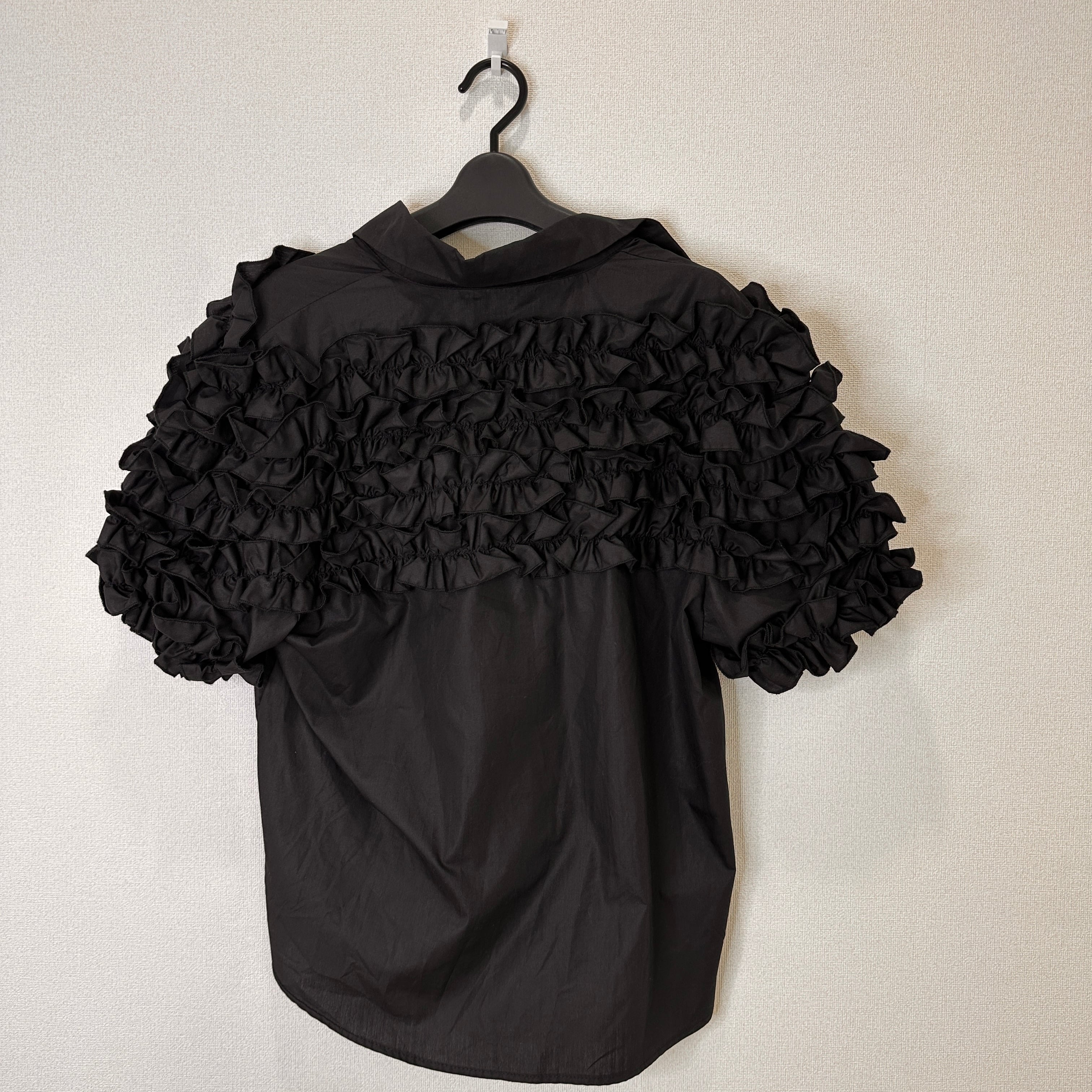 カラーはブラックで、肩から袖にかけて大胆なフリルがあしらわれたデザインが特徴です。